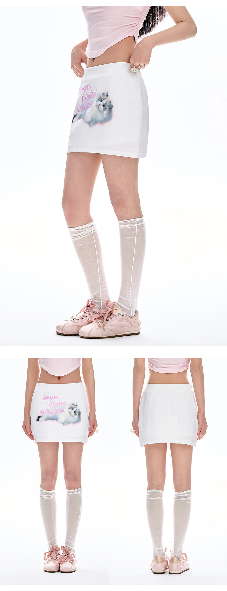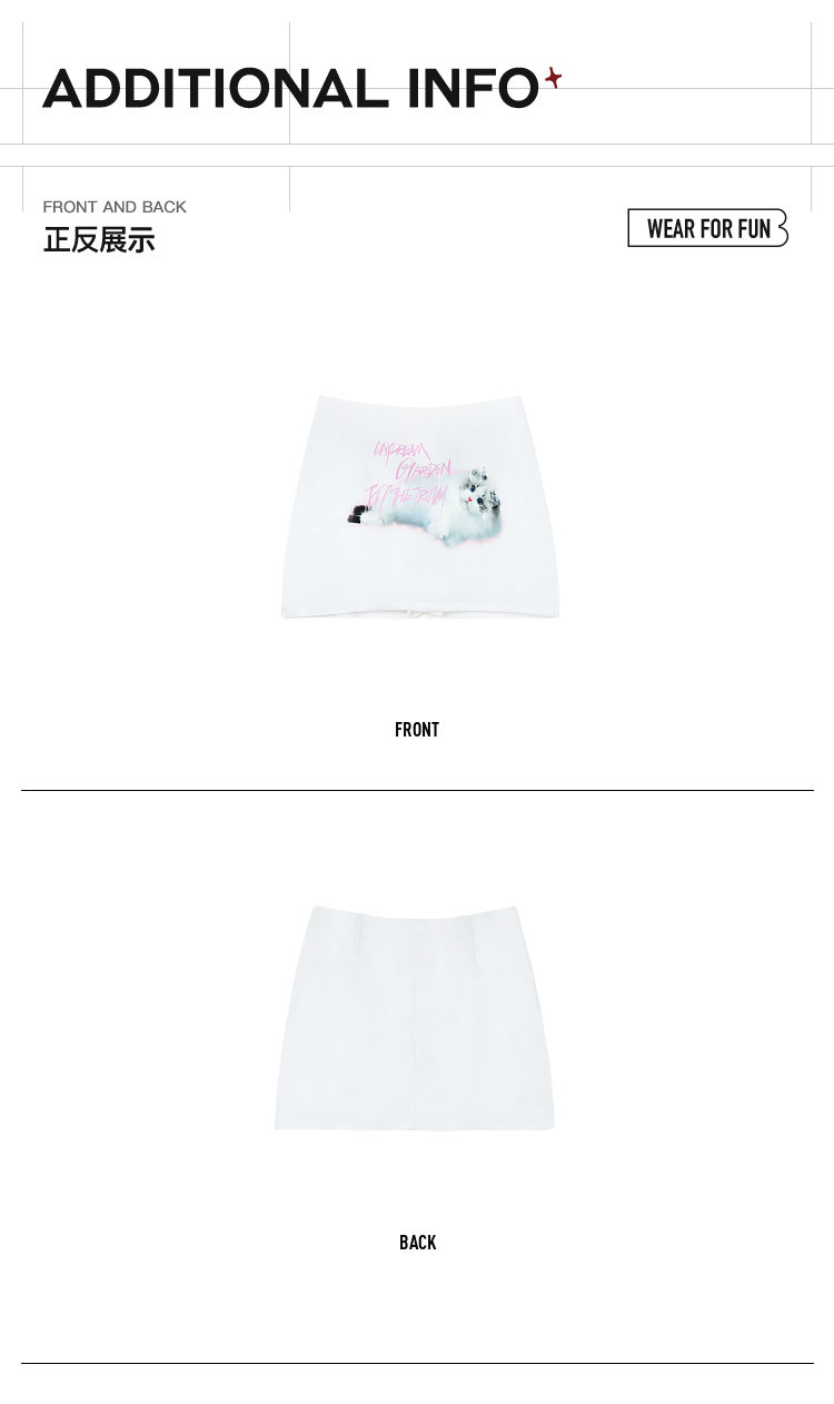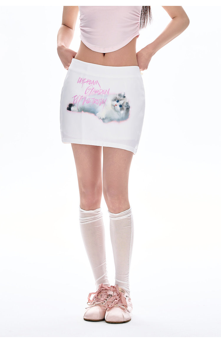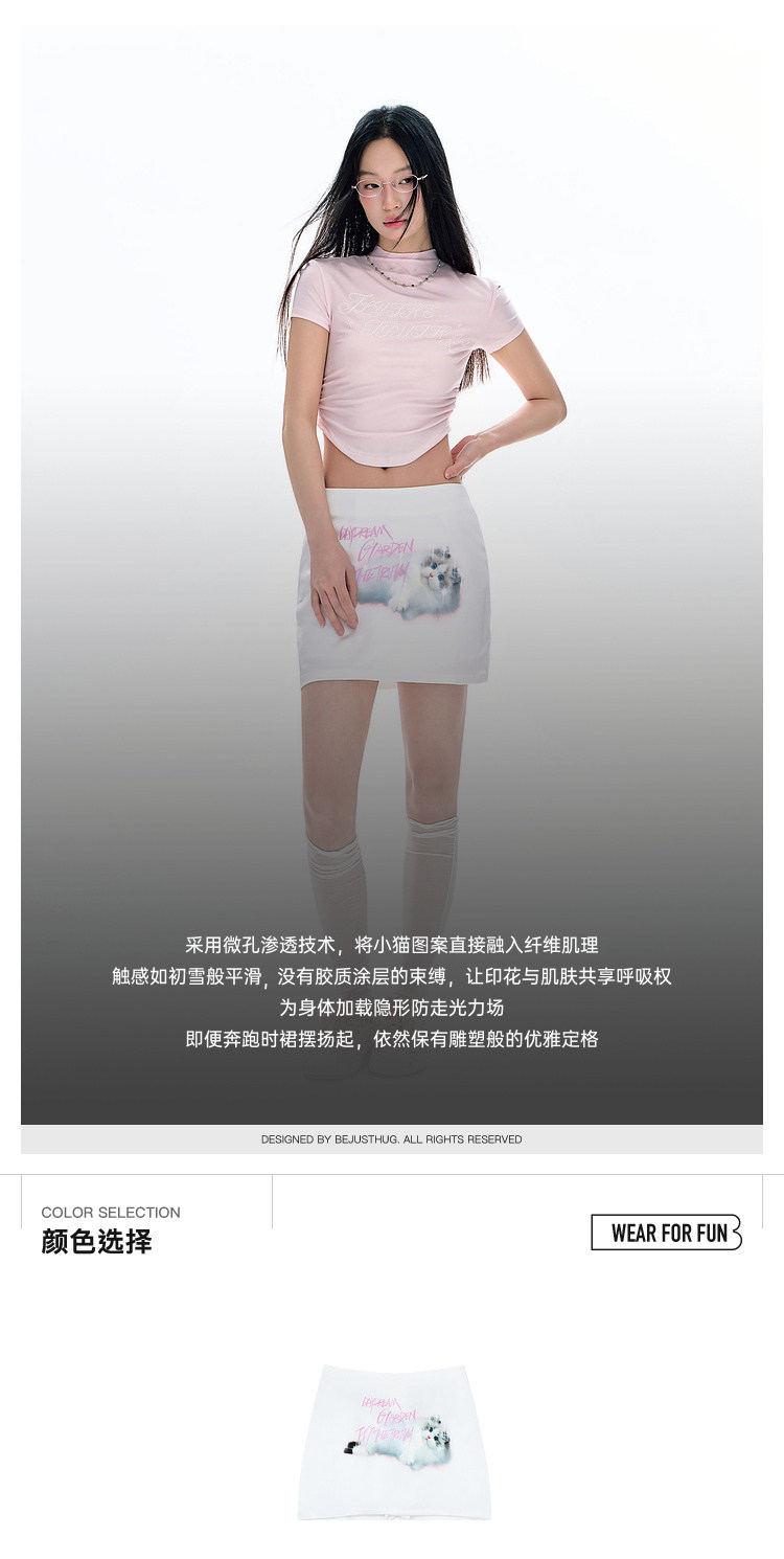 FTT Flythetruth 可爱猫咪印花短裙女夏季修身甜美白色包臀半身裙
