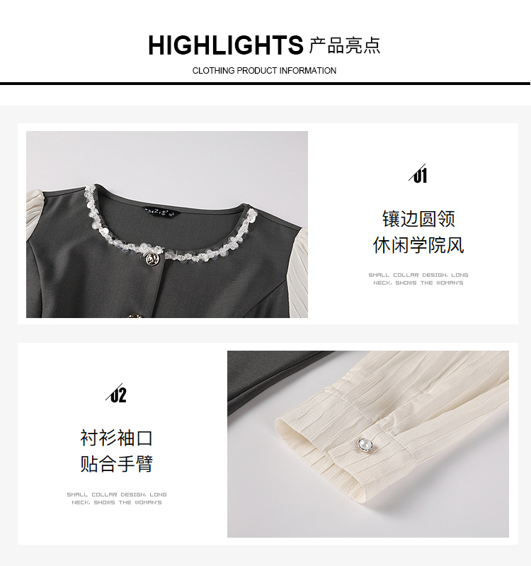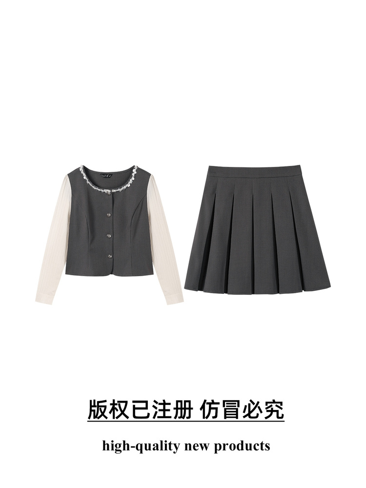 奢姿大码女装2025秋季时尚减龄亮钻撞色拼接上衣搭百褶裙两件套装9953993881AB