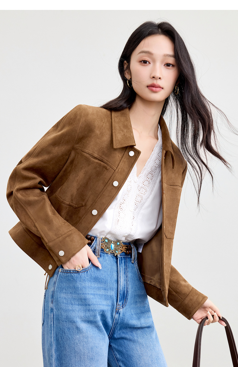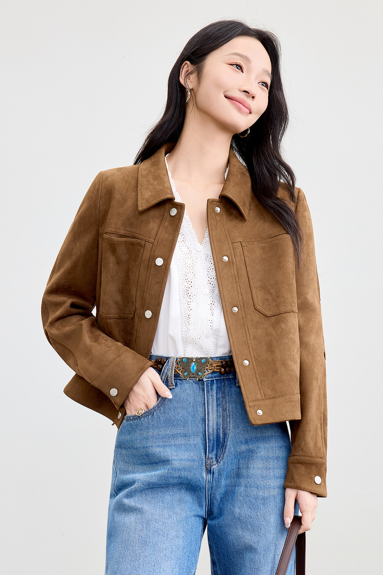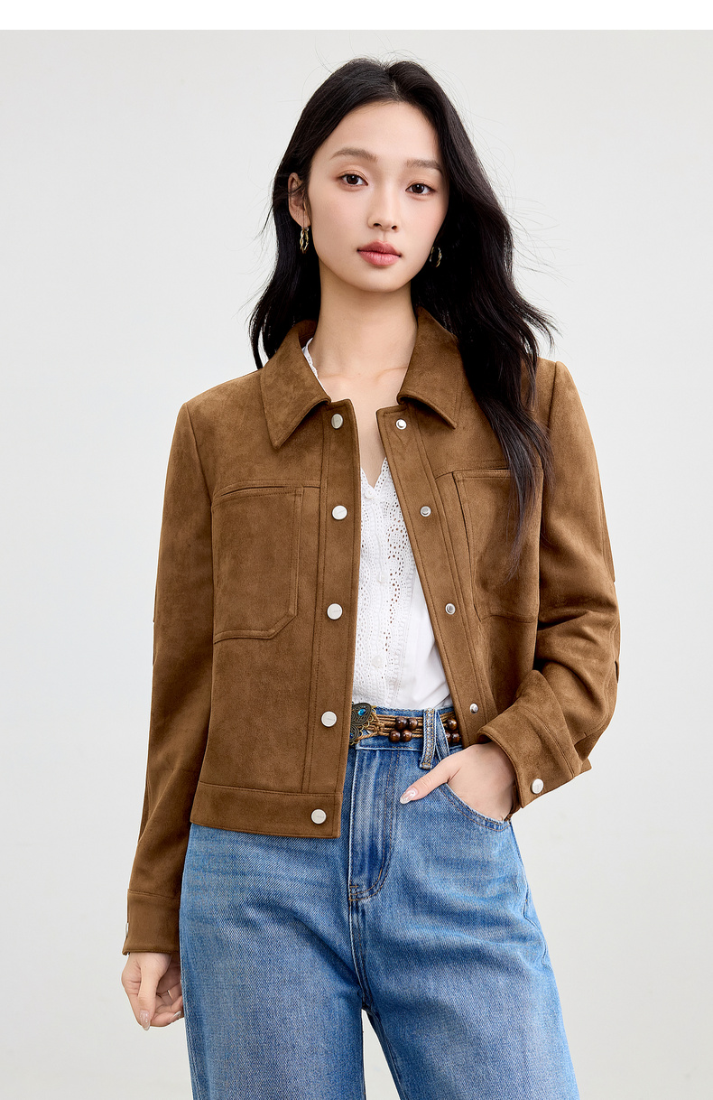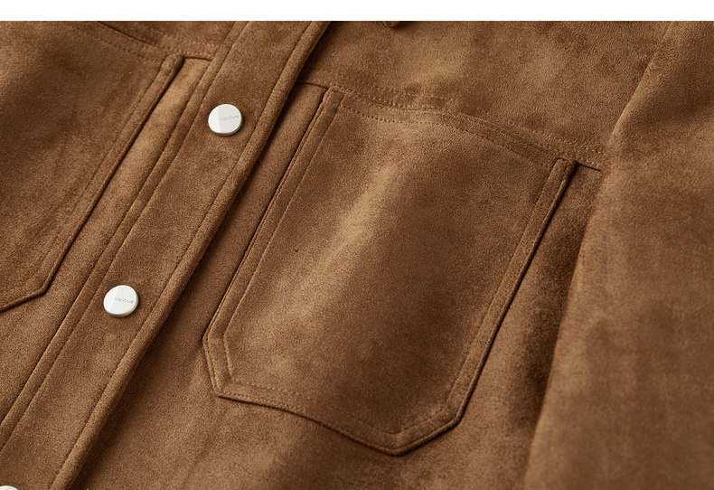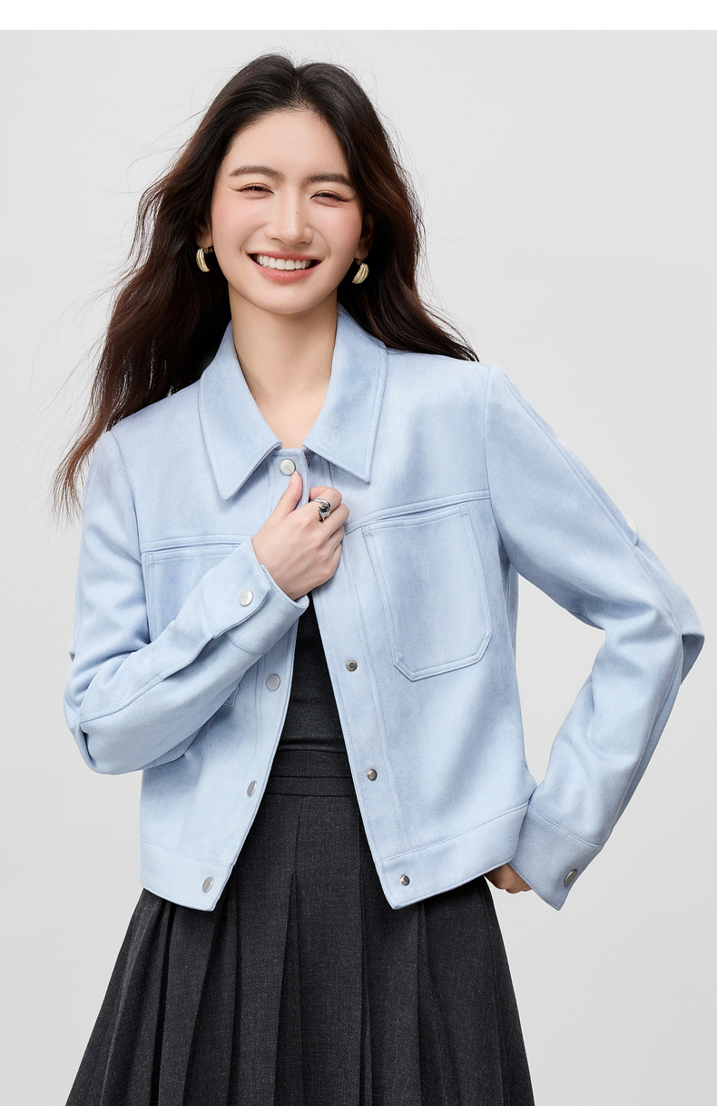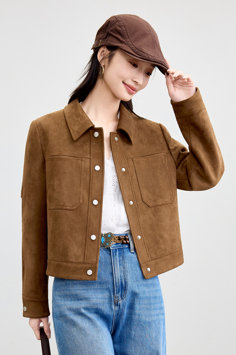 【内购】【量感捏褶】气质通勤翻领金属四合扣宽松显瘦长袖皮绒外套-153WB2594