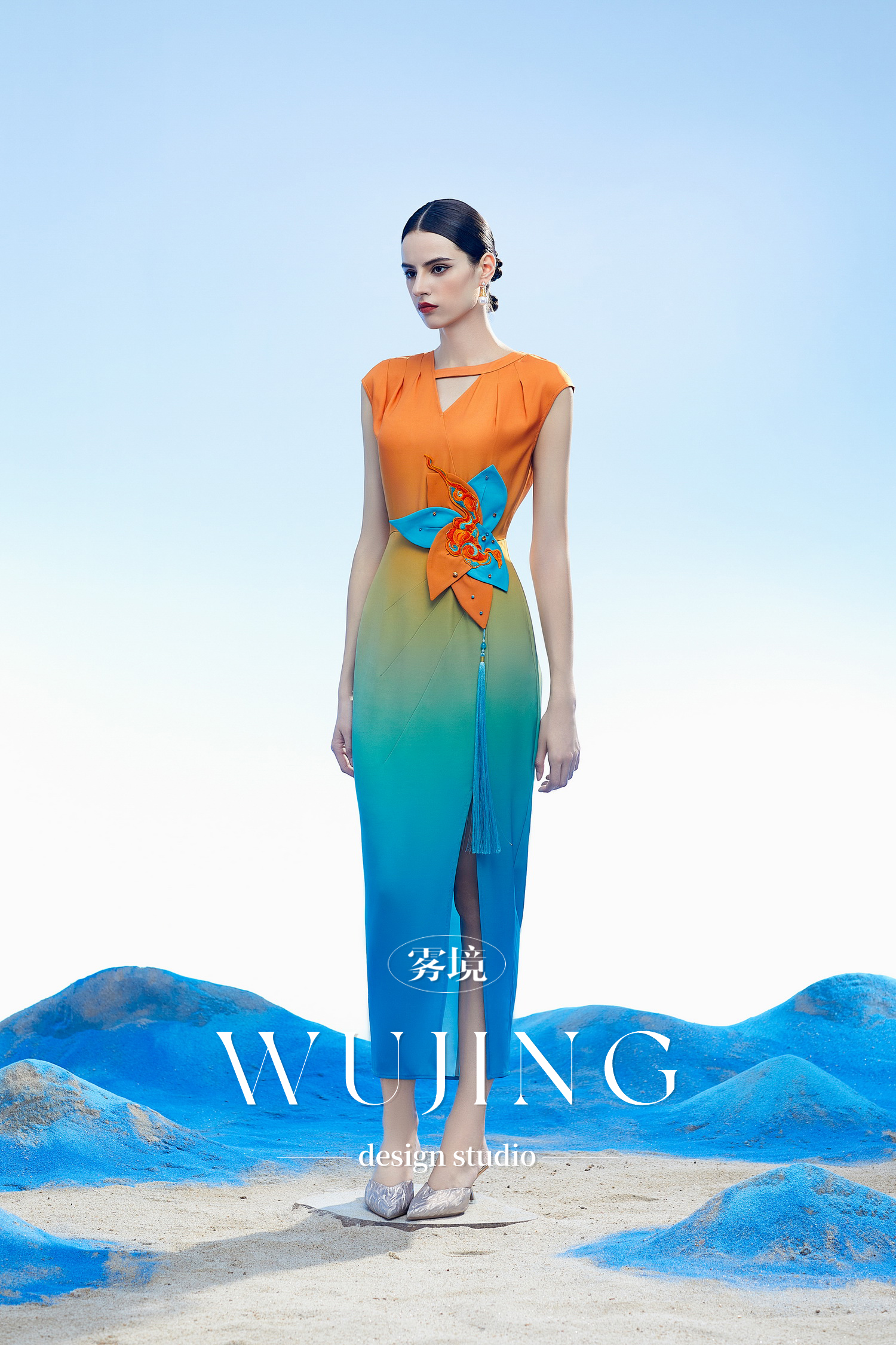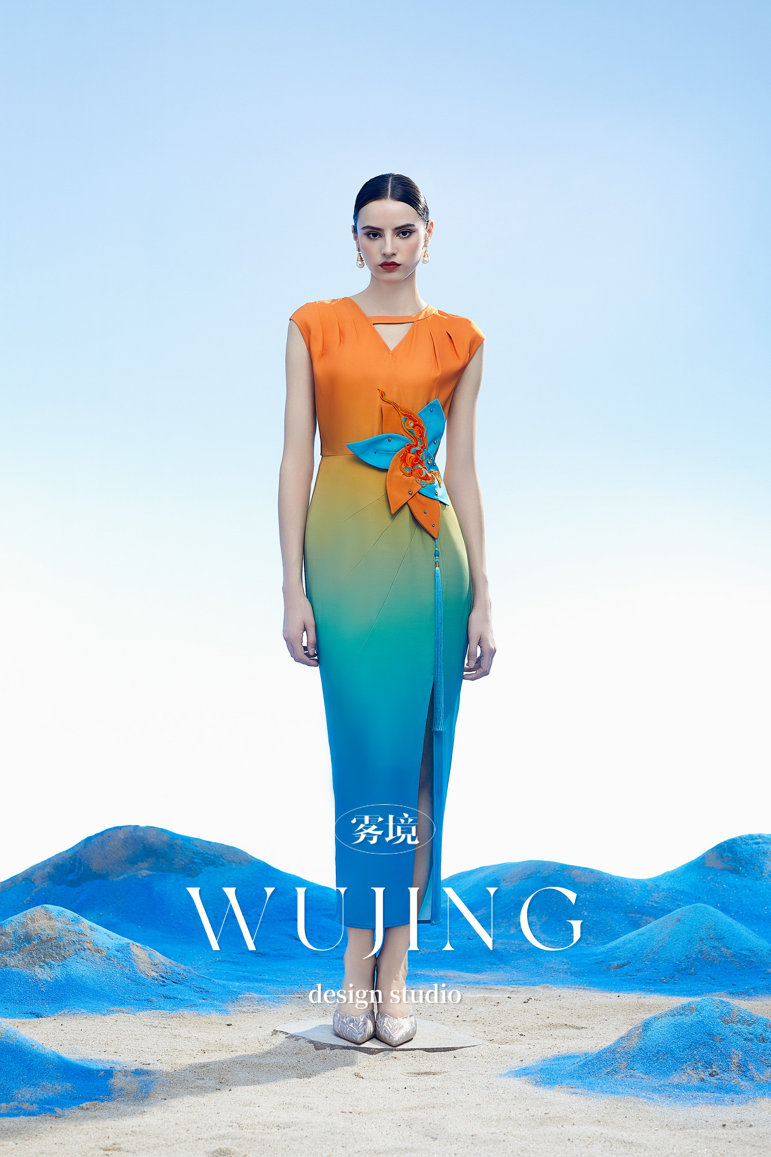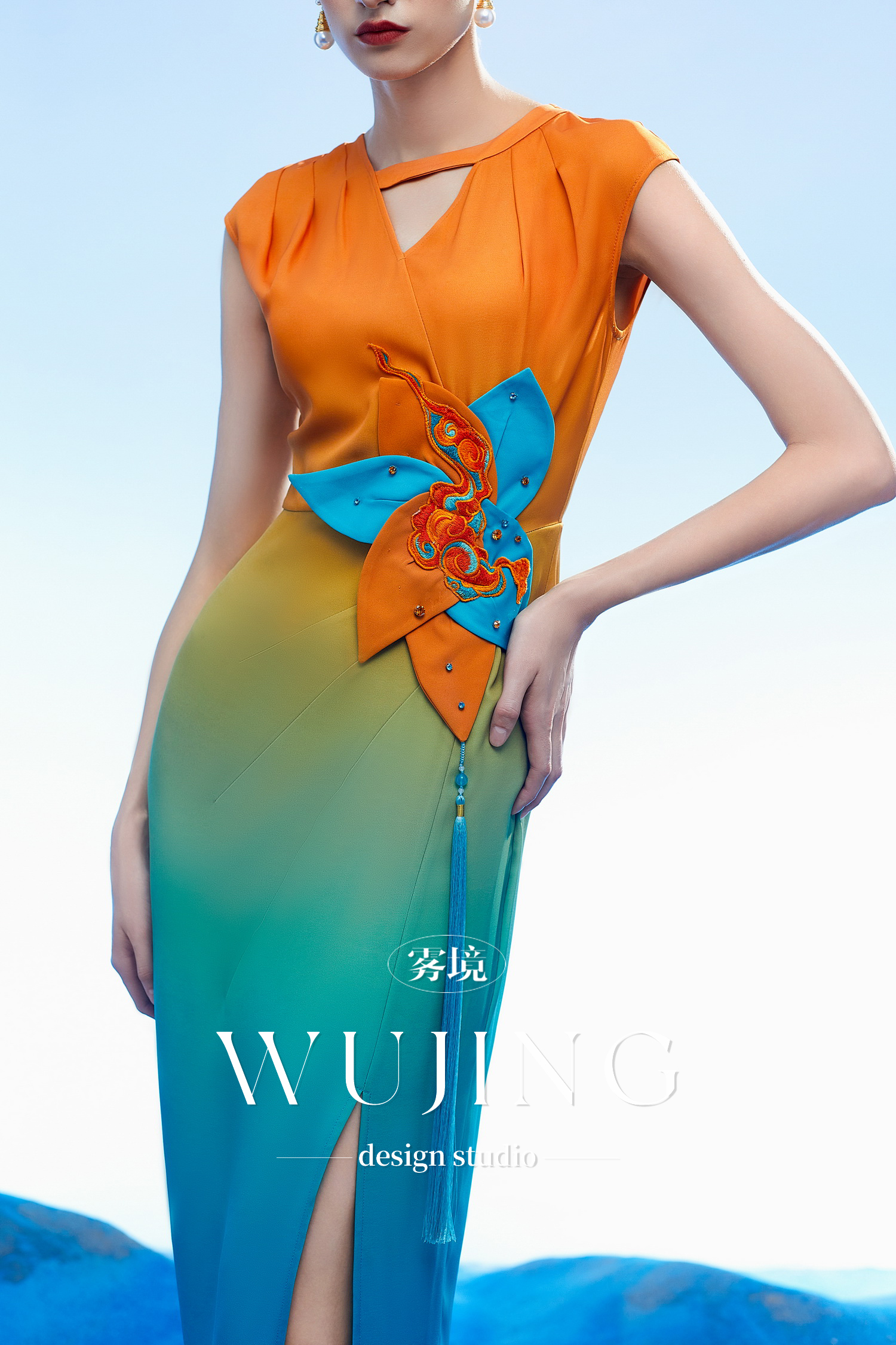 3204005 空桑秘境 韩国进口水晶乔其纱进口纹理蜂窝缎连衣裙 雾境