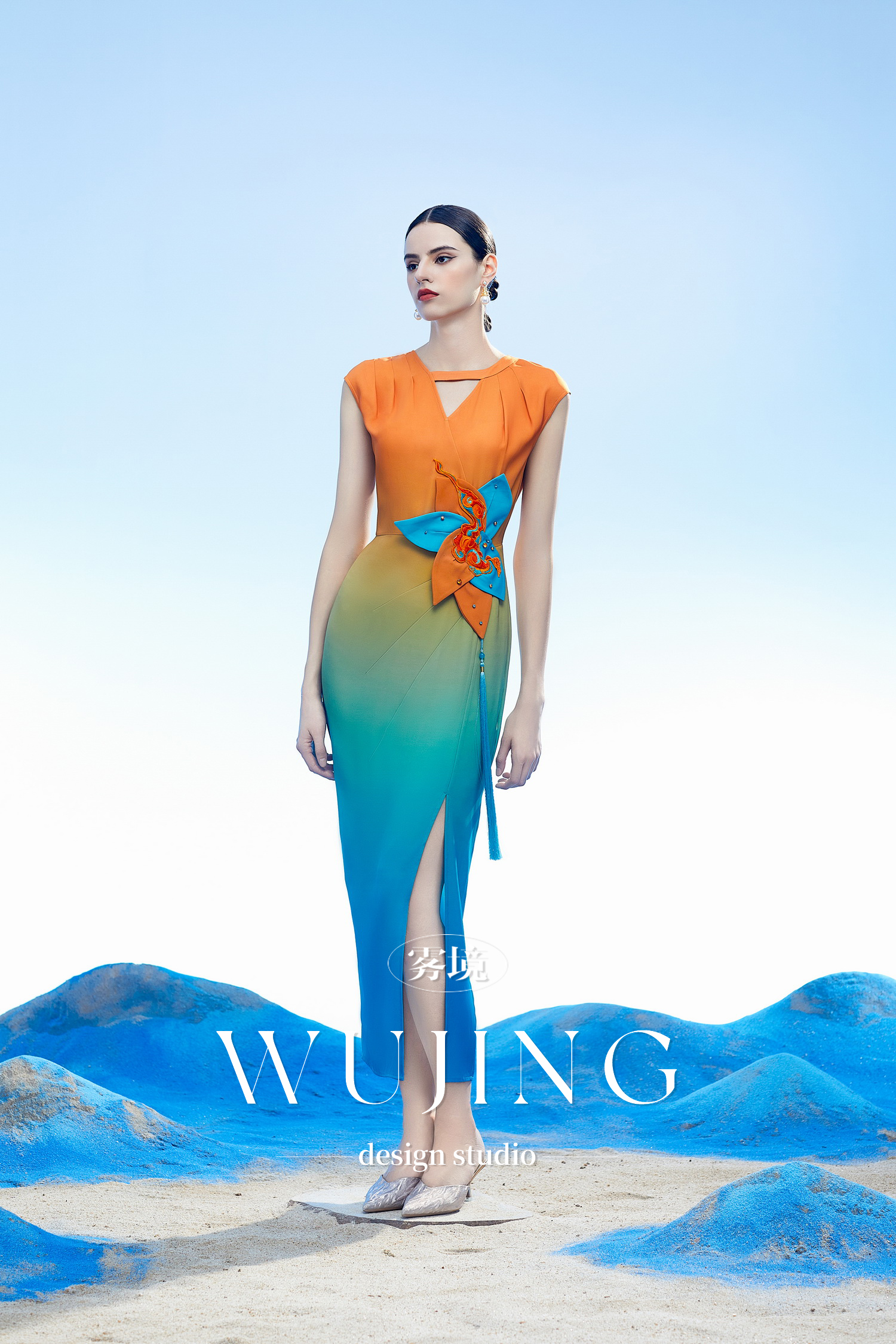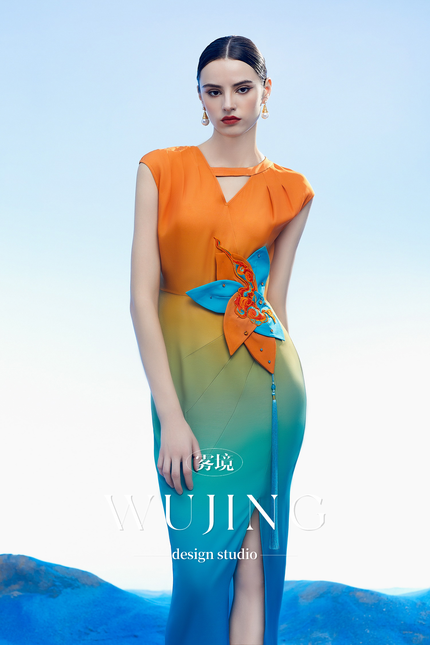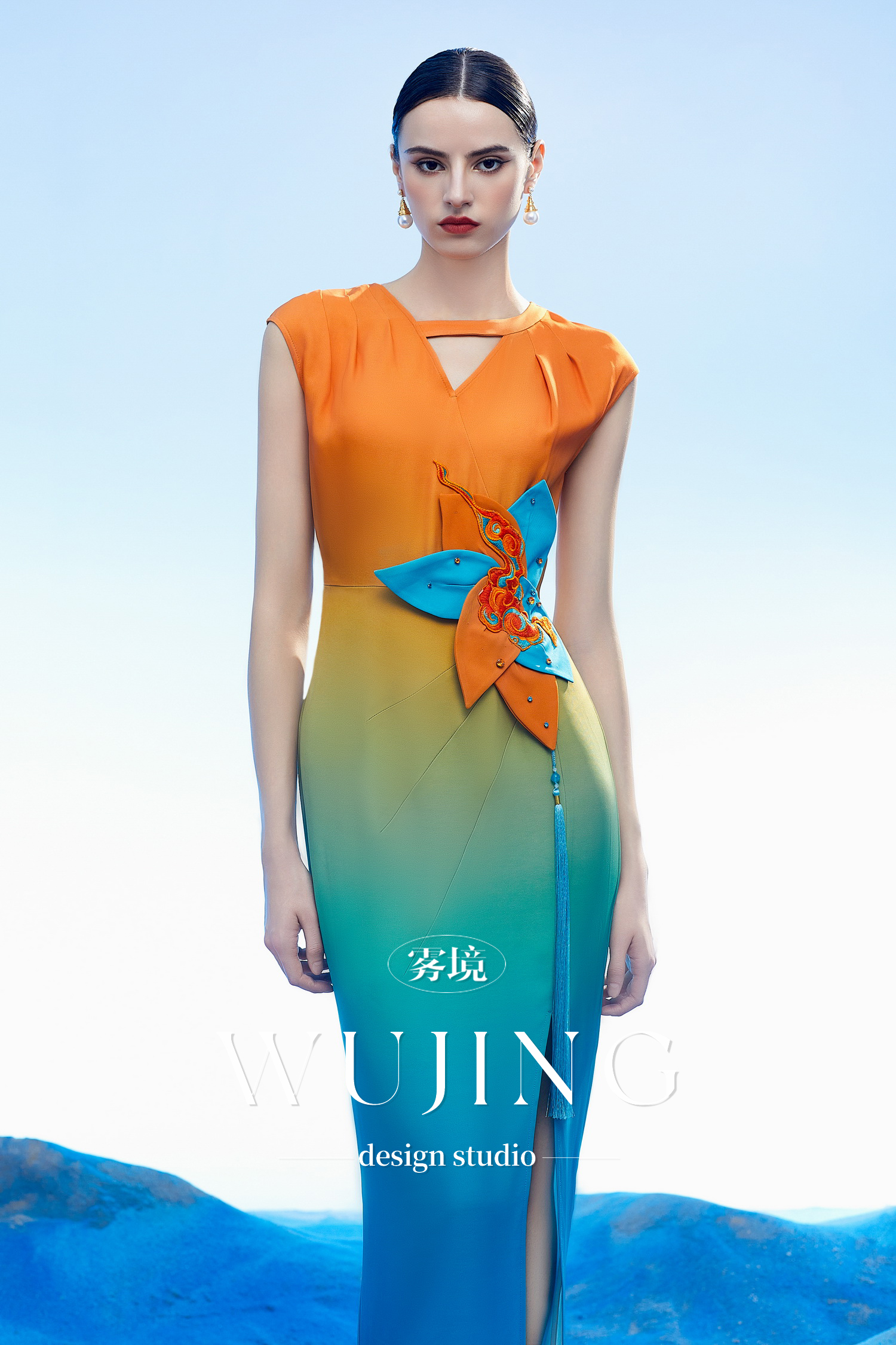 3204005 空桑秘境 韩国进口水晶乔其纱进口纹理蜂窝缎连衣裙 雾境