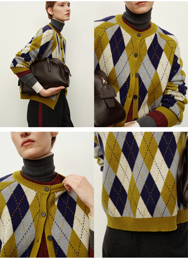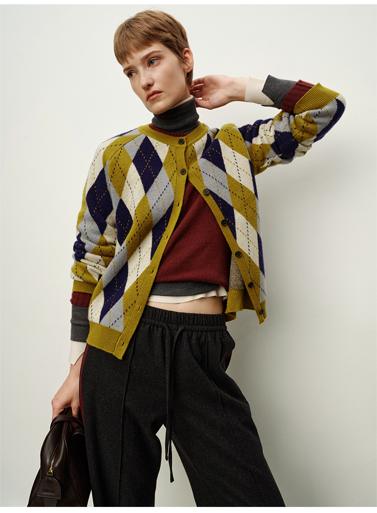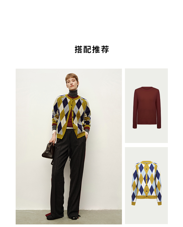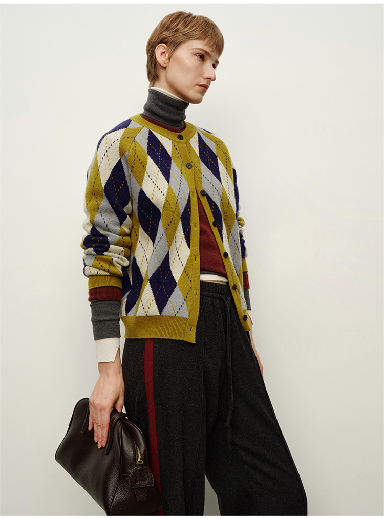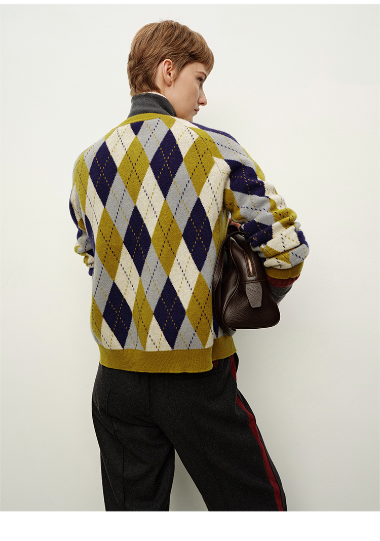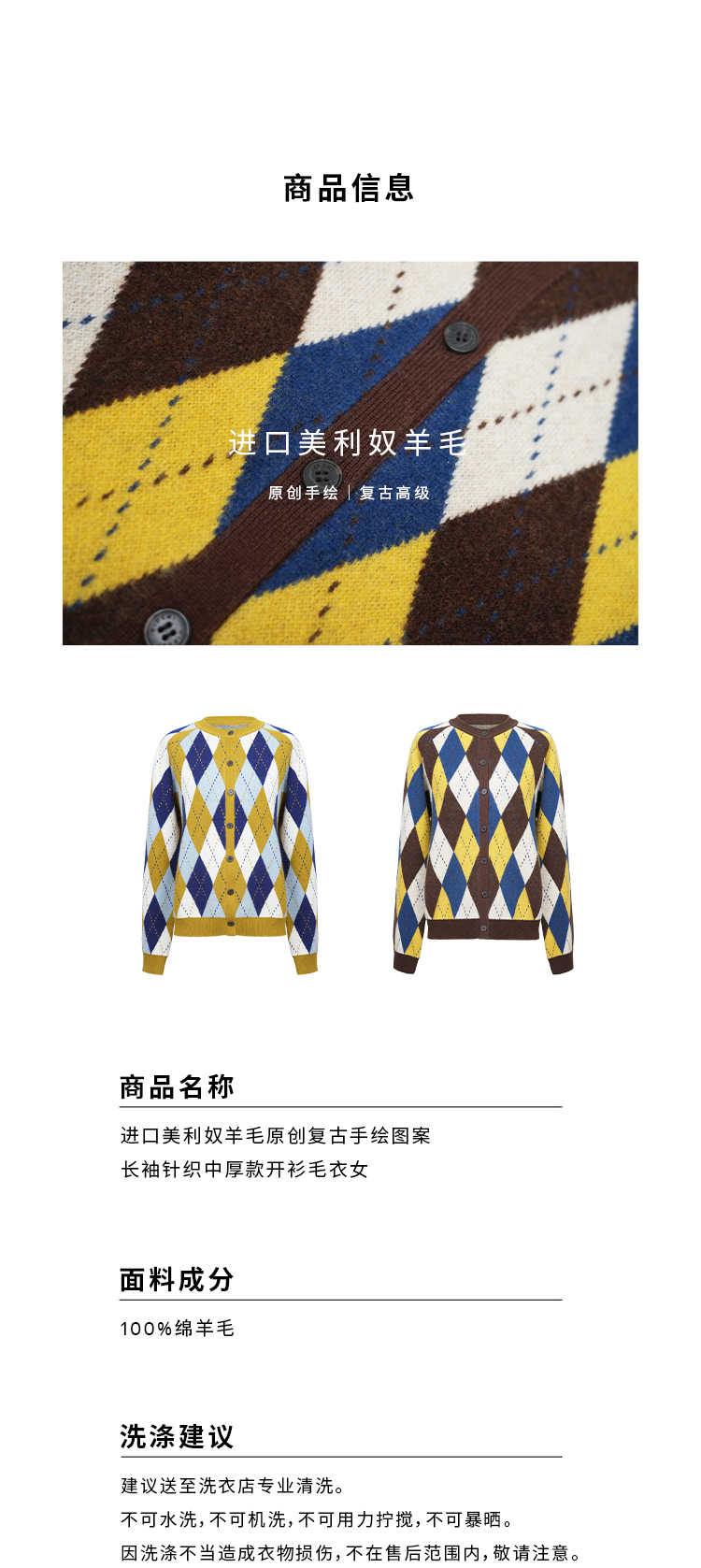 HIDEMI 进口美利奴羊毛原创复古手绘图案长袖针织中厚款开衫毛衣女