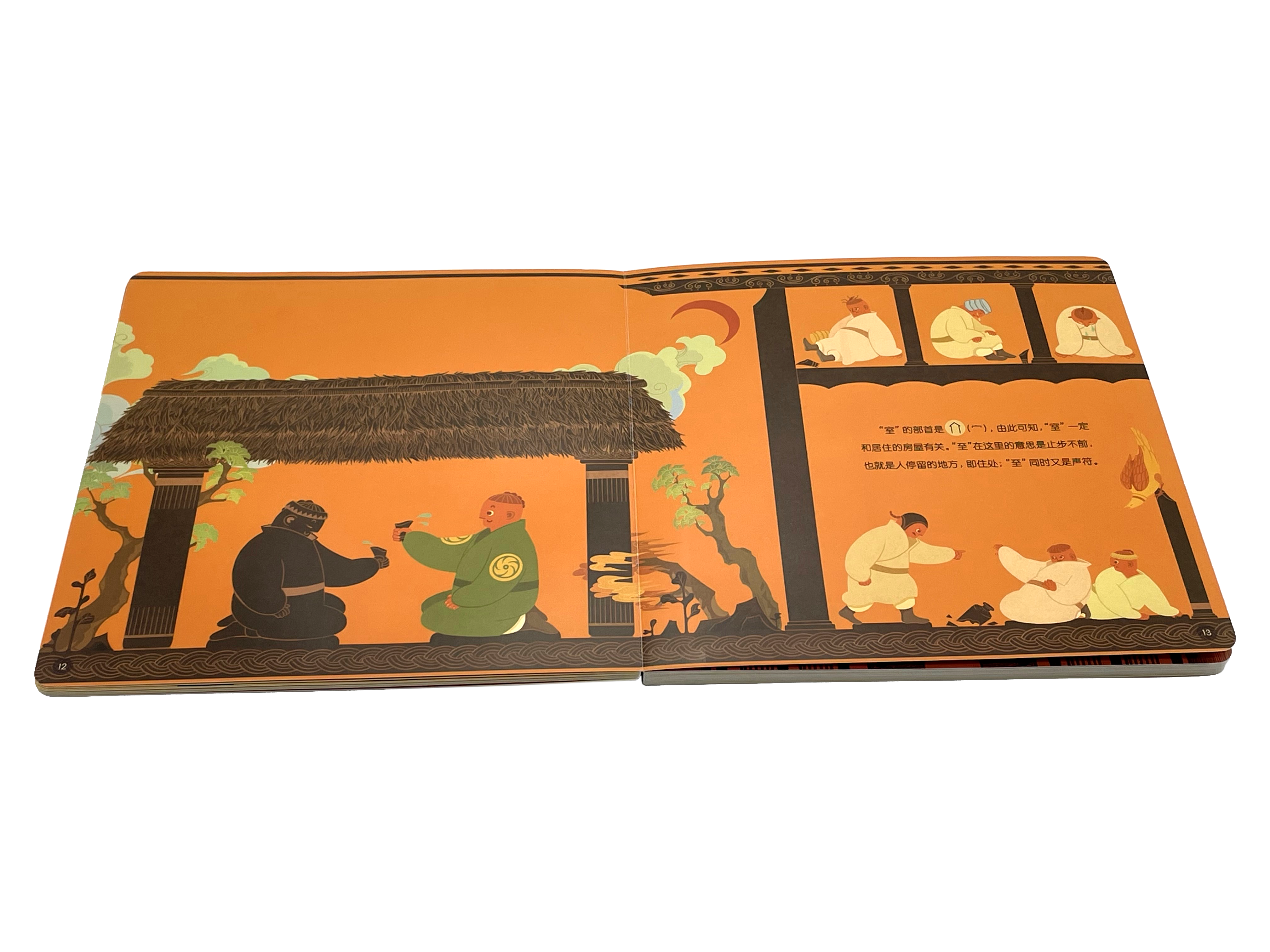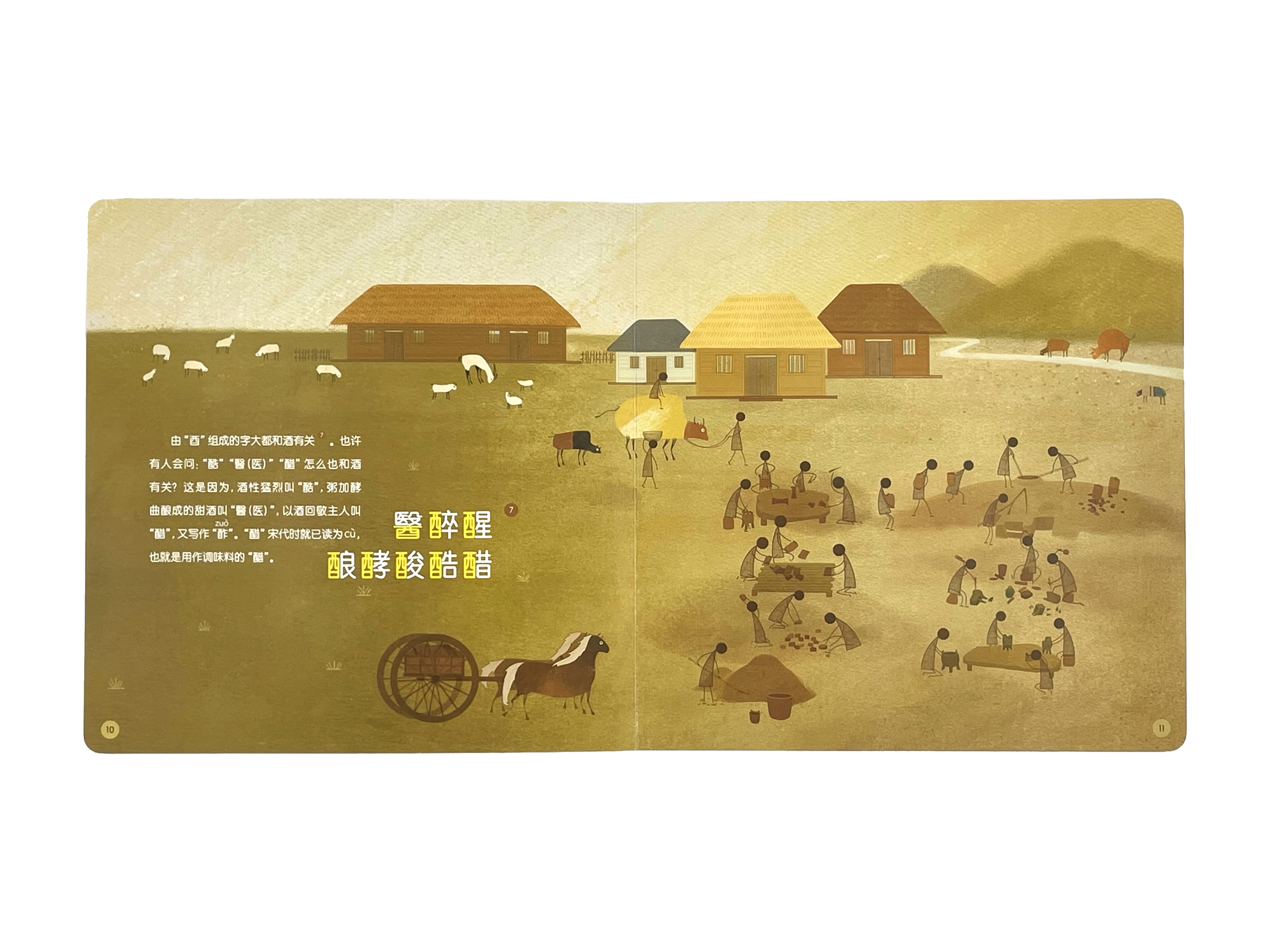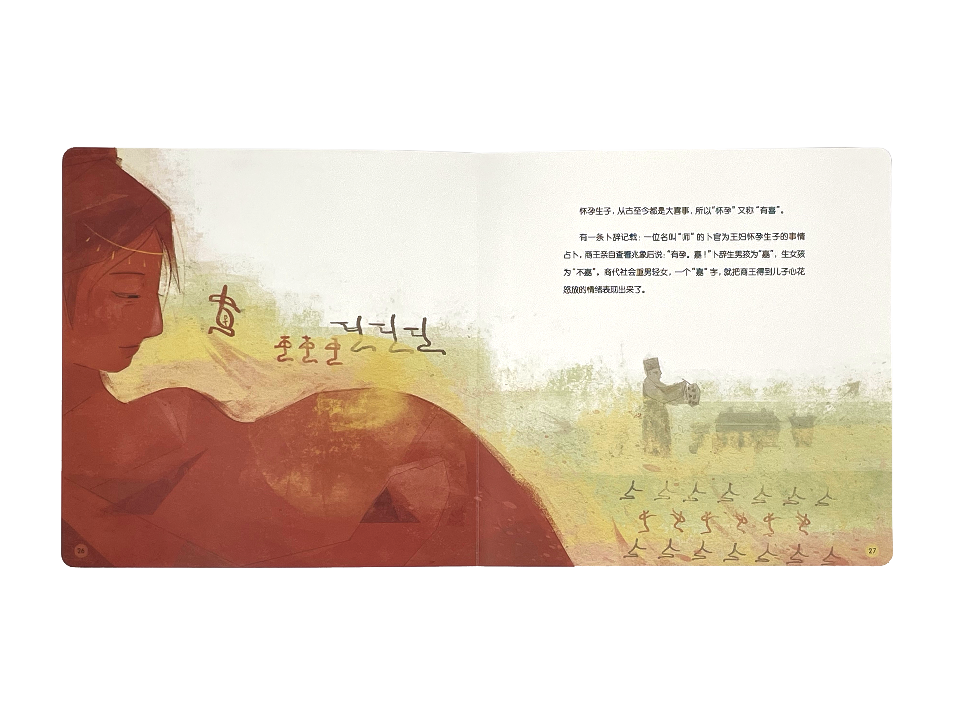 书中插画风格多样,非常巧妙地阐释了甲骨文的形与义,形象地展现出古人的衣食住行、耕织玩乐等生活场景,具有丰富多元的人文美育启蒙。