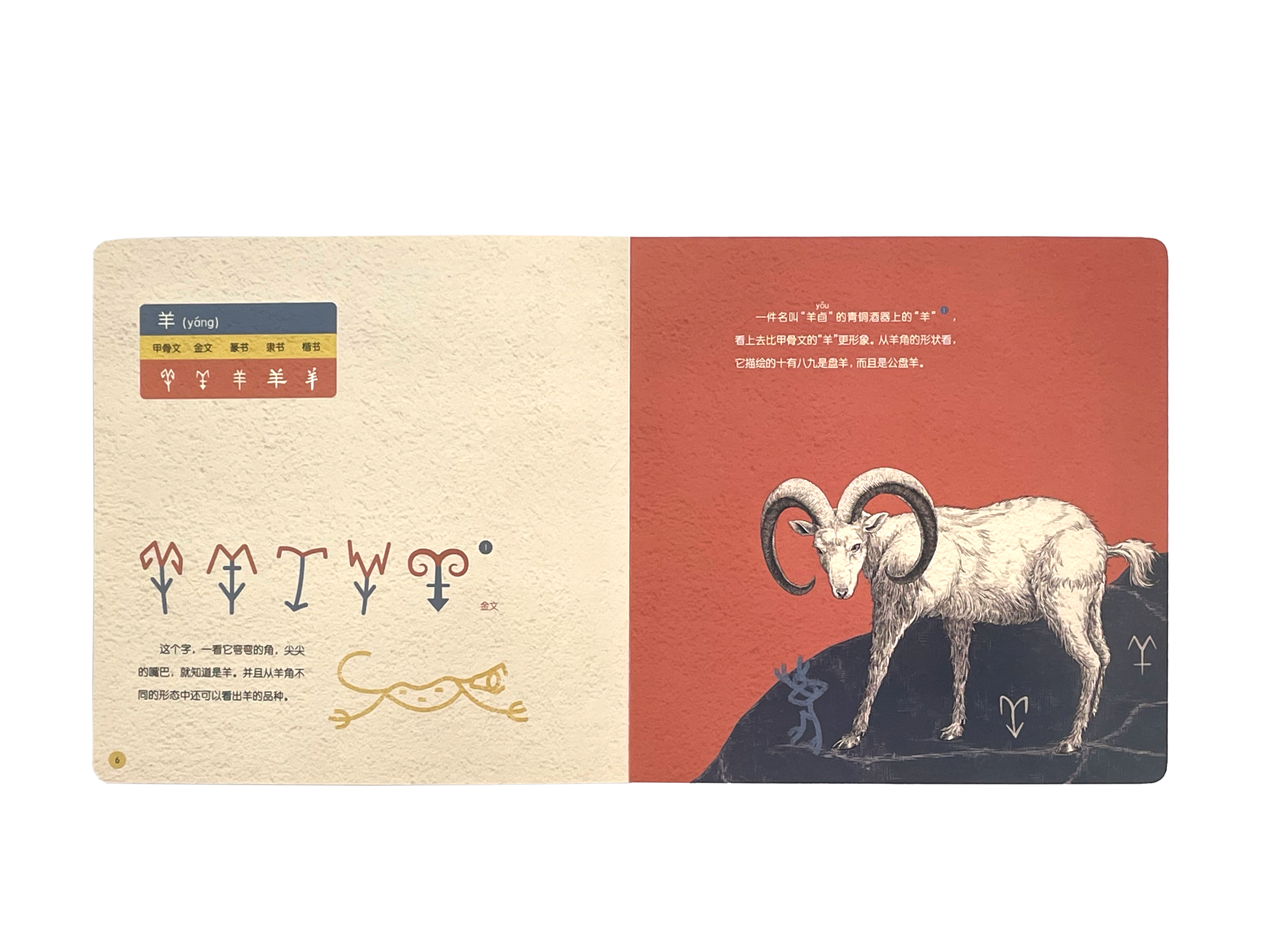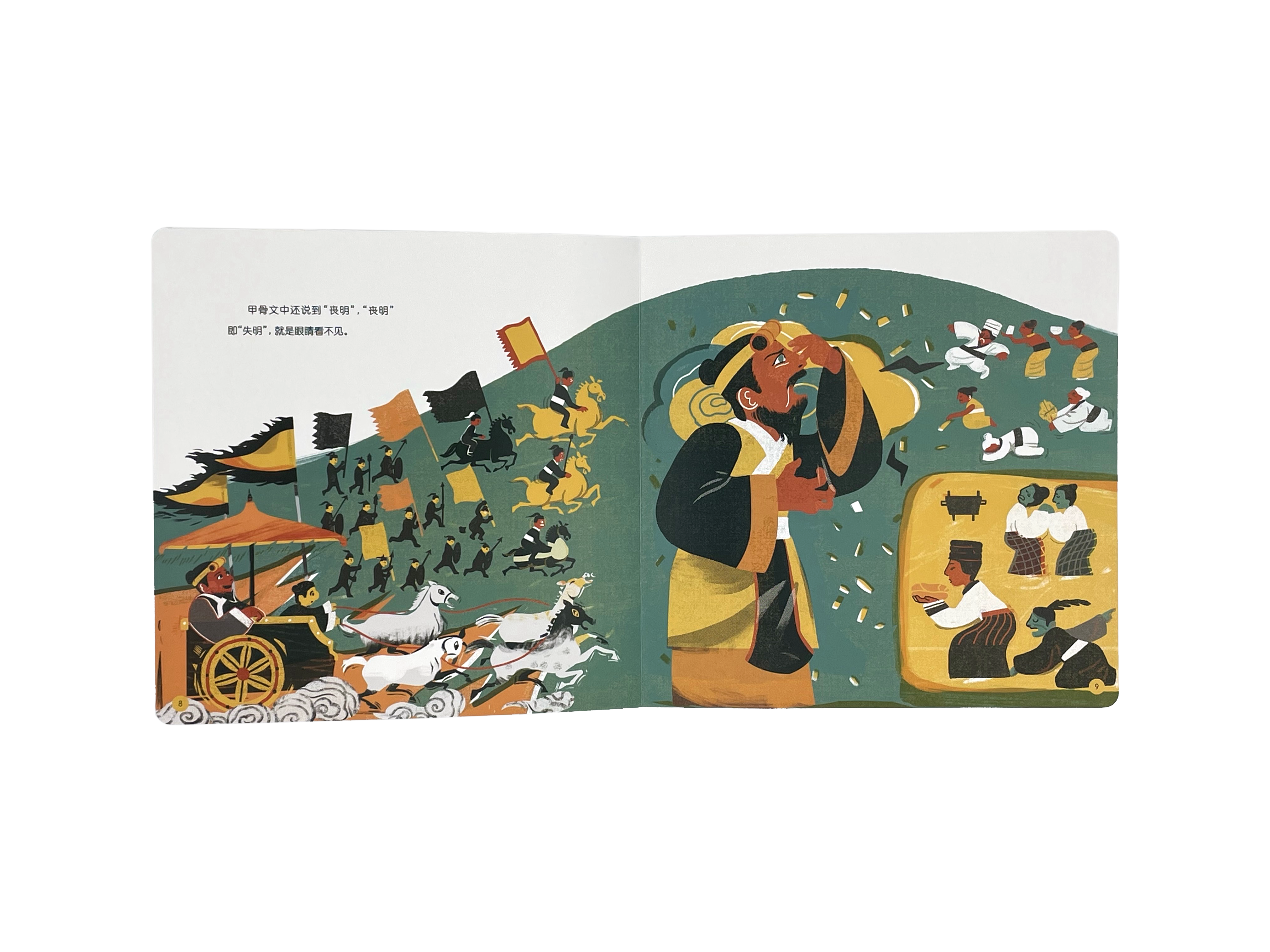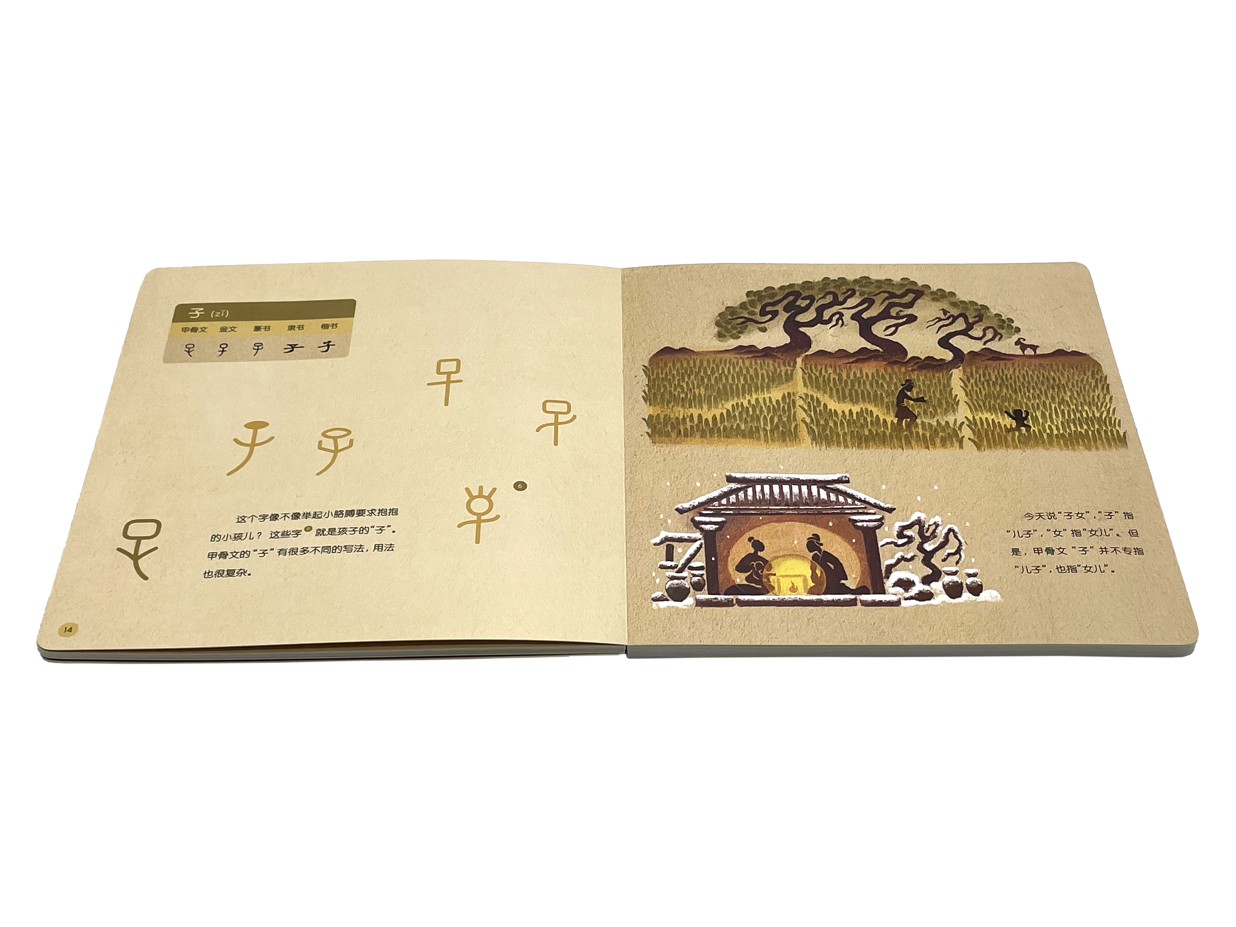 书中插画风格多样,非常巧妙地阐释了甲骨文的形与义,形象地展现出古人的衣食住行、耕织玩乐等生活场景,具有丰富多元的人文美育启蒙。
