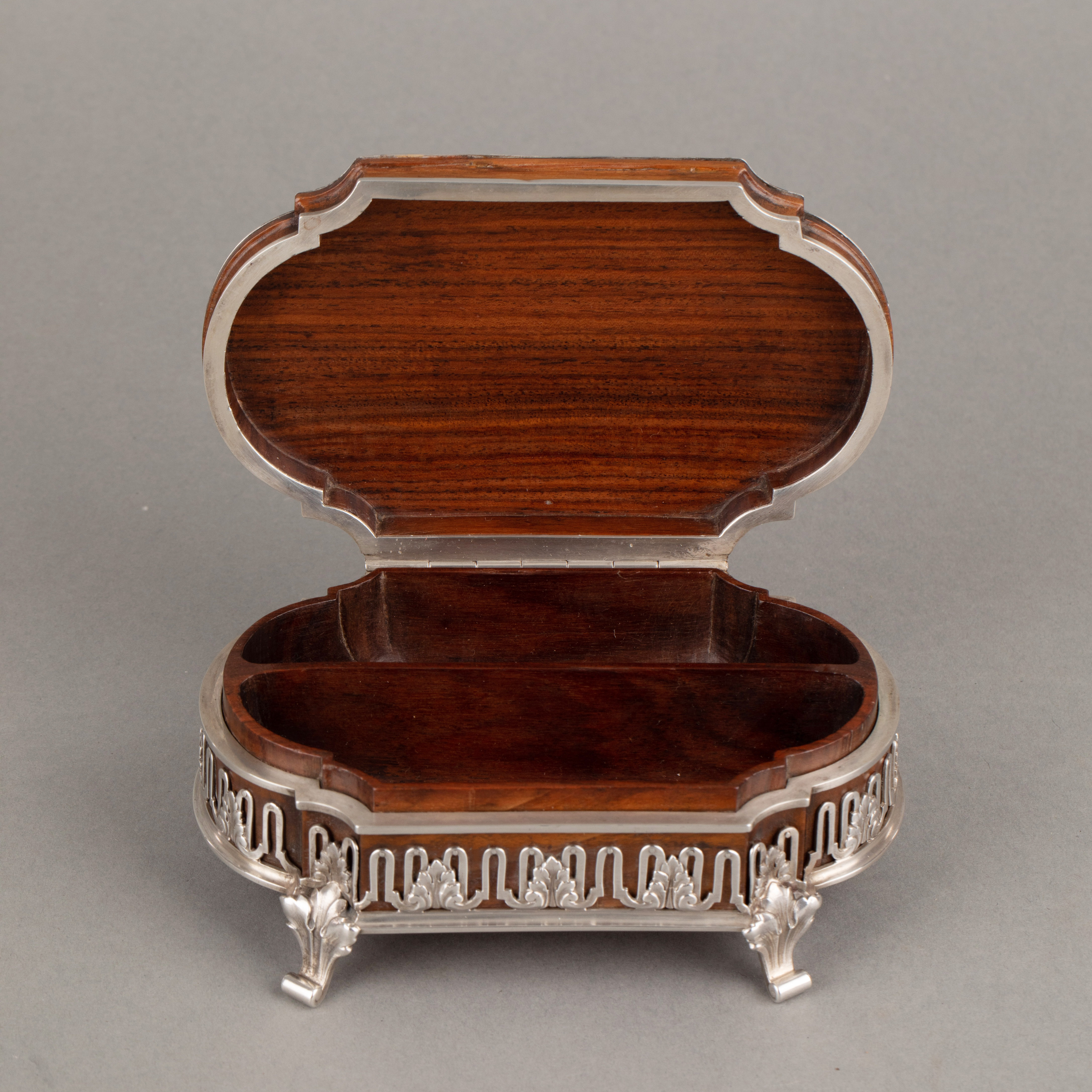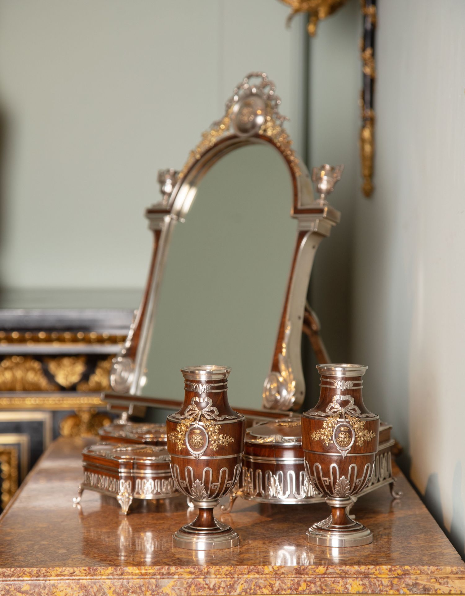 独角鹿西洋古董Gustave Keller纯银棕木珠宝盒化妆镜化妆六件套