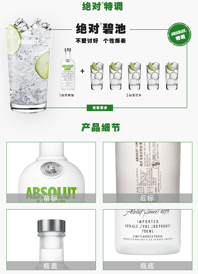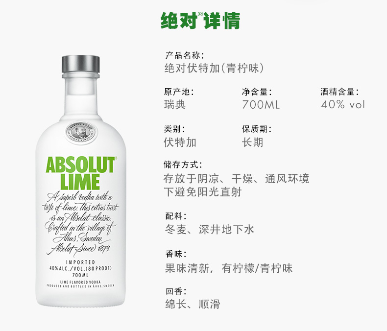 绝对伏特加 青柠味 700ml/1瓶/2瓶