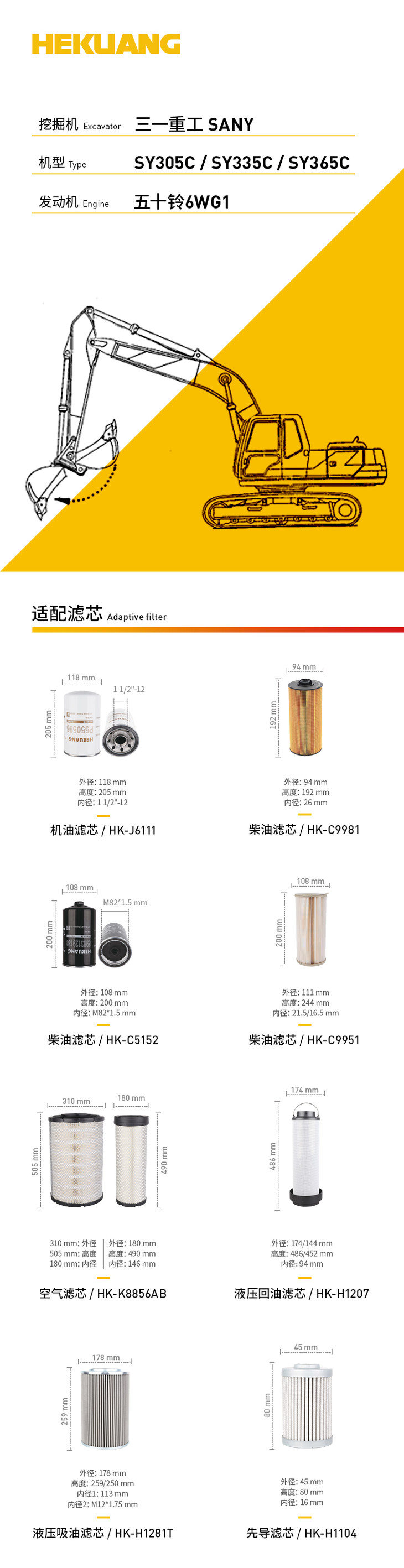 三一重工SY305C/335C/365C(五十铃6WG1)挖掘机适配滤芯 机柴滤芯 液压油吸油回油滤芯 空气滤芯