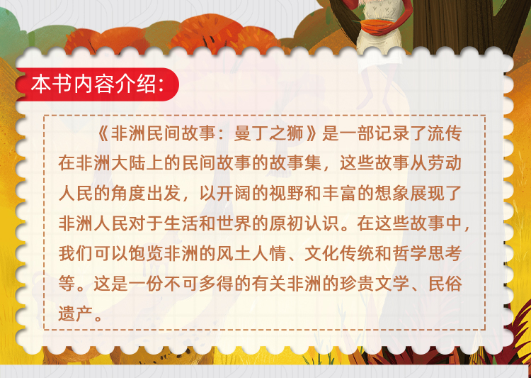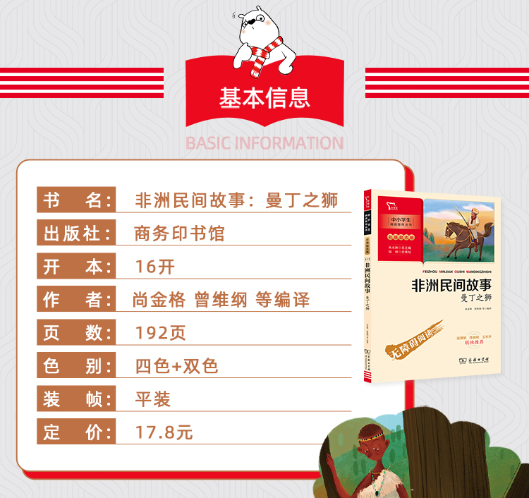 《非洲民间故事:曼丁之狮》一书主要读者对象是义务教育阶段的青少年,内容紧扣小学语文阅读要求。本书选入的篇目类型多样,有传说、寓言、童话等,历经一代又一代人的整理、讲述、传颂,融入了地理、历史、风俗等内容。这里面有关于财富、友谊的故事,有国王、平民的故事,也有动物的故事,每个故事都传递善良、勇敢、忠诚、责任等正能量,同时鄙弃邪恶、怯懦、懒惰、贪婪等负能量。读者在阅读过程中,可以开阔视野,领略异域文化,培养良好的阅读习惯。