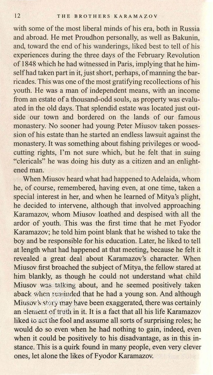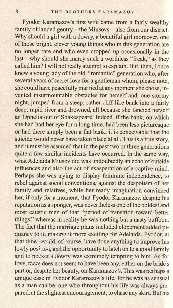 In 1880 Dostoevsky completed The Brothers Karamazov, the literary effort for which he had been preparing all his life. Compelling, profound, complex, it is the story of a patricide and of the four sons who each had a motive for murder: Dmitry, the sensualist, Ivan, the intellectual; Alyosha, the mystic; and twisted, cunning Smerdyakov, the bastard child. Frequently lurid, nightmarish, always brilliant, the novel plunges the reader into a sordid love triangle, a pathological obsession, and a gripping courtroom drama. But throughout the whole, Dostoevsky searhes for the truth--about man, about life, about the existence of God. A terrifying answer to man's eternal questions, this monumental work remains the crowning achievement of perhaps the finest novelist of all time.