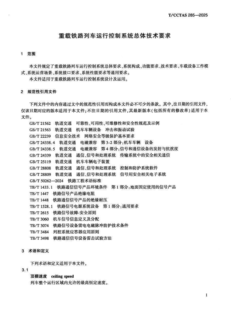 书名:重载铁路列车运行控制系统总体技术要求T/CCTAS 285—2025