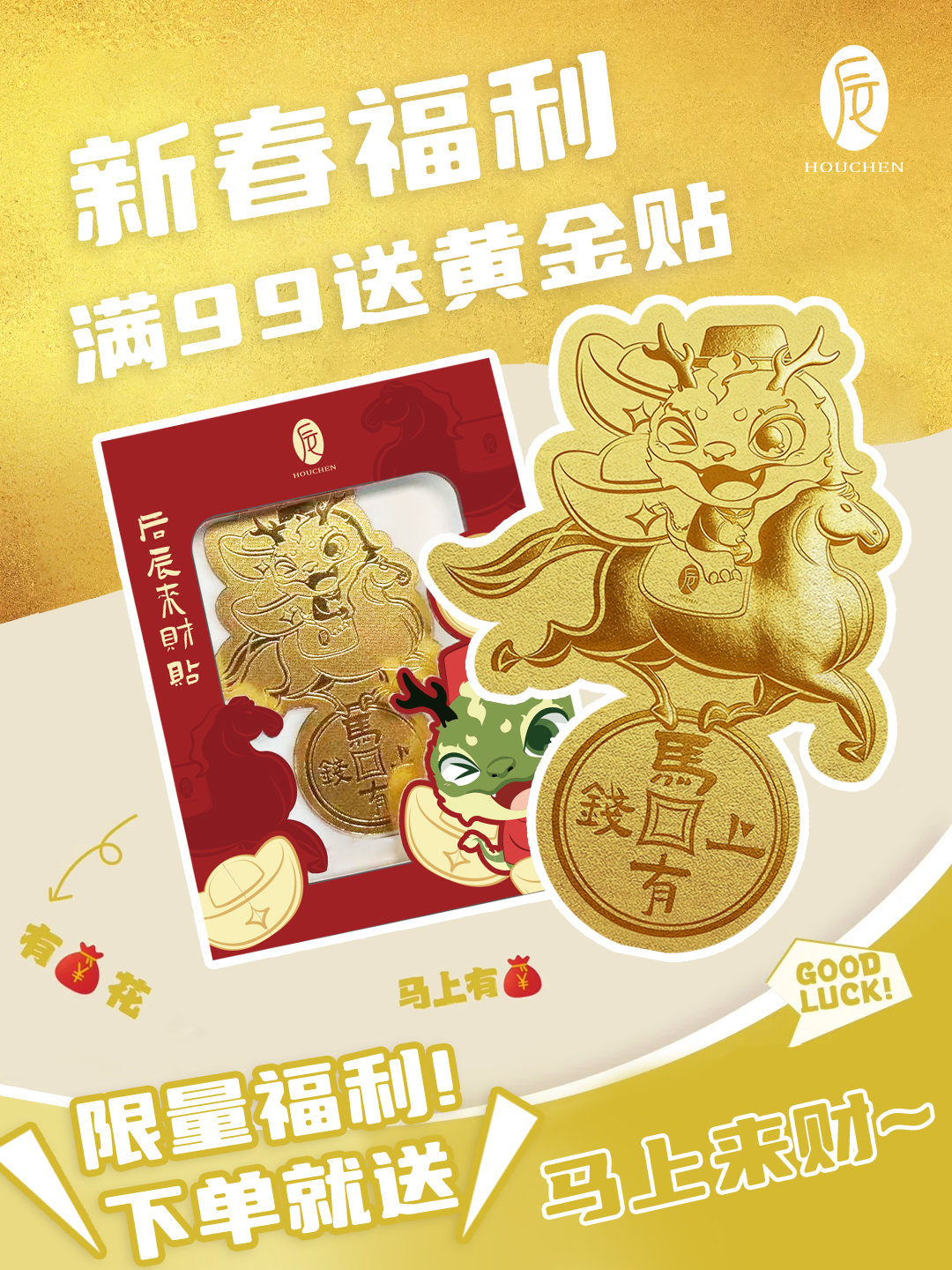 【新春会场实付满99元随单赠送】后辰黄金来财贴,新年好运,马上来财~