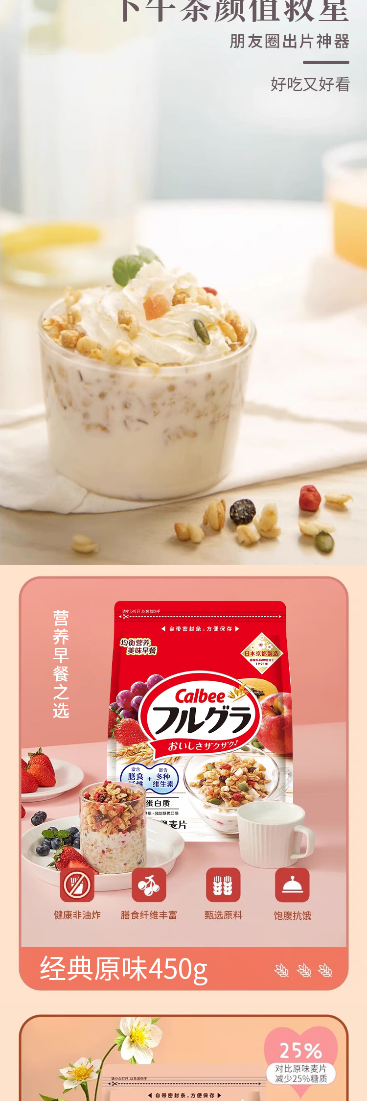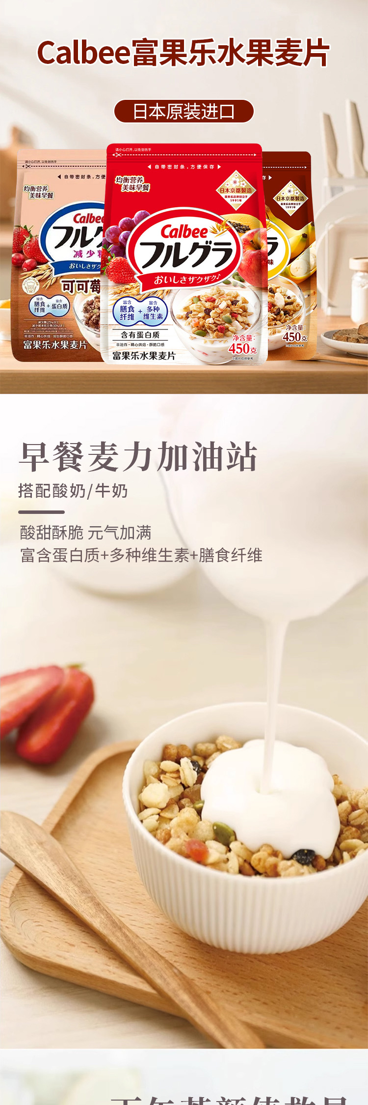 日本进口Calbee富果乐原味|巧克力曲奇味|可可莓味水果麦片450g