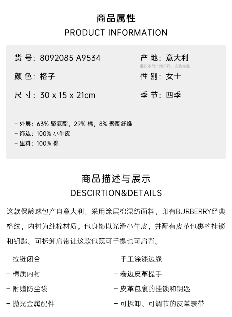 BURBERRY 巴宝莉 女士中号格纹保龄球提挎包 格子 8092085 A9534