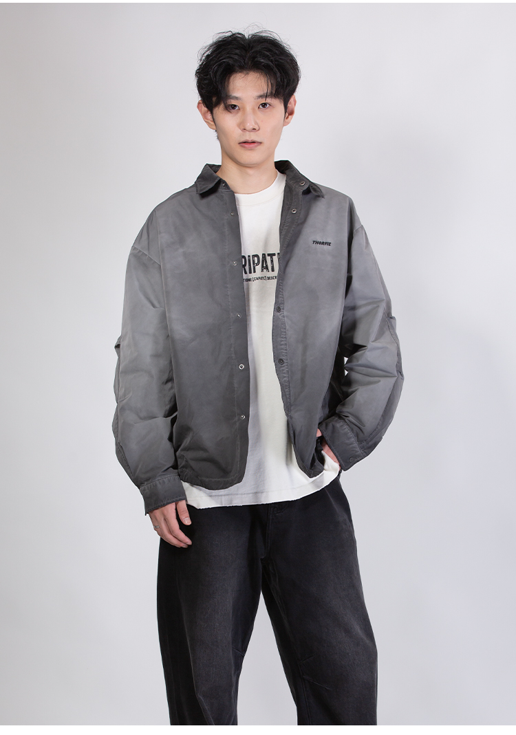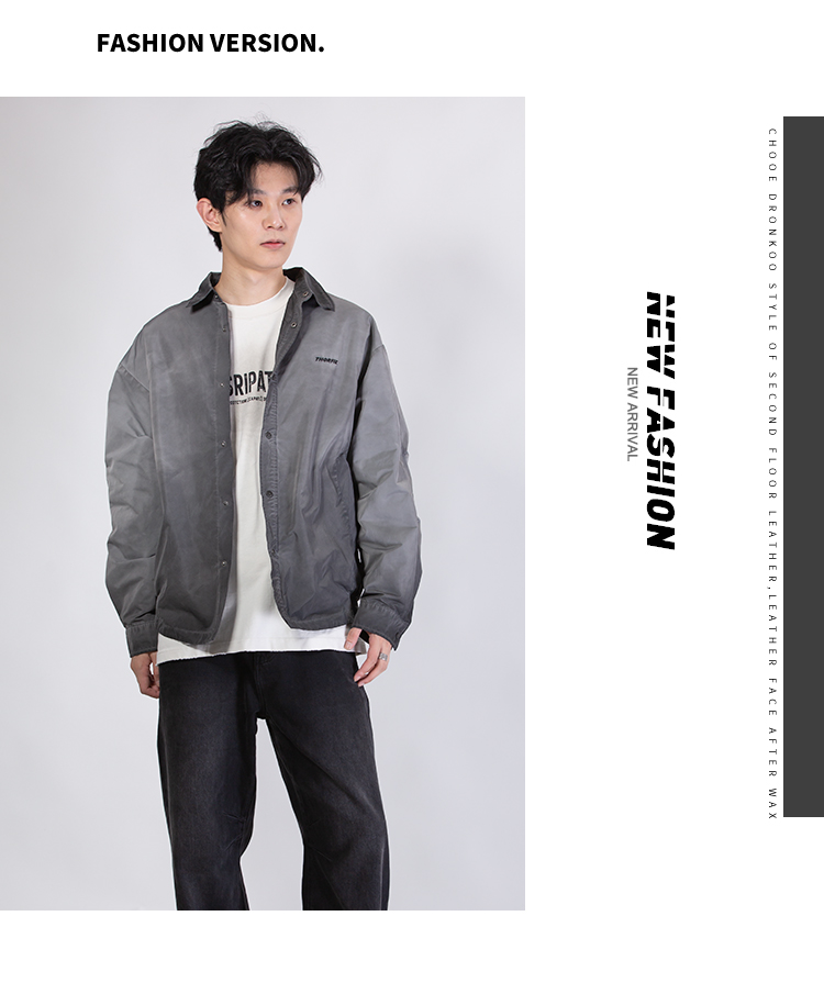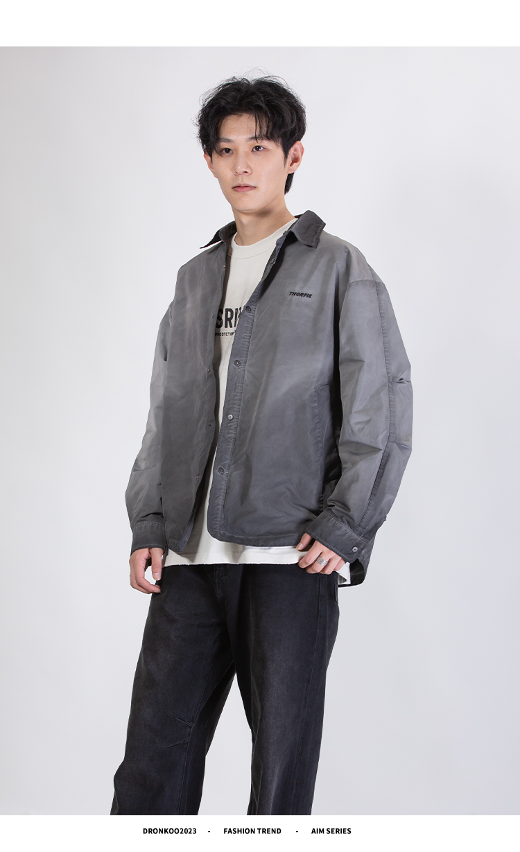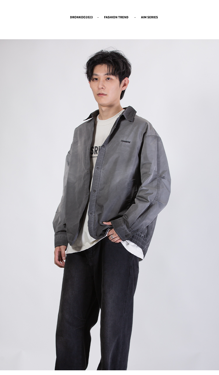 DRONKOO 2025 翻领左胸刺绣字母领袖下摆喷色洗水中厚衬衣外套