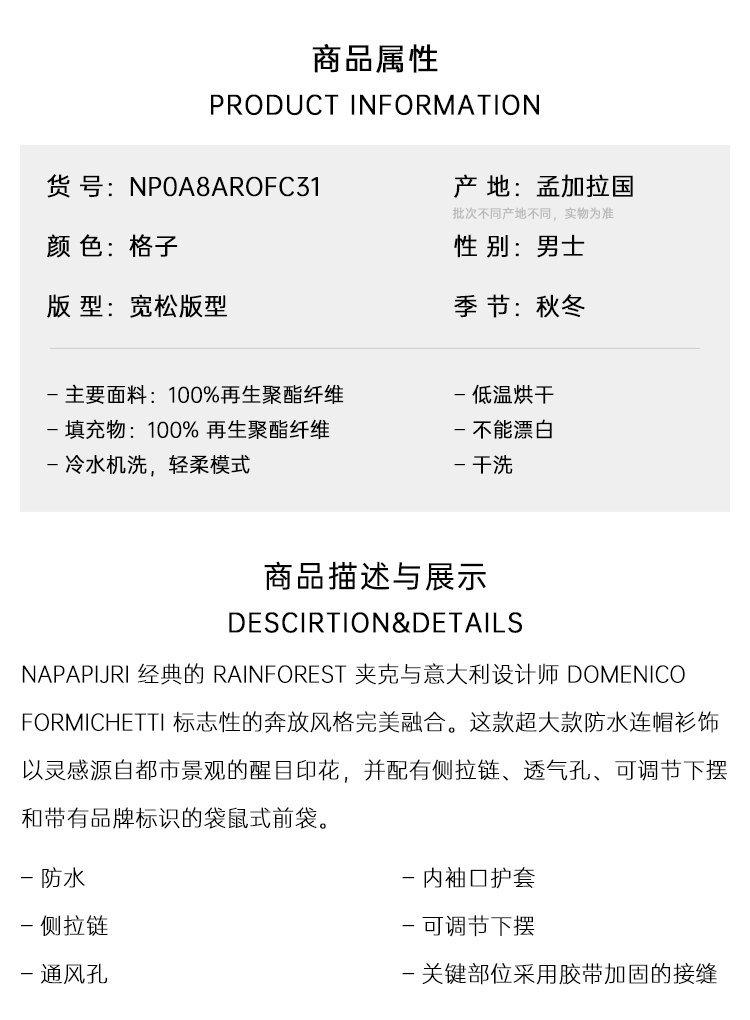 BURBERRY 巴宝莉 男士格纹尼龙连帽外套 格子 8077178 B7369