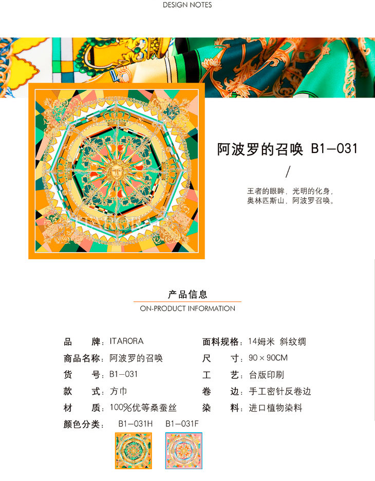 奥罗拉桑蚕丝巾/阿波罗的召唤/90*90CM/B1-031/花色