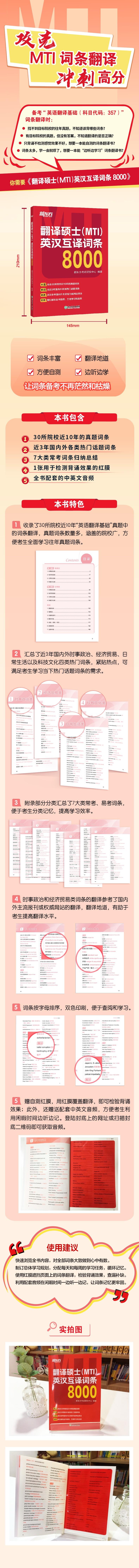 1.内容丰富。本书收录了综合类、外语类、师范类、理工类共30所院校近10年“英语翻译基础”真题中的翻译词条以及国内外近3年各类热门话题词条。书中收录的词条涵盖的院校多,涉及的话题广,内容丰富,有助于考生全面备考。 2.翻译地道。时事政治和经济贸易类词条的翻译参考了国内外主流报刊或权威网站的翻译,如中国的China Daily、新华网、Beijing Review,英国的The Economist以及美国的Newsweek等,翻译地道、精准。 3.配有一张自测“红膜”。使用“红膜”可以遮挡页面上的词条翻译,方便考生及时检验学习效果,巩固所学。考生也可以在未掌握的词条旁边做标记,复习时可以只背诵有标记的词条,这样可以大幅缩减背诵时间,提高学习效率。 4.全书词条配有中英文音频。登陆封底上的网址或扫描封底二维码即可获取。这些音频方便考生跟读、模仿,考生还可利用音频在闲暇时间边听边记,让词条记忆更牢固。