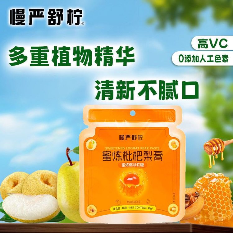 【慢严舒柠蜜炼爆浆软糖】 从舌尖到喉咙的清爽滋润 0防腐剂、0色素 梨膏添加量≥50%