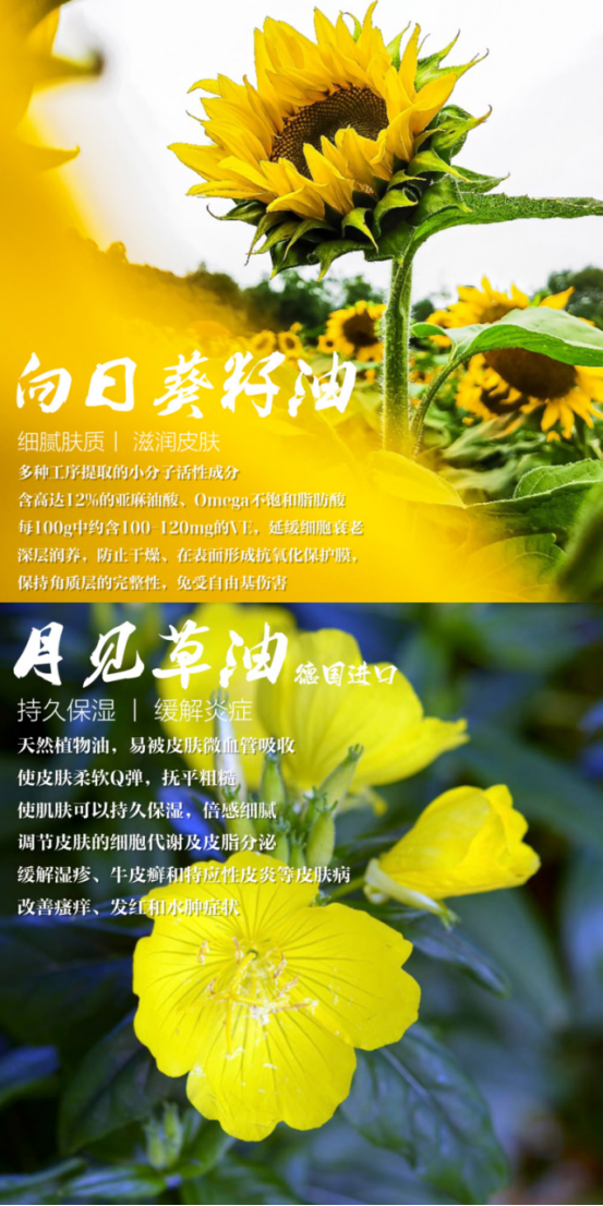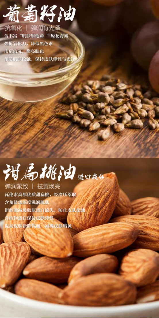 从源头进口提高品质,4重亲肤植萃精油,溶走毛孔脏污,深沁润养皮脂膜,持久润滑不干 葡萄籽油--抗氧化