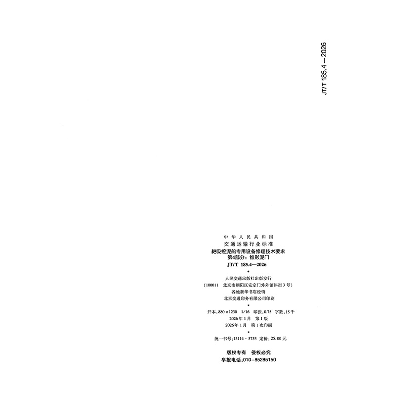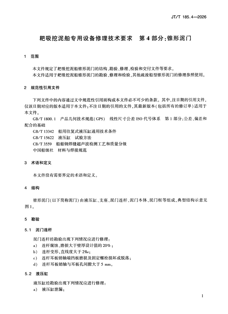 书名:耙吸挖泥船专用设备修理技术要求 第4部分:锥形泥门(JT/T 185.4—2026)