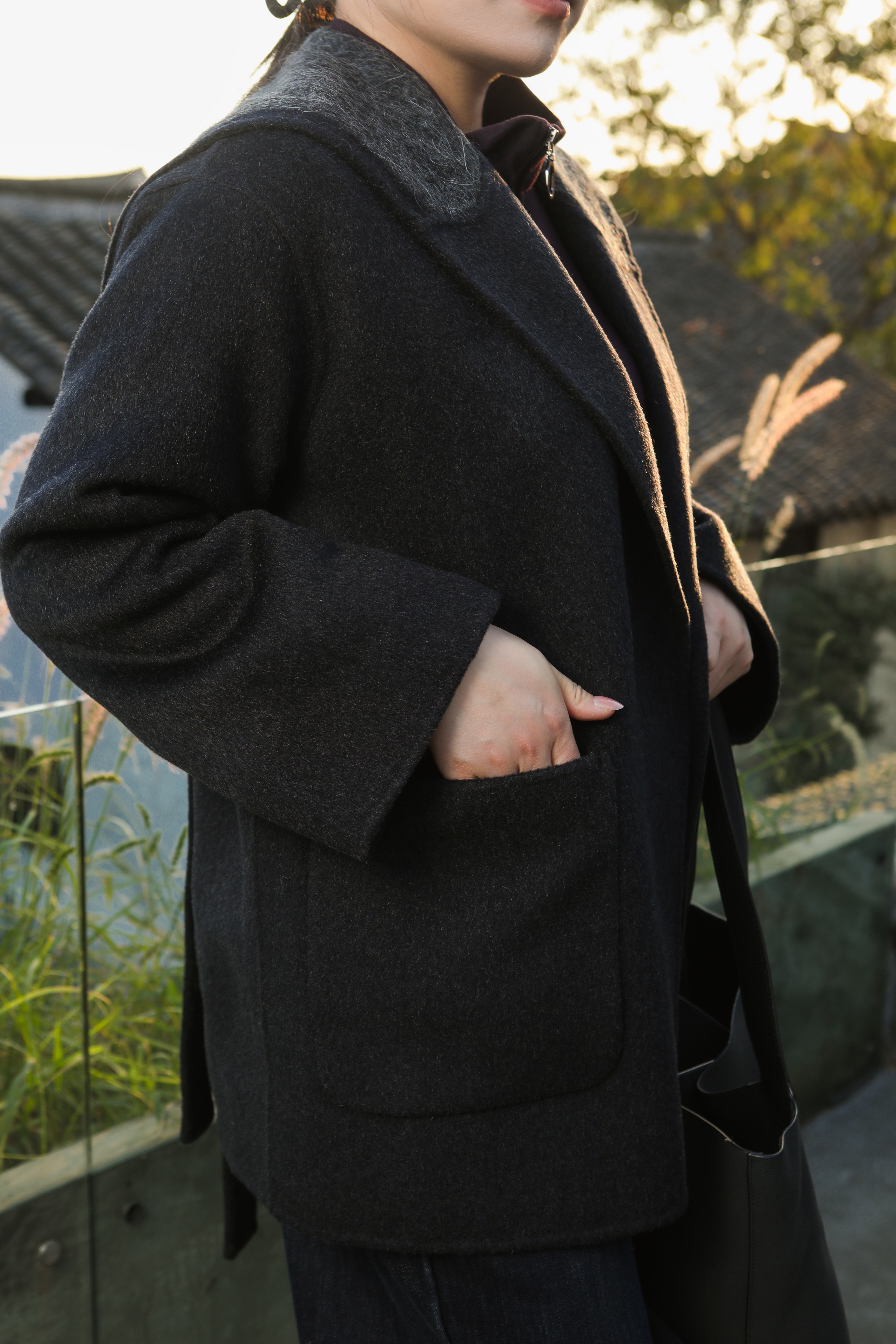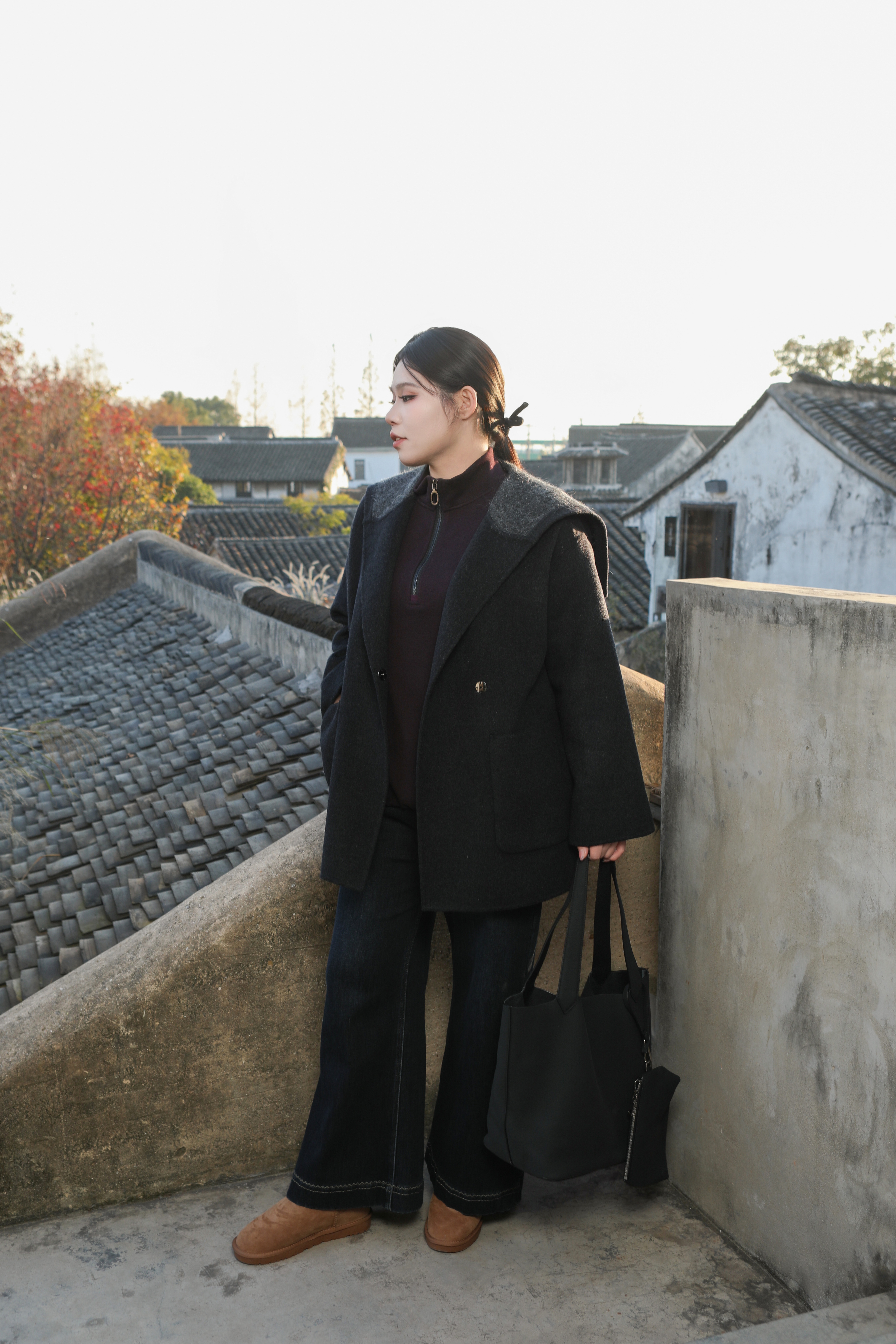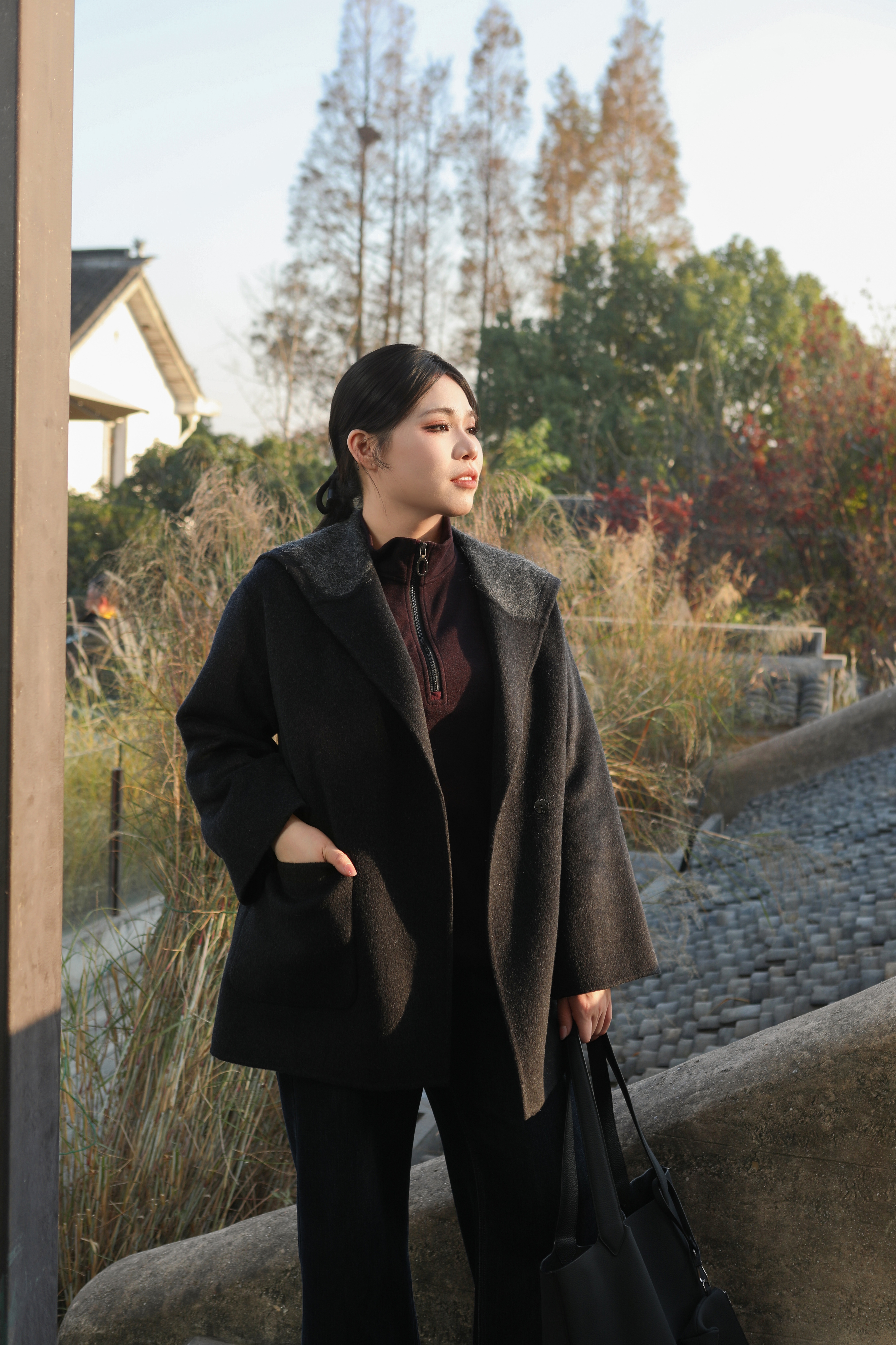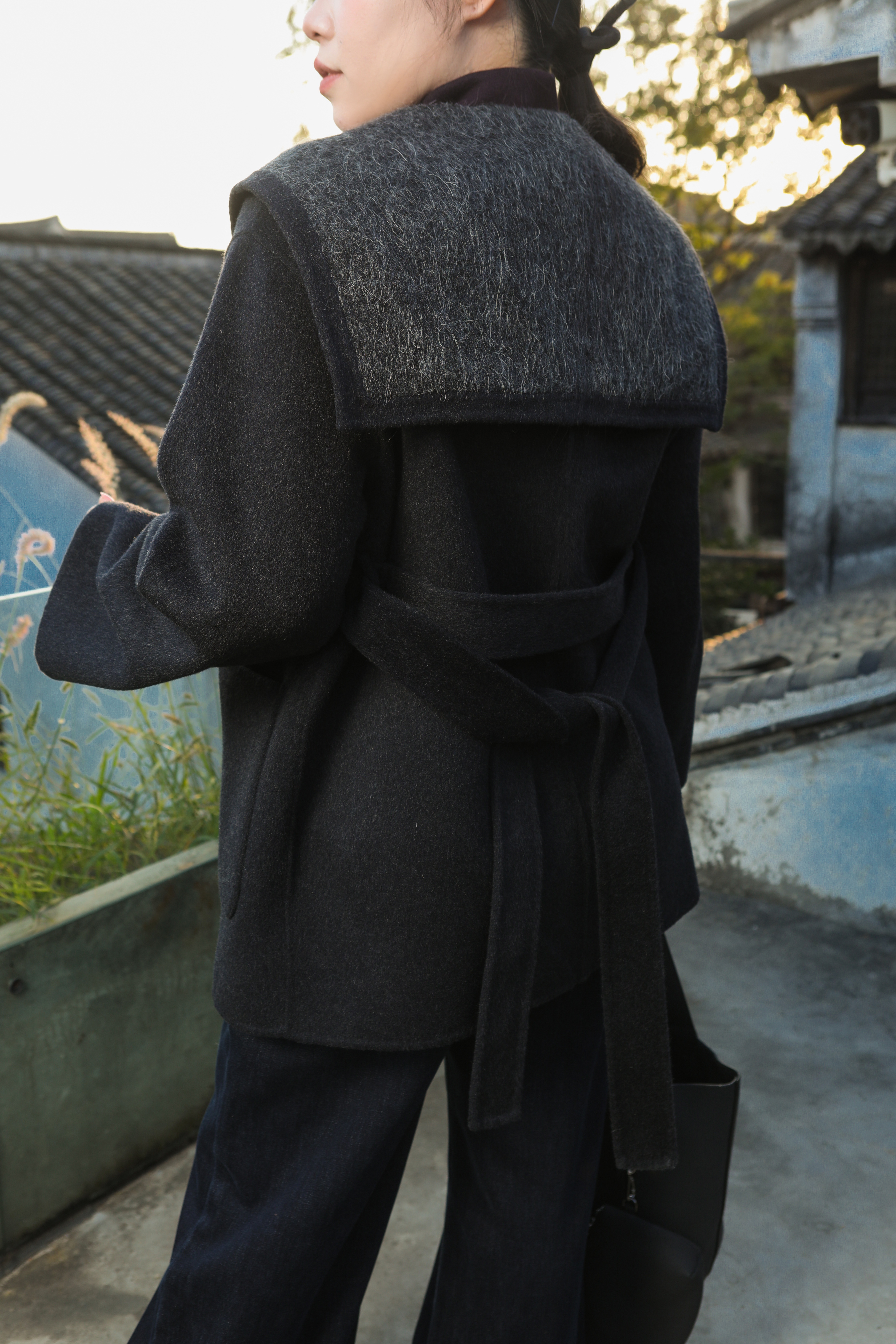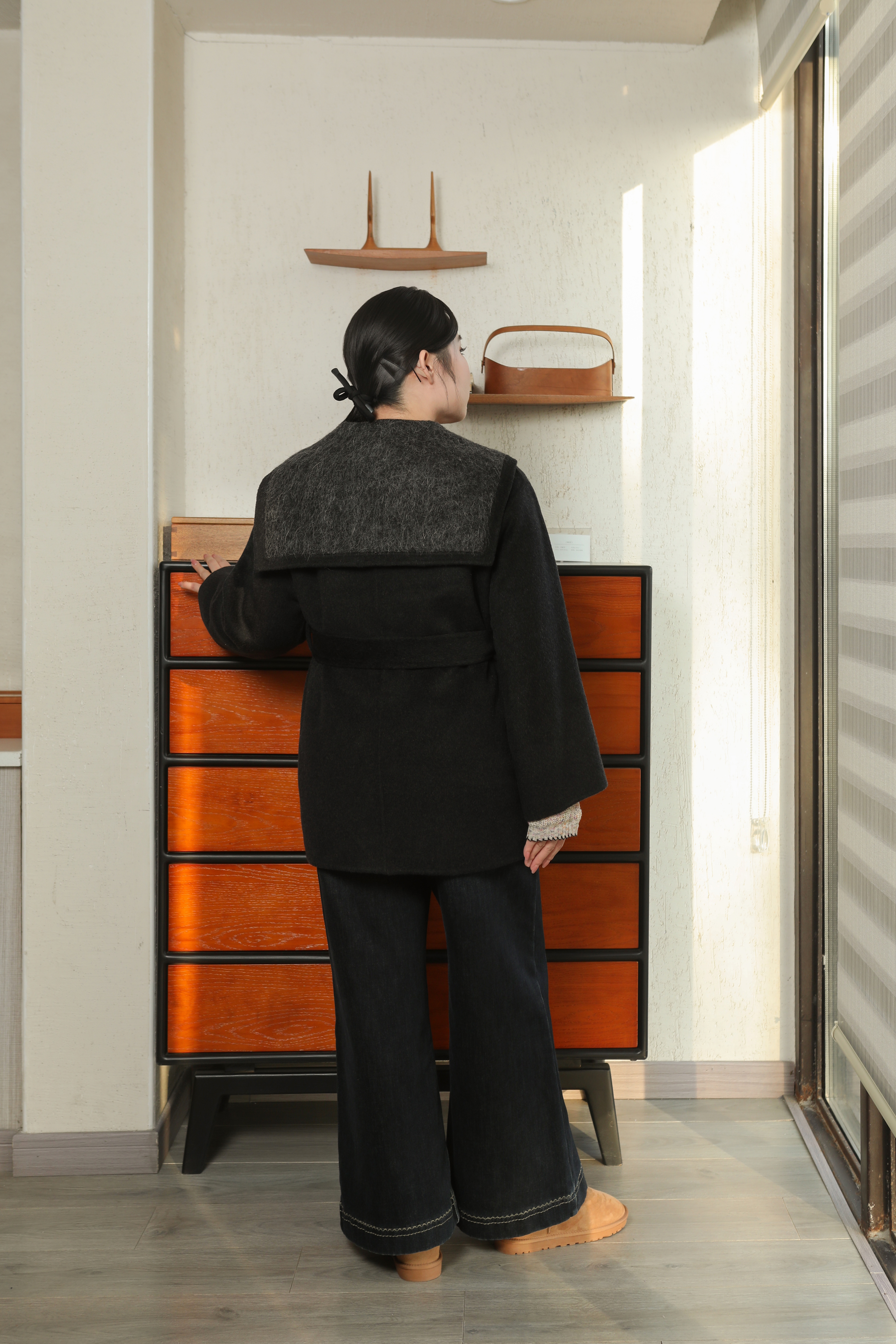现货,秒拍秒发【绵羊毛双面呢大衣】宽松版,海军领披肩,经典高级黑灰色系,面料无弹,中长款,非常利落的秋冬大衣!面料:75.2%绵羊毛,14.6%聚酯纤维,8.1%莱赛尔,2.1%其他纤维;