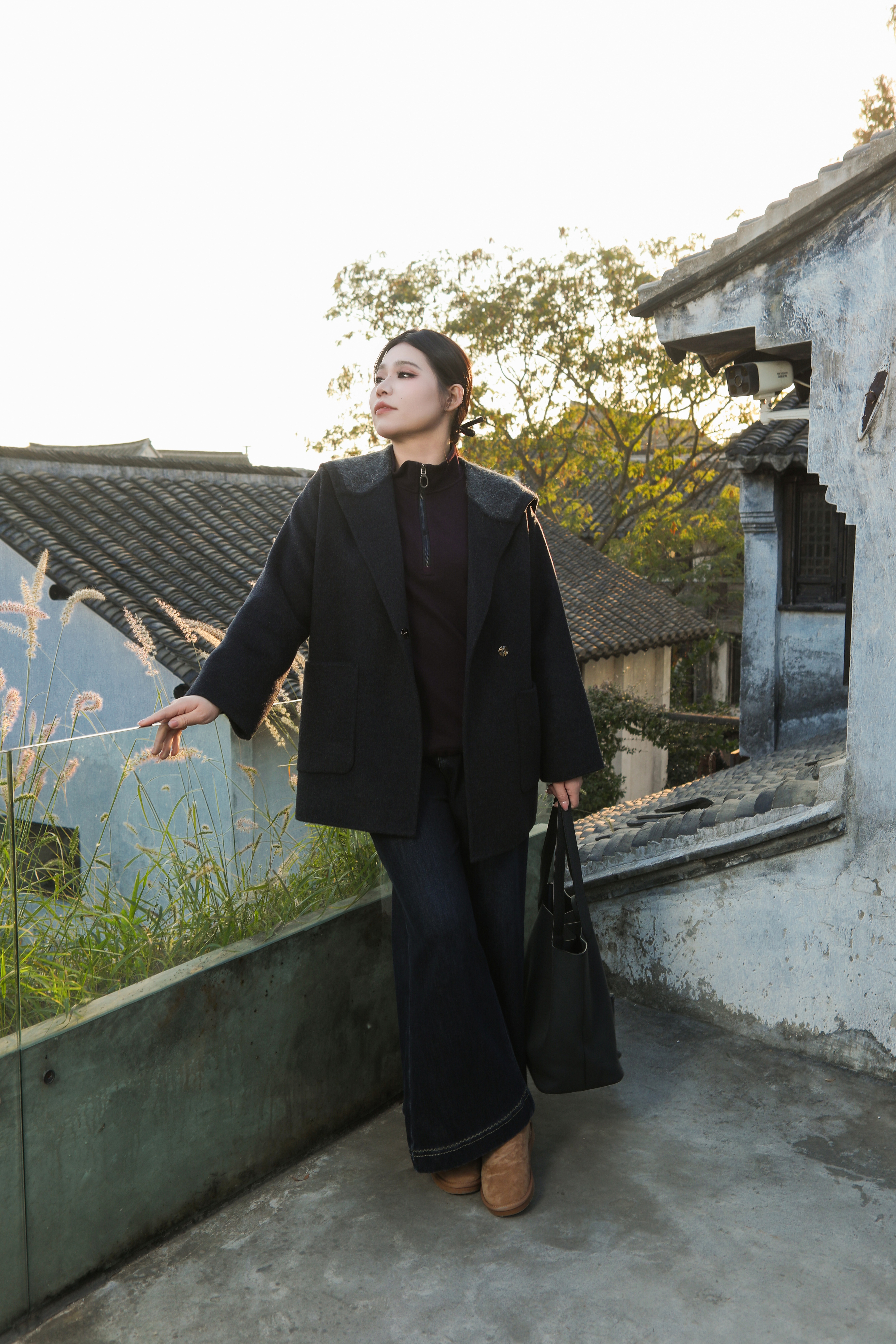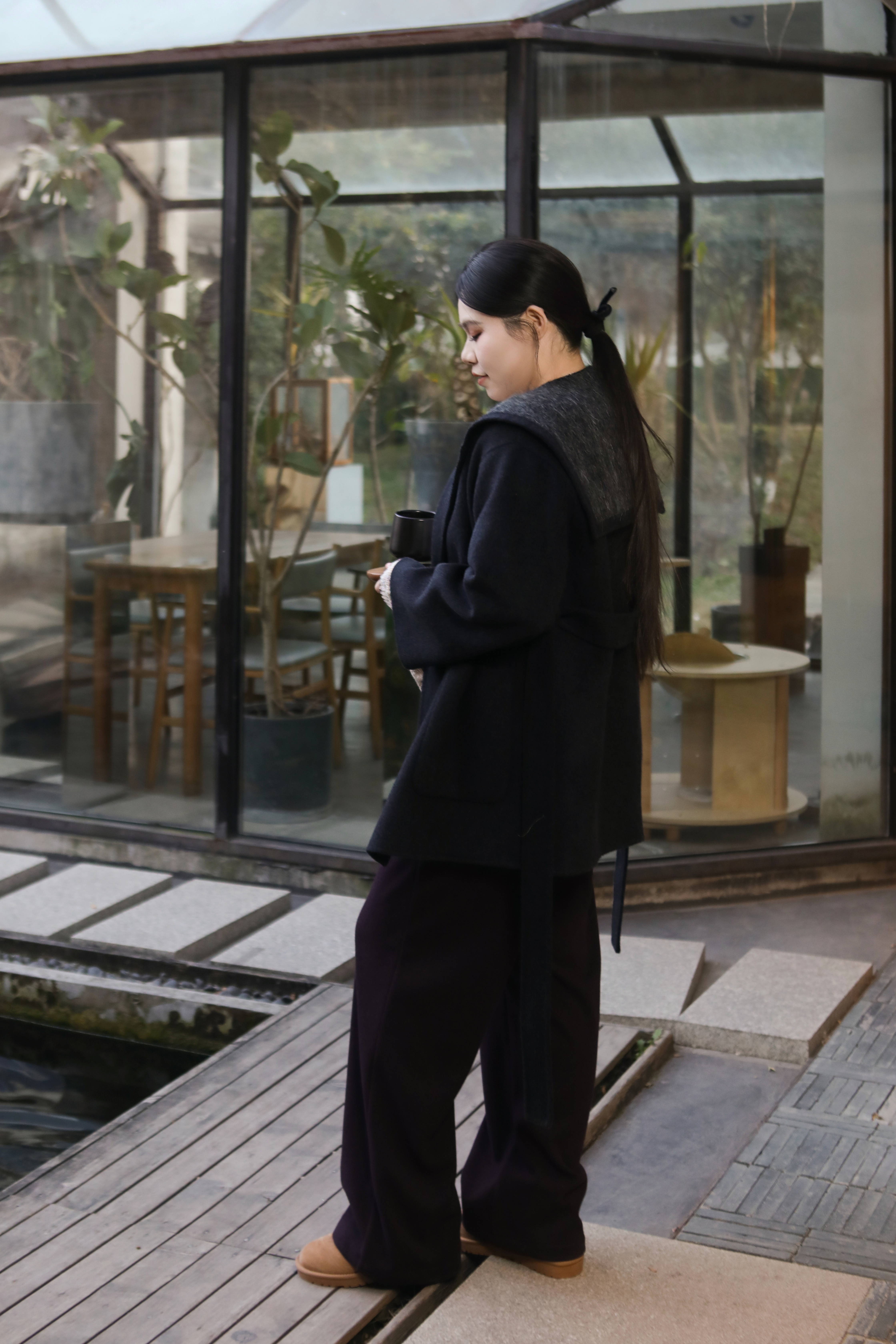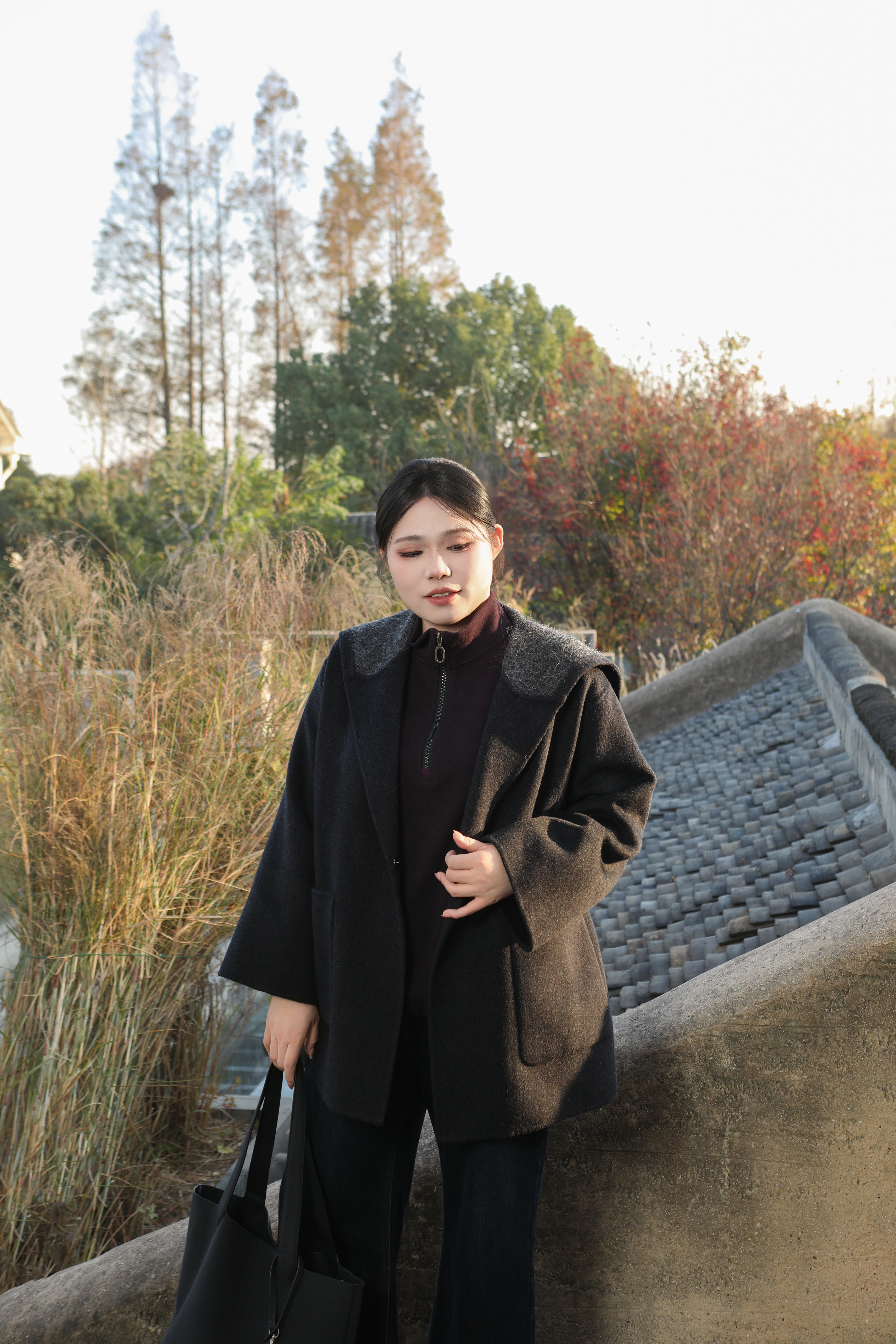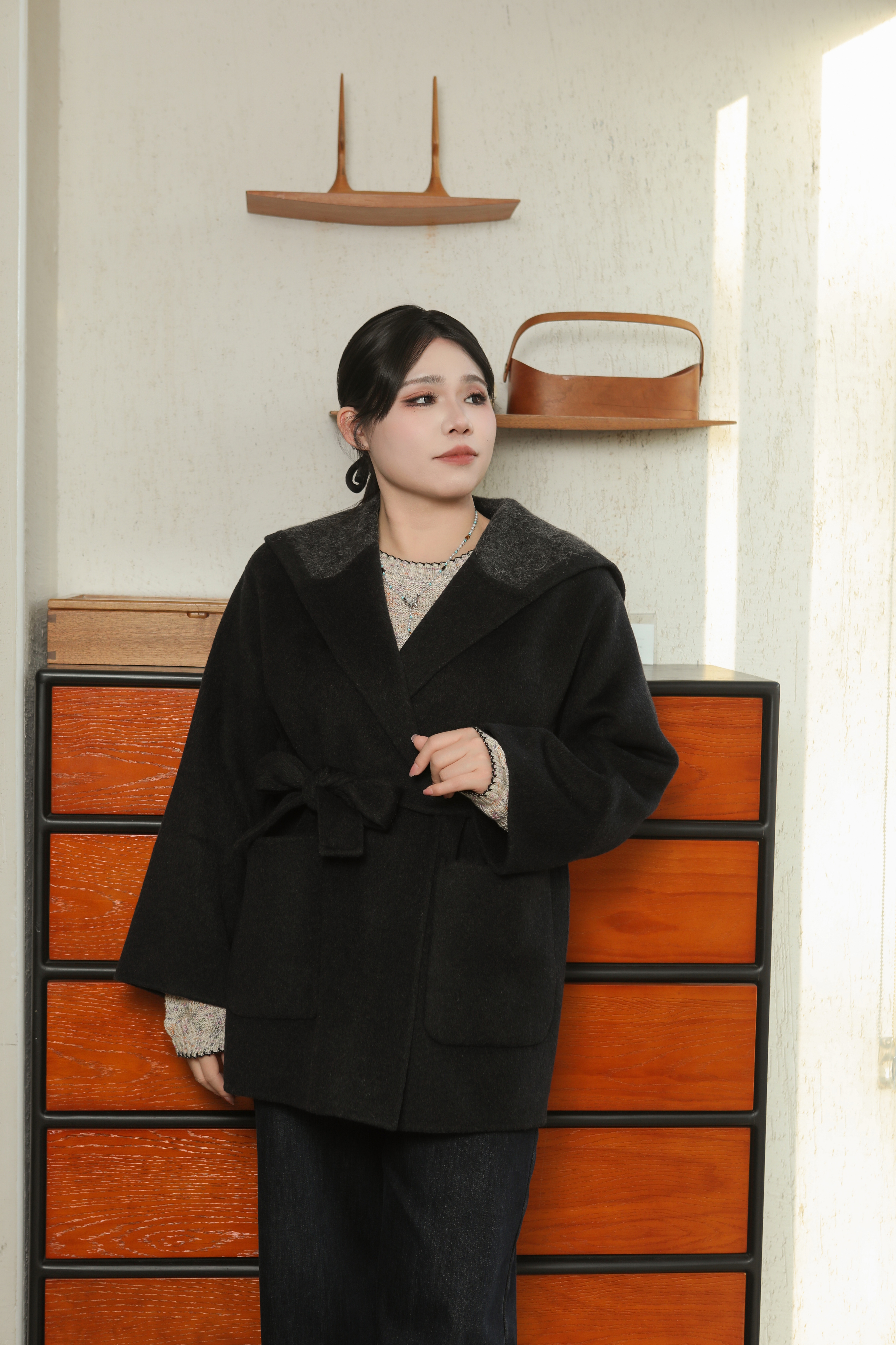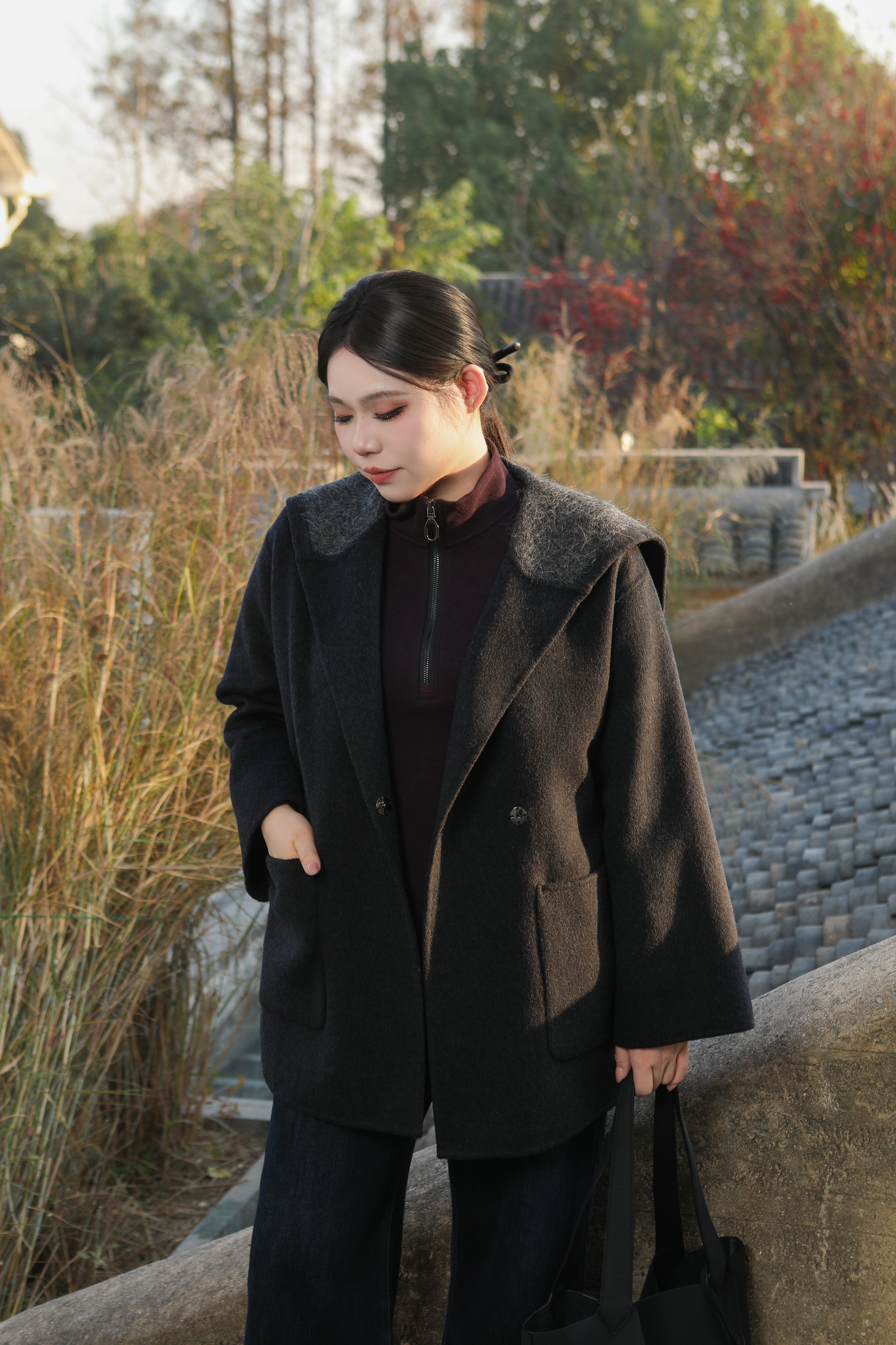 现货,秒拍秒发【绵羊毛双面呢大衣】宽松版,海军领披肩,经典高级黑灰色系,面料无弹,中长款,非常利落的秋冬大衣!面料:75.2%绵羊毛,14.6%聚酯纤维,8.1%莱赛尔,2.1%其他纤维;