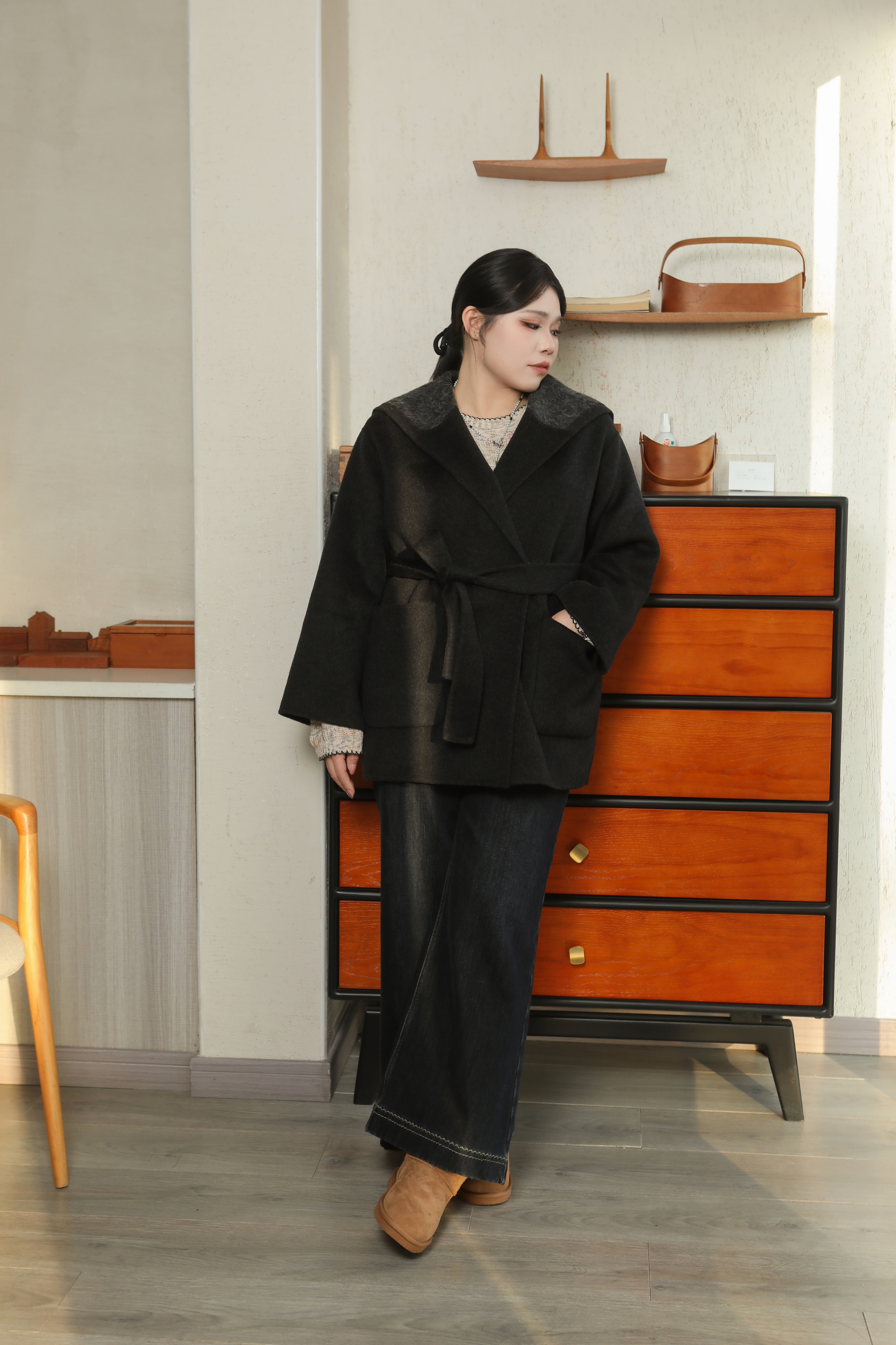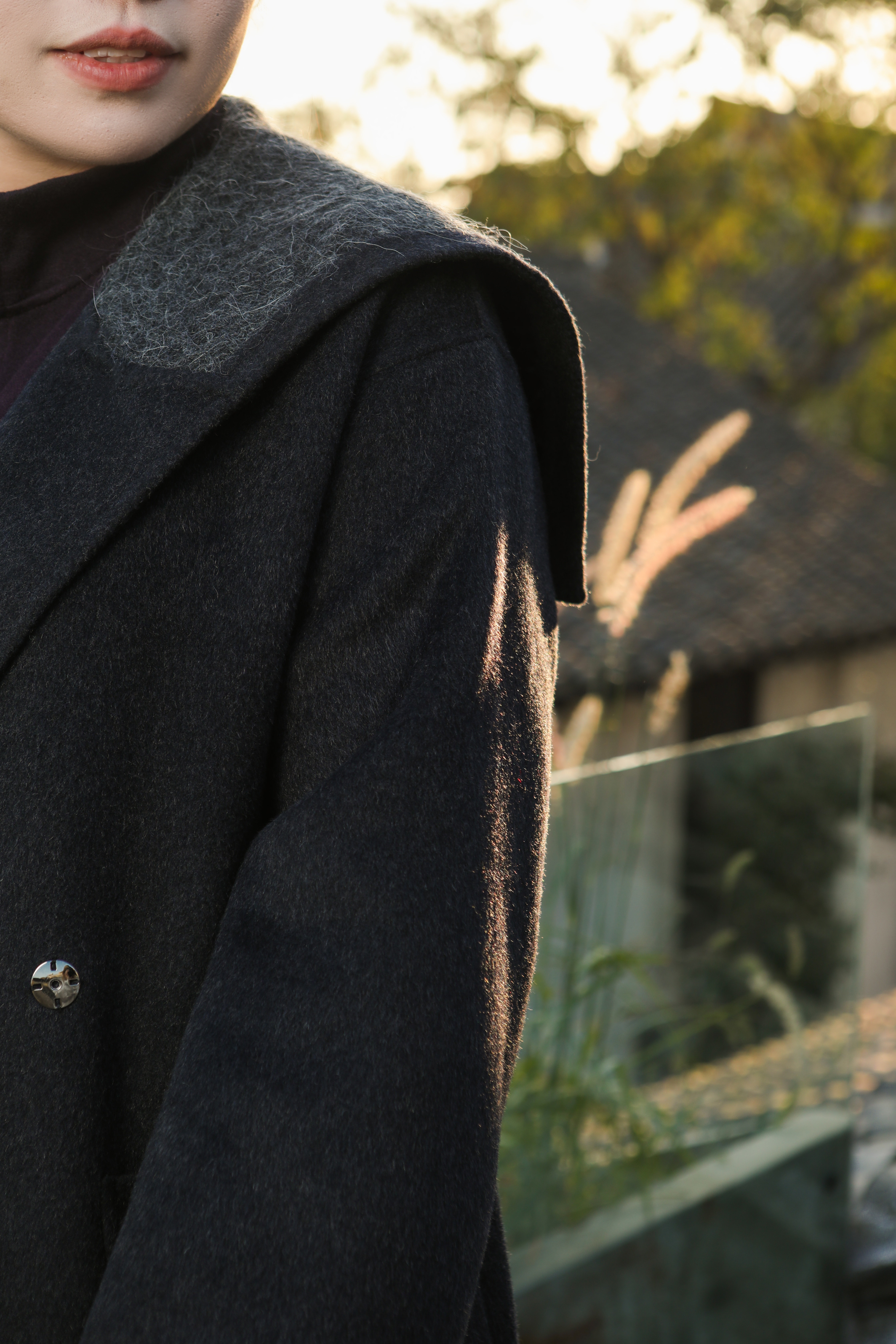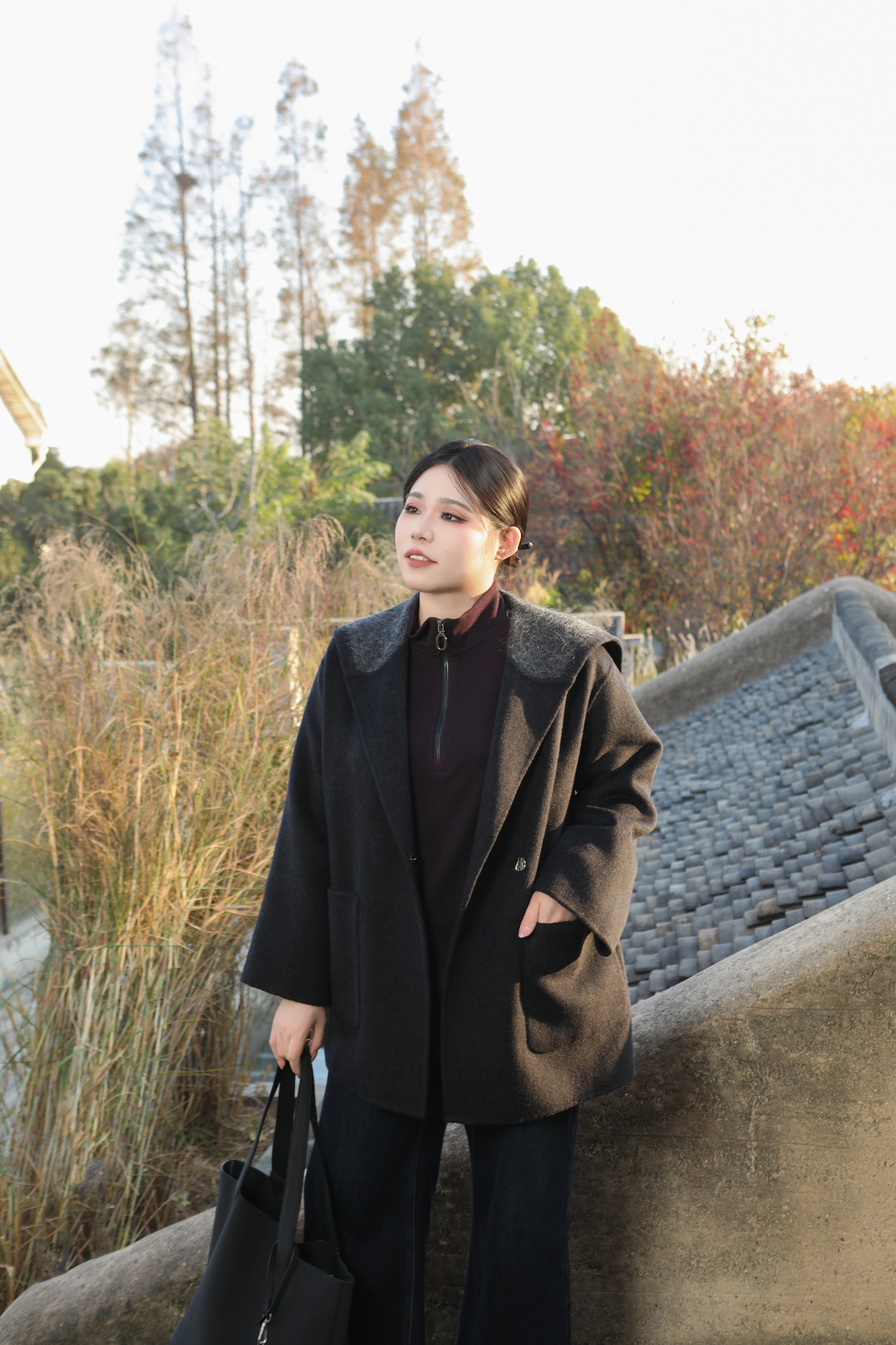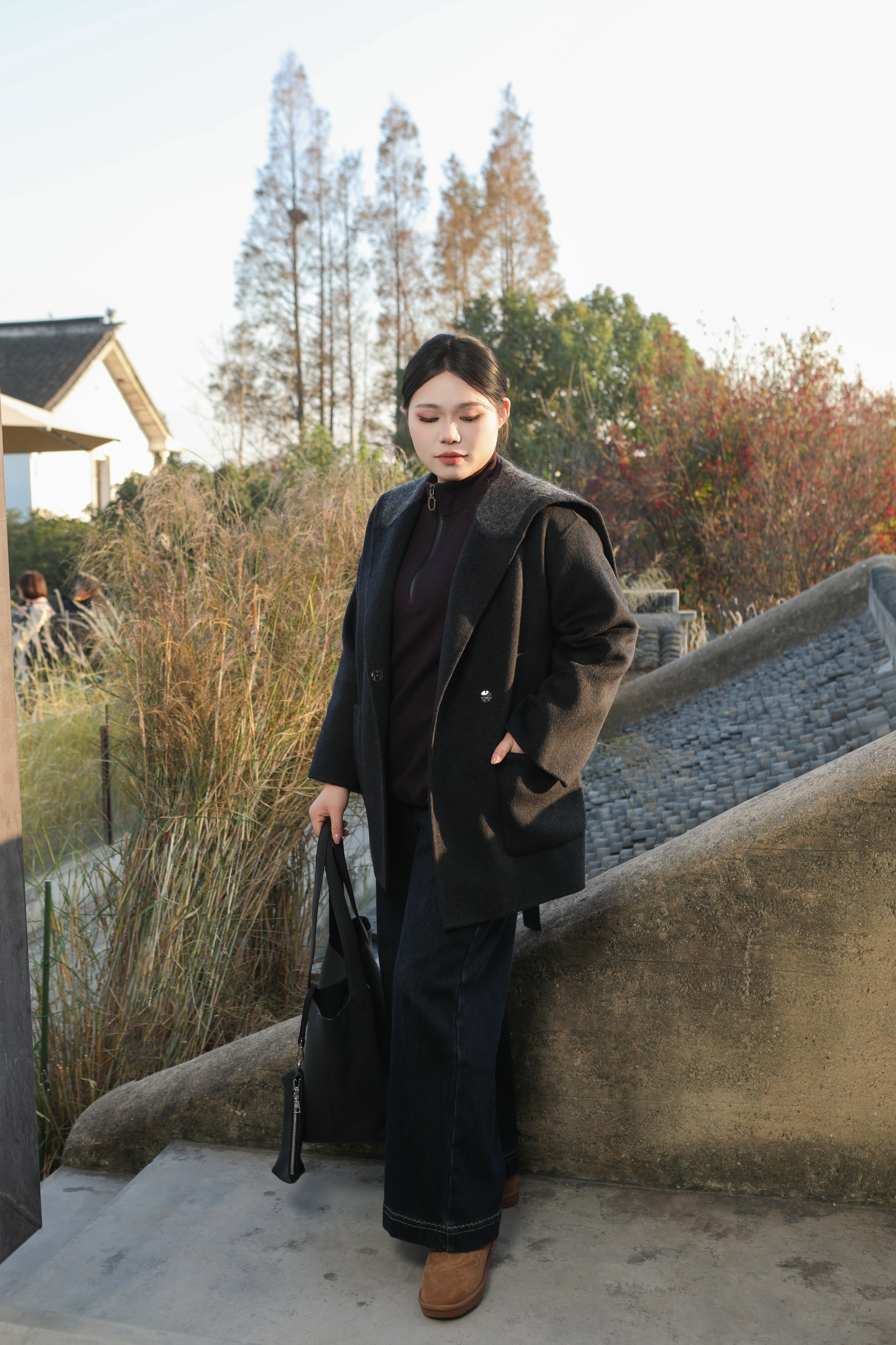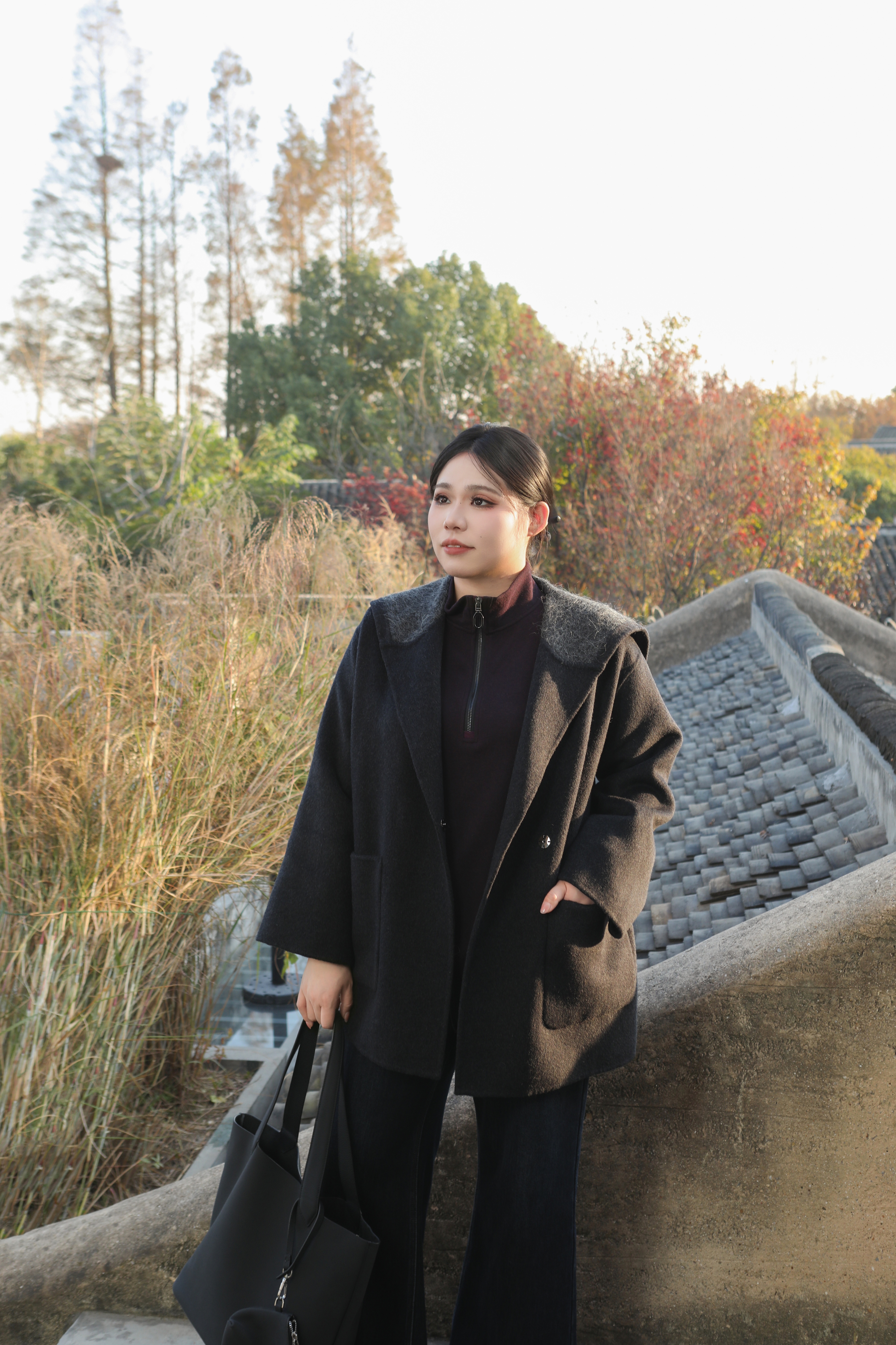 现货,秒拍秒发【绵羊毛双面呢大衣】宽松版,海军领披肩,经典高级黑灰色系,面料无弹,中长款,非常利落的秋冬大衣!面料:75.2%绵羊毛,14.6%聚酯纤维,8.1%莱赛尔,2.1%其他纤维;