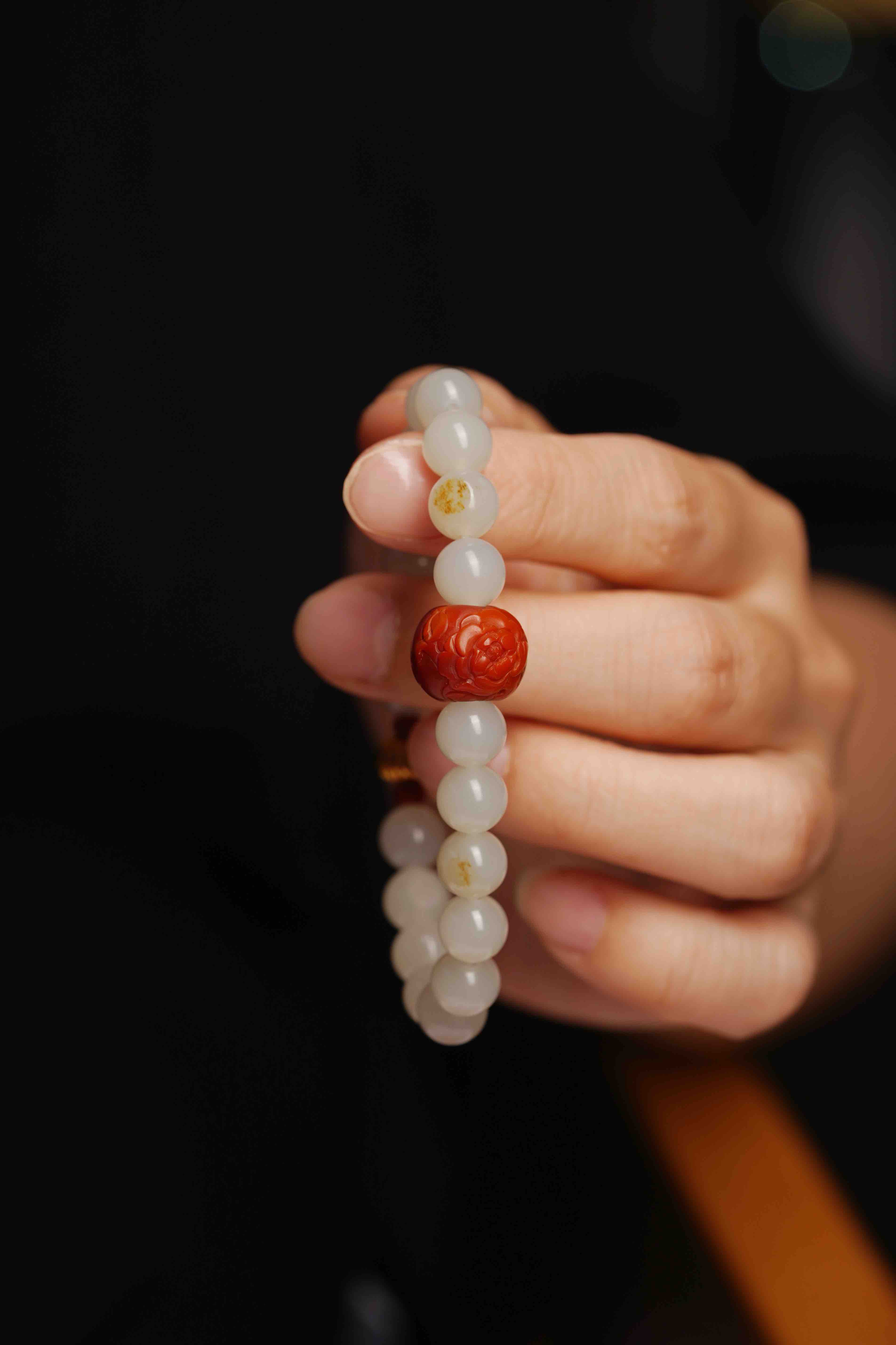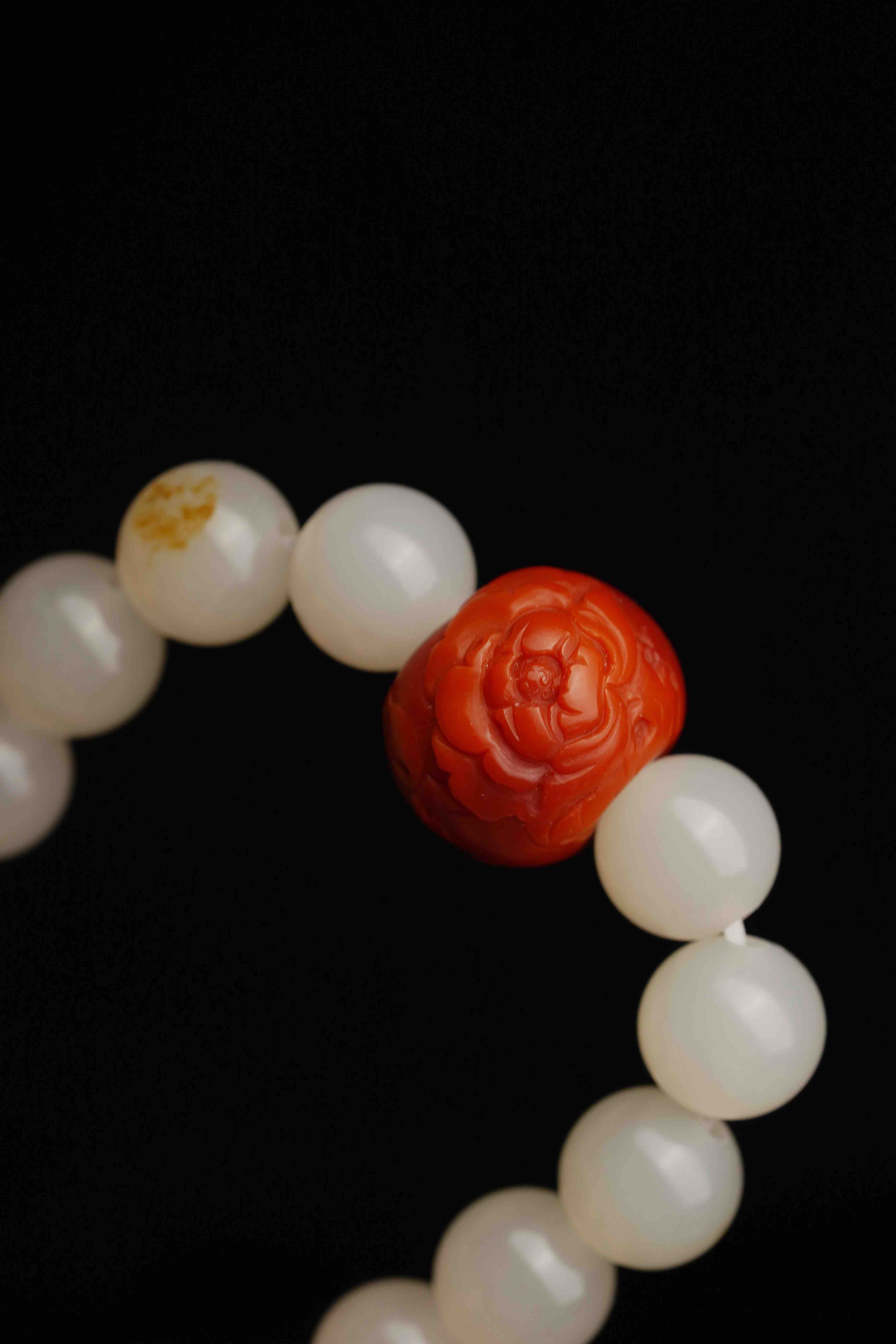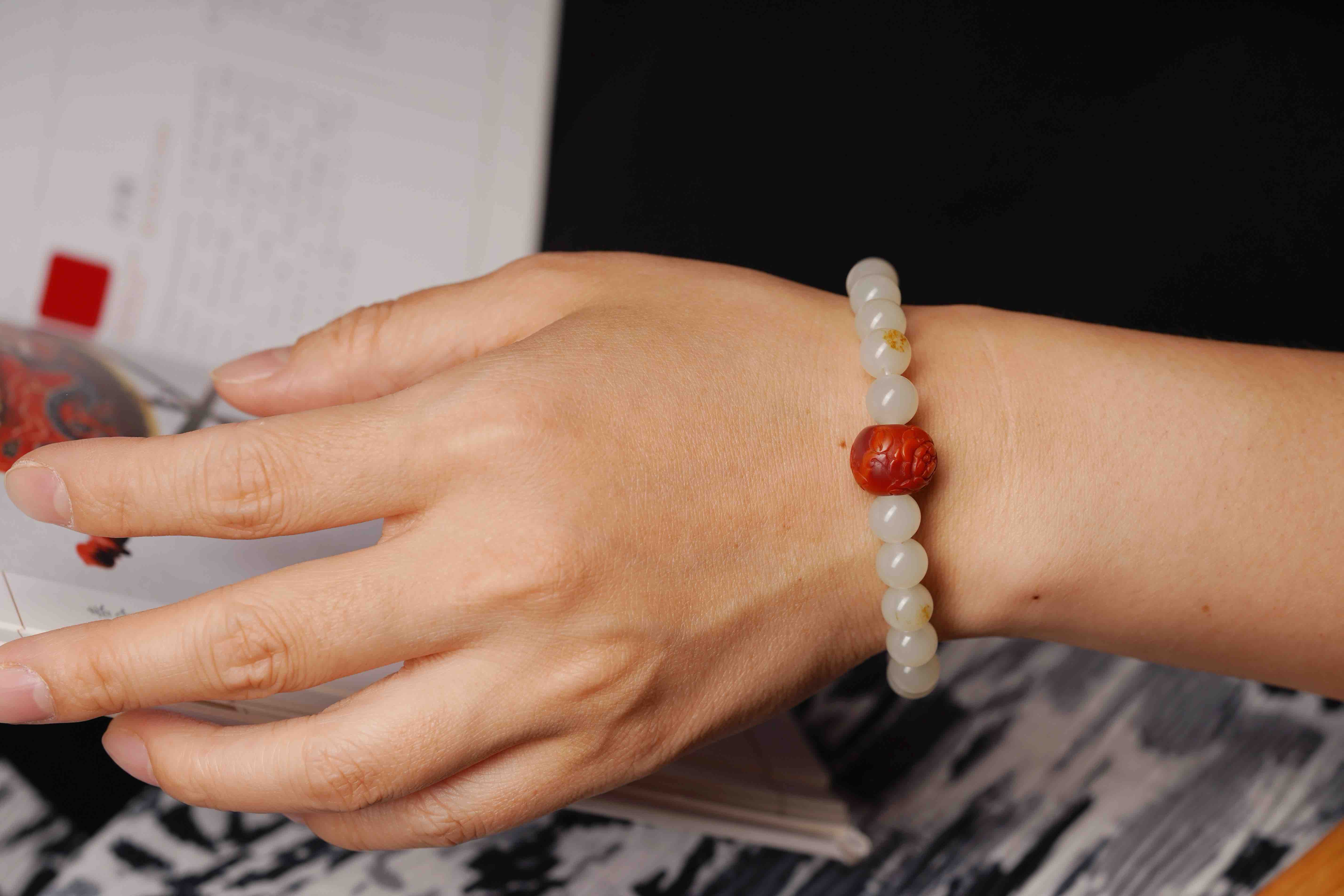 搭配一枚手工雕刻的南红,籽料的圆珠,很难得。