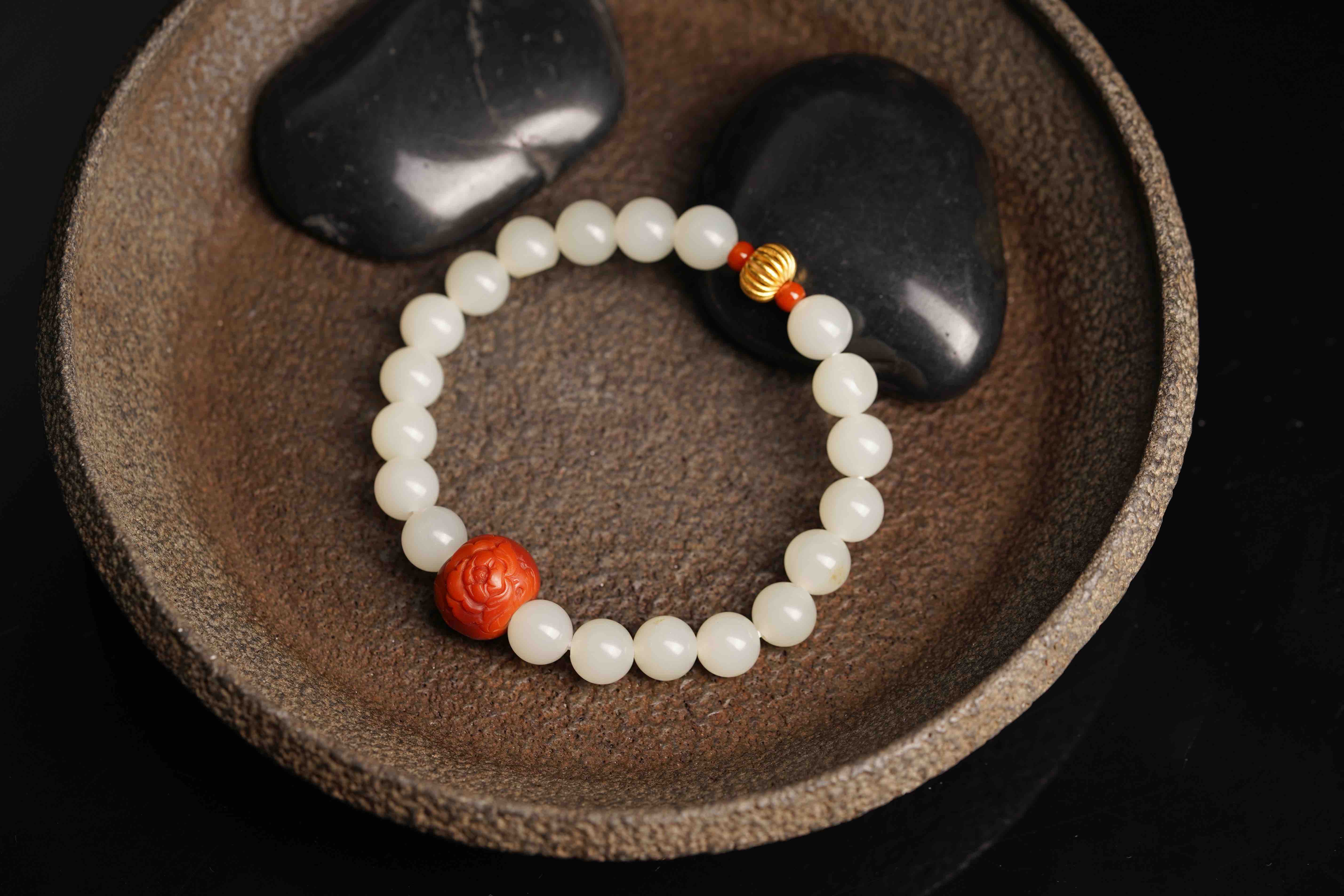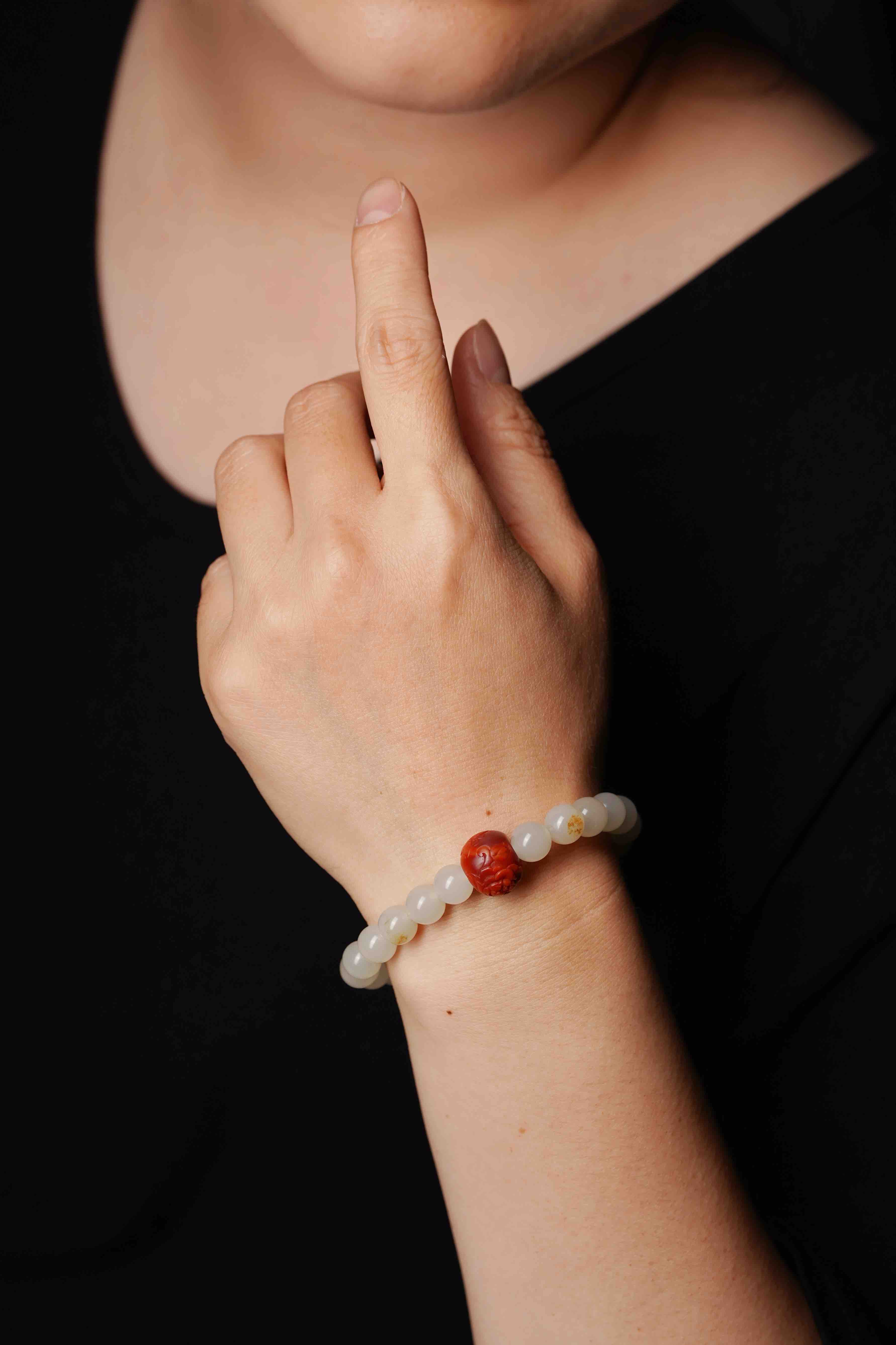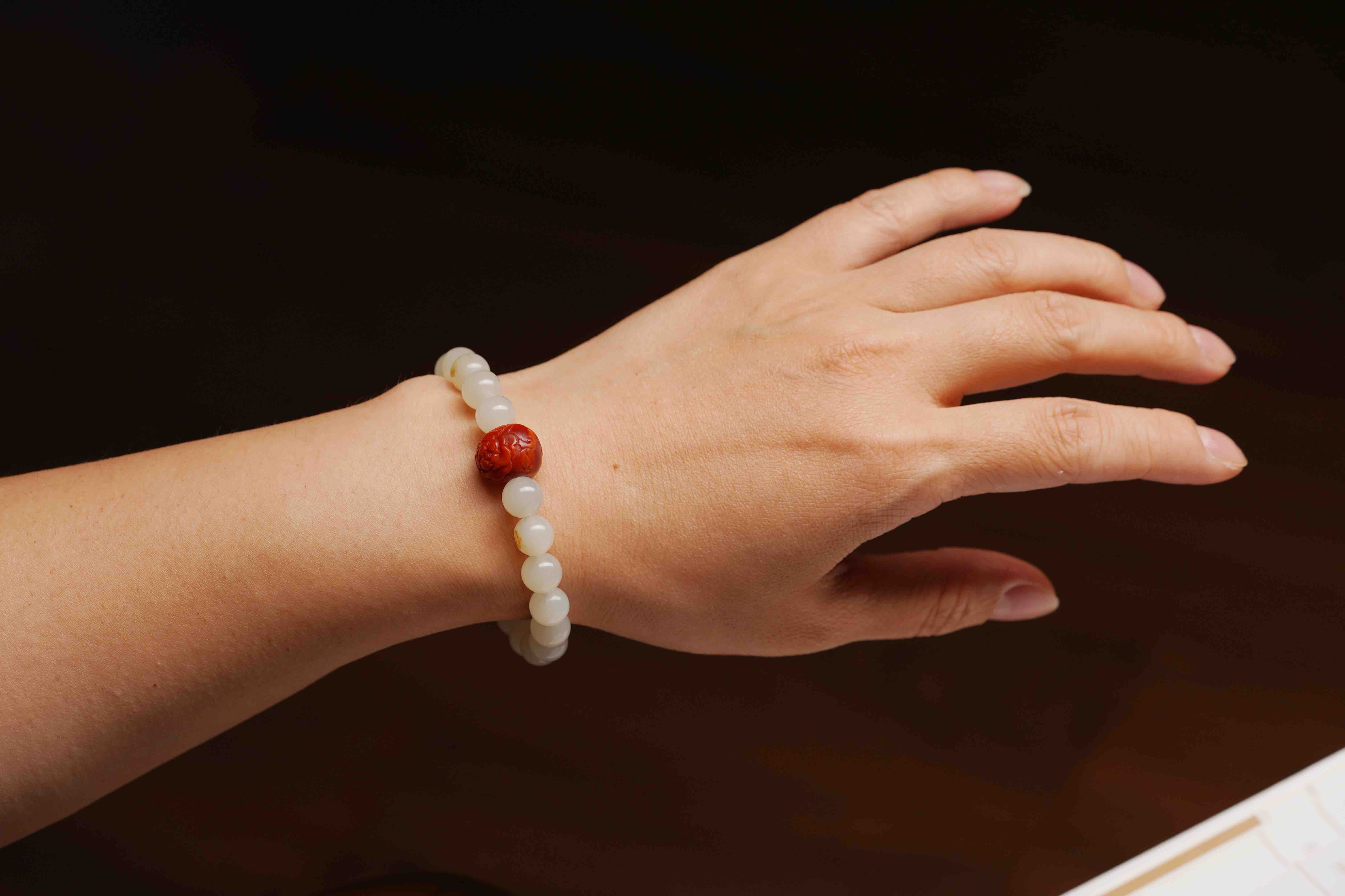 搭配一枚手工雕刻的南红,籽料的圆珠,很难得。