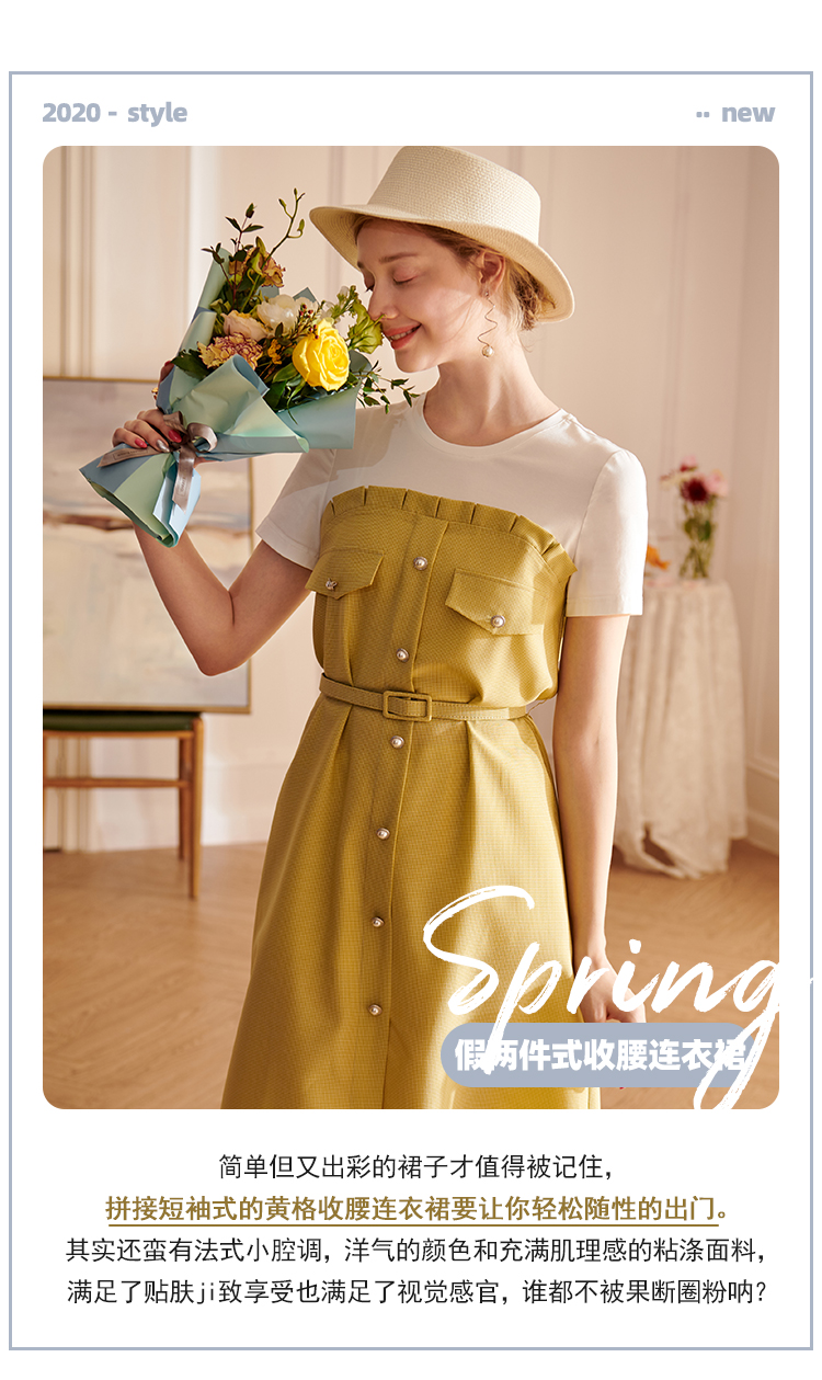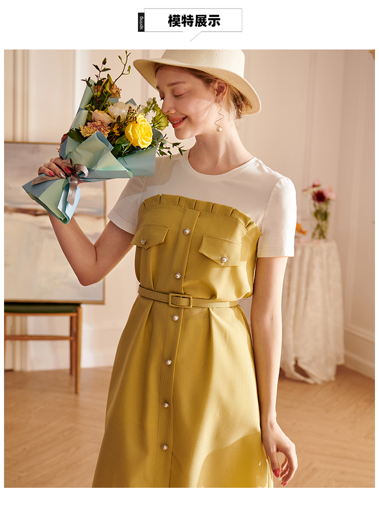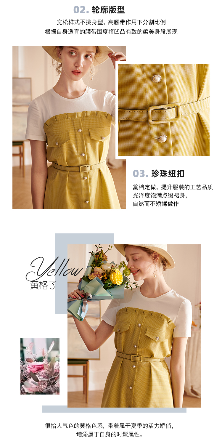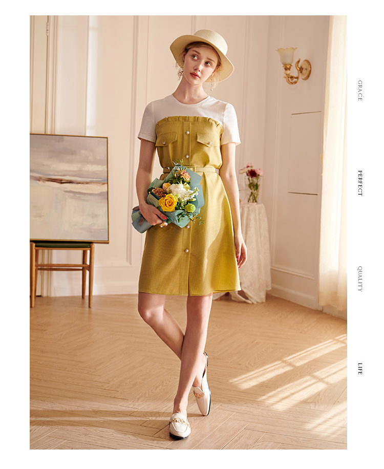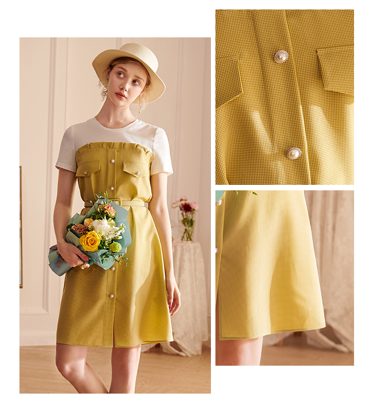 欧芮儿2021夏装新款短袖黄色格子连衣裙女中长款假两件收腰A字裙