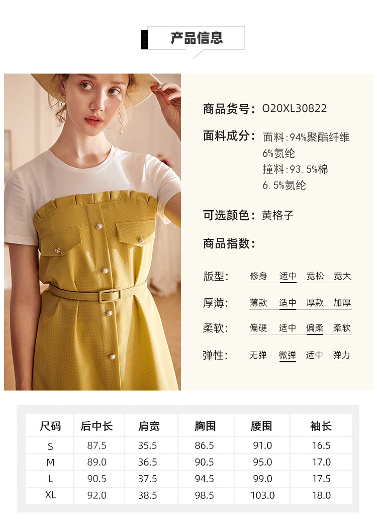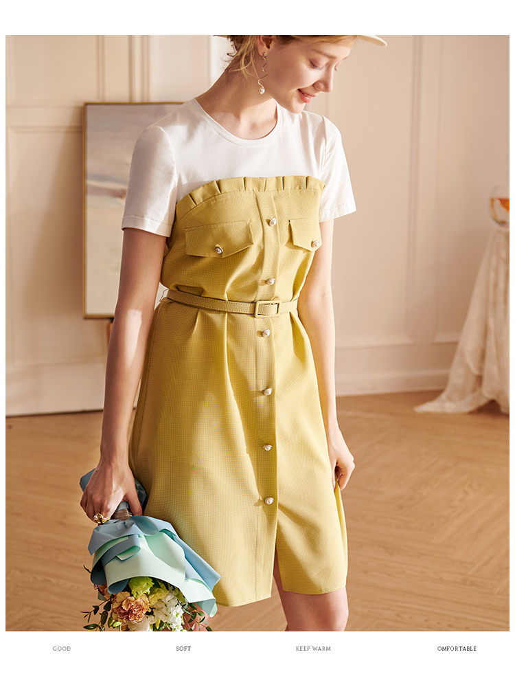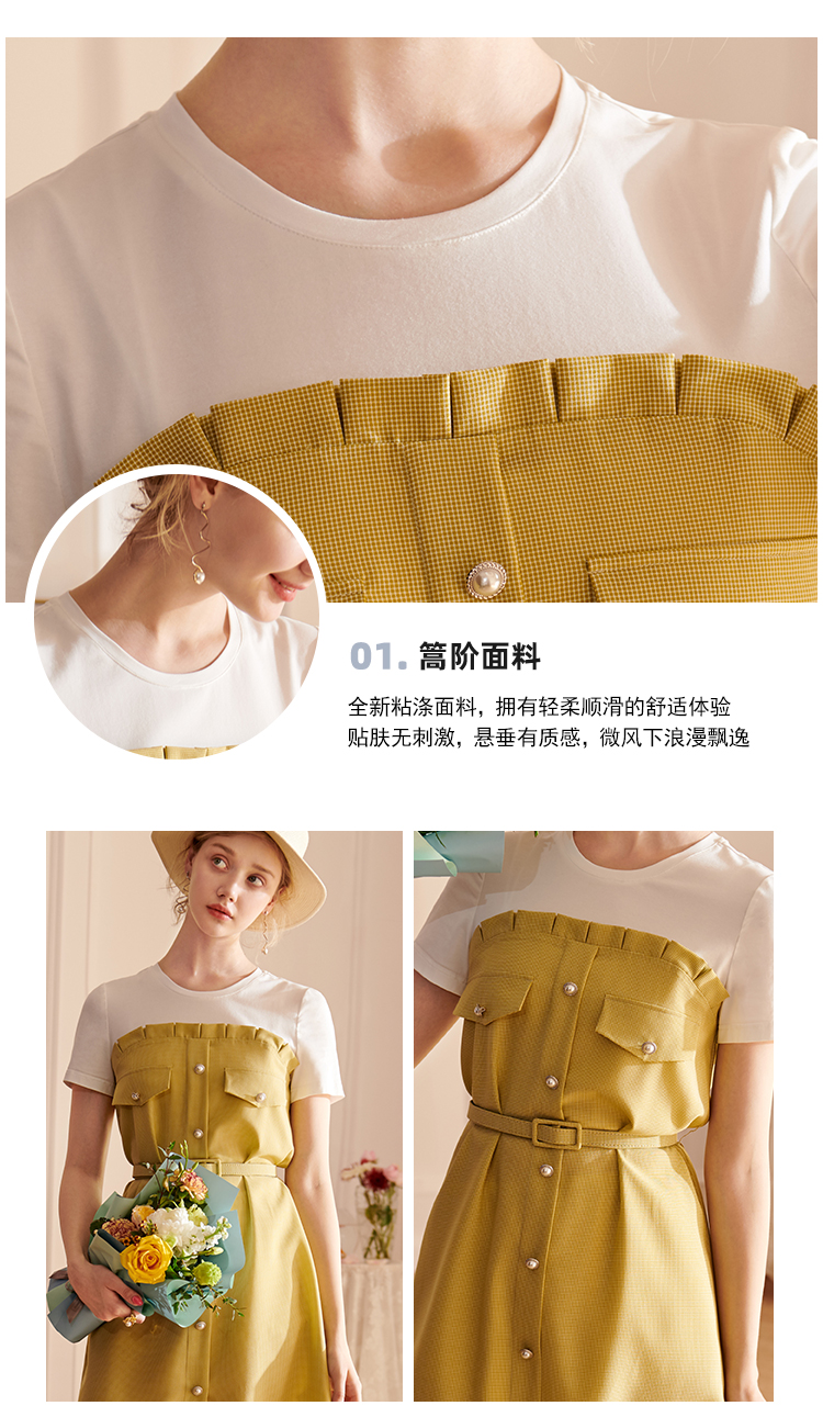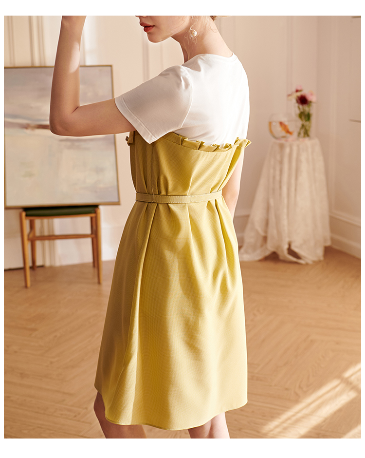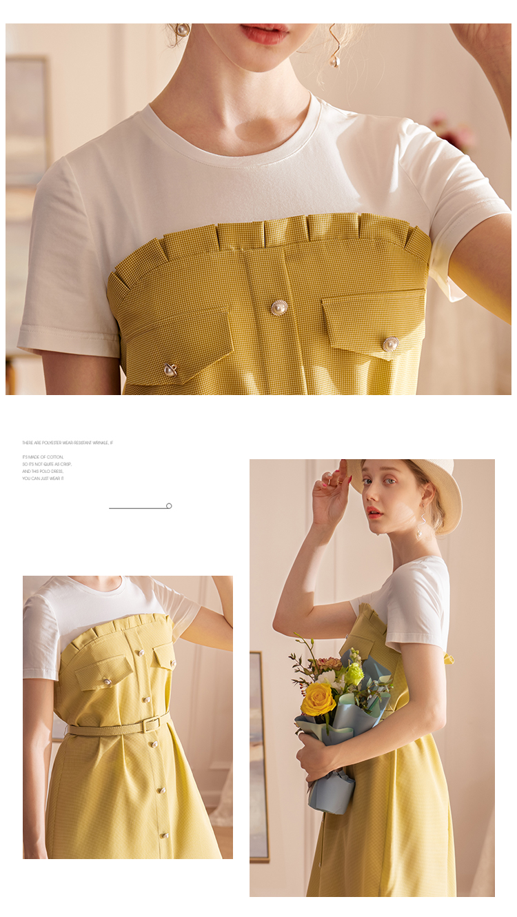 欧芮儿2021夏装新款短袖黄色格子连衣裙女中长款假两件收腰A字裙