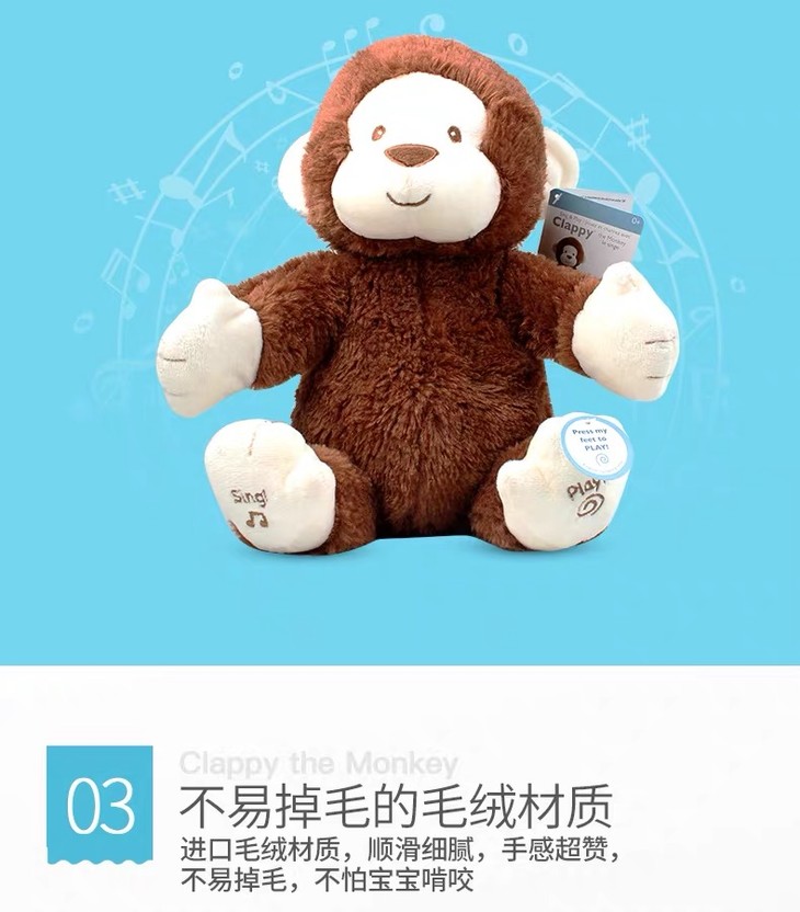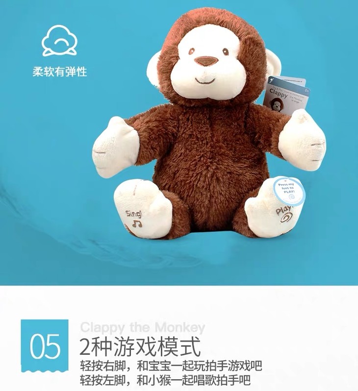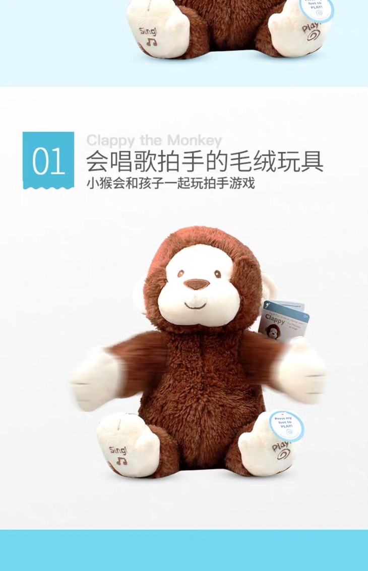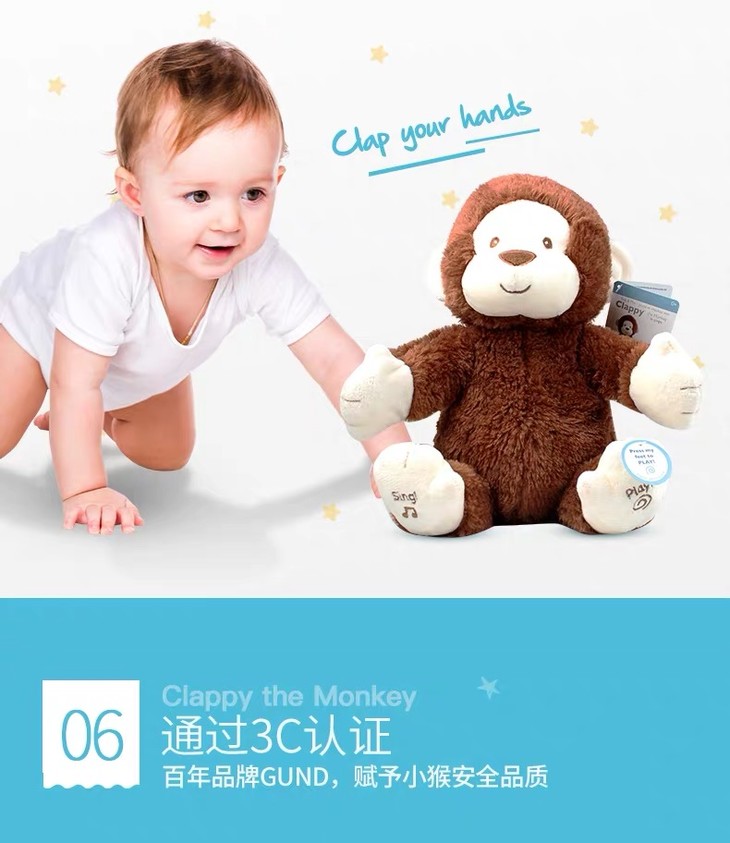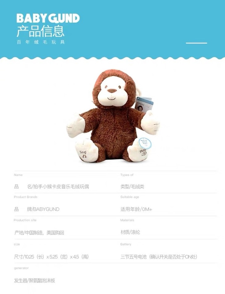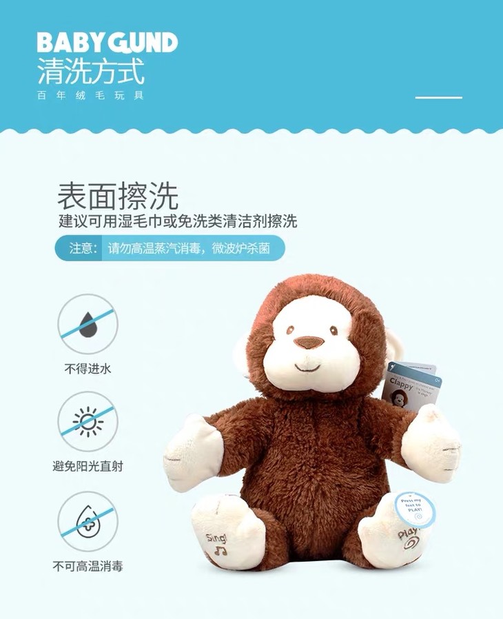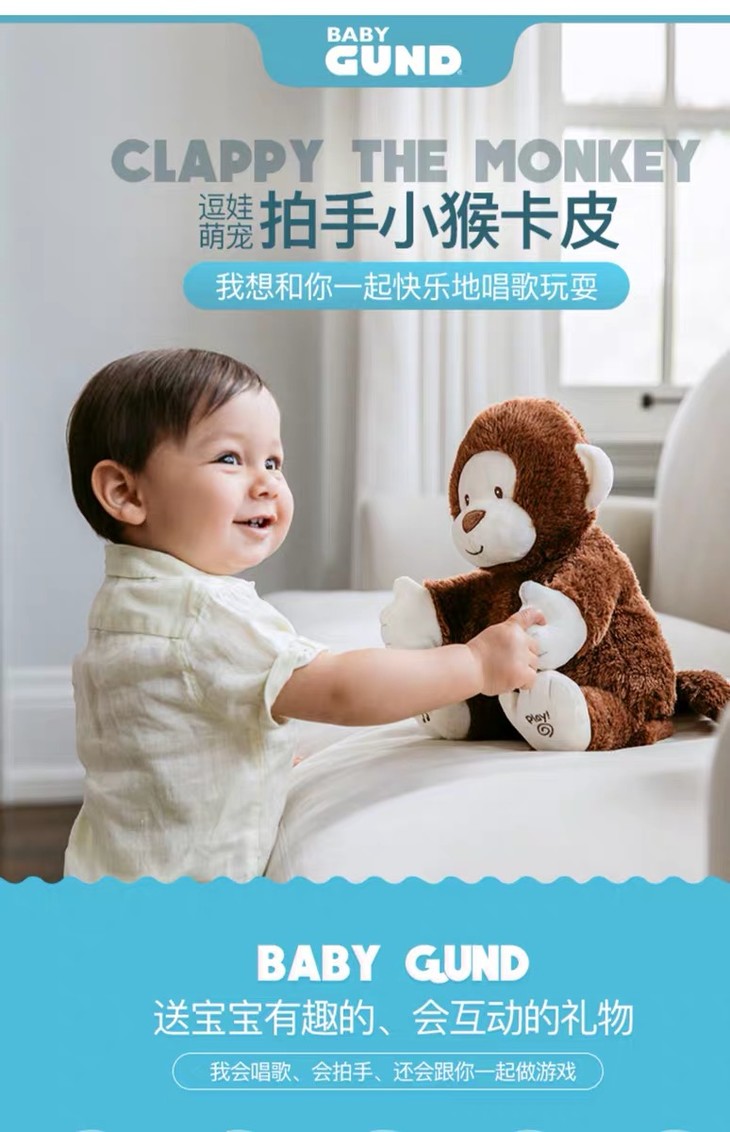 【新品】美国Baby Gund 拍手小猴子儿童安抚玩具会唱歌毛绒音乐玩偶公仔