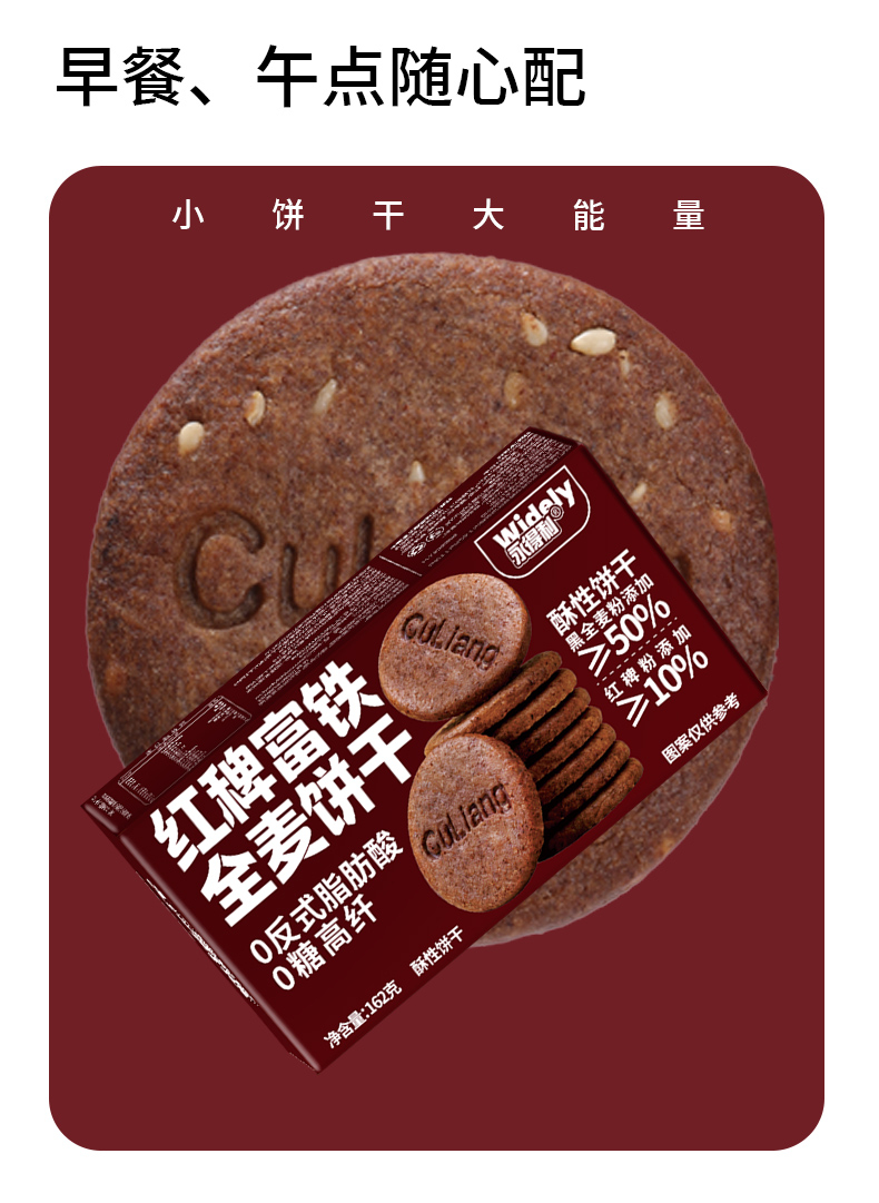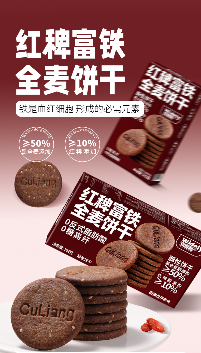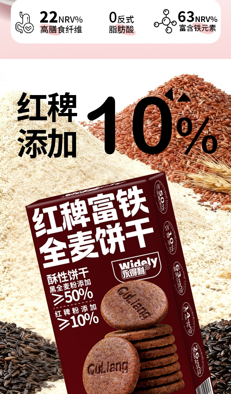 【买2赠1】红稗富铁全麦饼干 铁含量是菠菜的3倍 每百克含9.4毫克铁 且富含叶酸和膳食纤维等