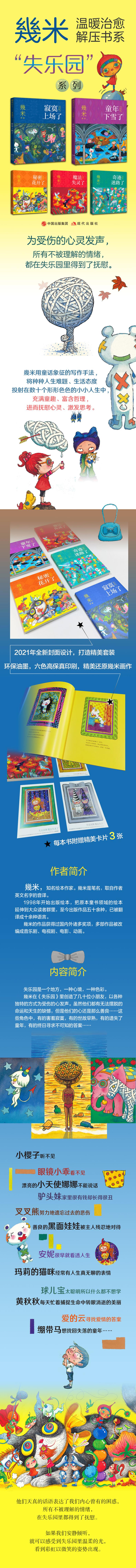 失乐园是一个地方,一种心境,一种色彩。幾米在《失乐园》里创造了数十位小朋友,以各种独特的方式为受伤的心发声。这些角色中,有的害羞寂寞,有的世故早熟,有的遗失了童年,有的终日寻求不可知的答案……他们天真的话语表达了我们内心曾有的困惑,所有不被理解的情绪,在失乐园里都得到了抚慰。如果我们安静倾听,就可以感受到失乐园里温柔的光,看到彩虹以微笑的姿势出现。安妮四岁时就知道美丽具有神奇的魔力,许多人的一生都在追求美丽。她喜欢走进美丽的花园,在美丽的花朵旁边留下美丽的倩影,只可惜她刻意的笑容里提早出现了世故的沧桑。安妮很早就看透人生;玛莉的猫咪经常有人生真无聊的表情;球儿宝太聪明所以什么都不想学;飞飞儿喜欢唱反调;红喇叭、木马头小朋友有莫名的执著……他们共同的语言是寂寞。