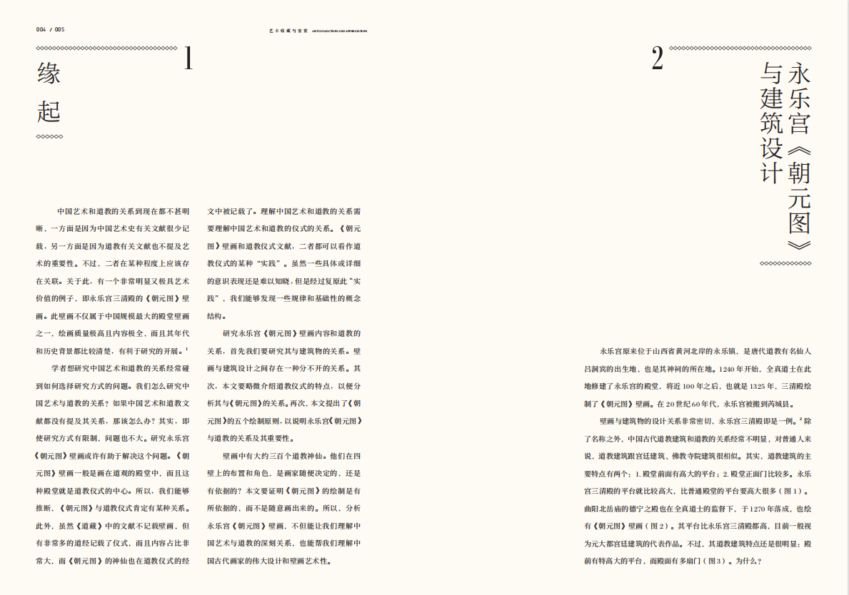 本期的 7 篇文章均围绕永乐宫的建筑形制和壁画展开,对永乐宫进行了整体而全面的解读,其中 3 篇论文针对三清殿壁画的神祇组合,另外 4 篇论文重在探讨重阳殿和纯阳殿的纪传类图像。本期之所以选取以上论文,主要是考虑到以下两个方面:其一,集中介绍海内外中青年学者有关永乐宫壁画研究的最新成果;其二,在众多研究成果中,择取与永乐宫壁画朝元主题和全真宗祖构成密切相关的部分,重点突出元朝时期的全真教在营建永乐宫三座主要殿堂时的设计理念,凸显三清殿朝元队伍与作为全真教宗祖序列的钟离权、吕洞宾、刘海蟾和王重阳及其七位弟子之间的密切关系,挖掘这些图像背后的精神、观念以及创建者高超的技艺与匠心。