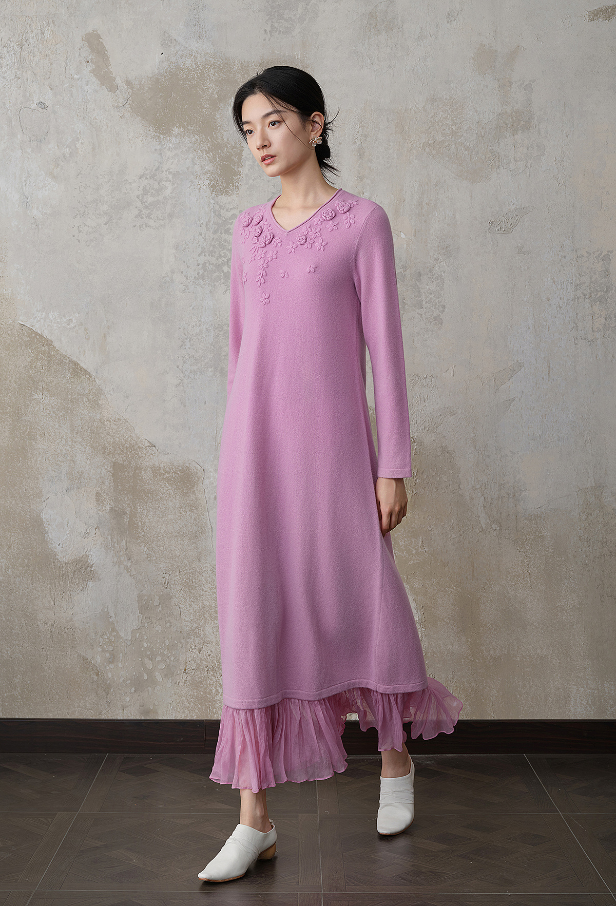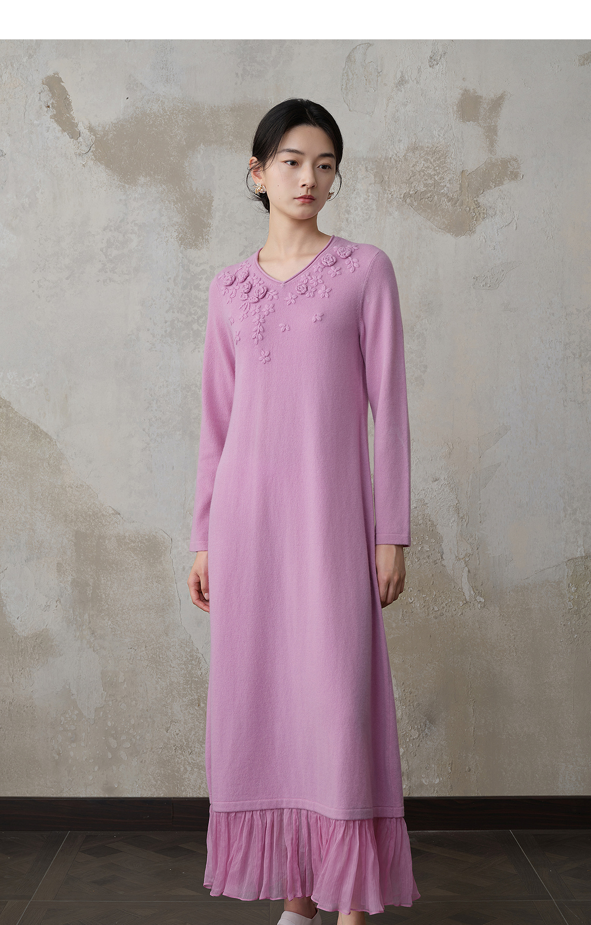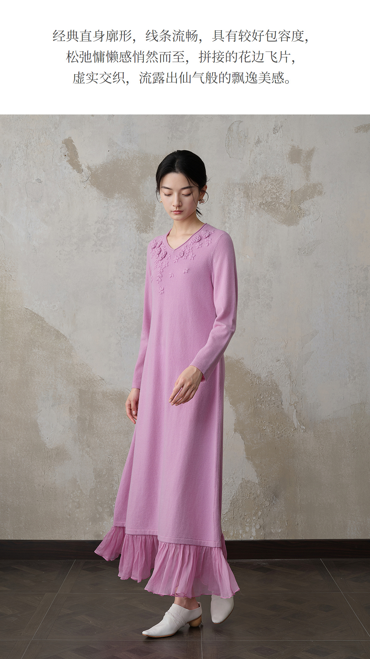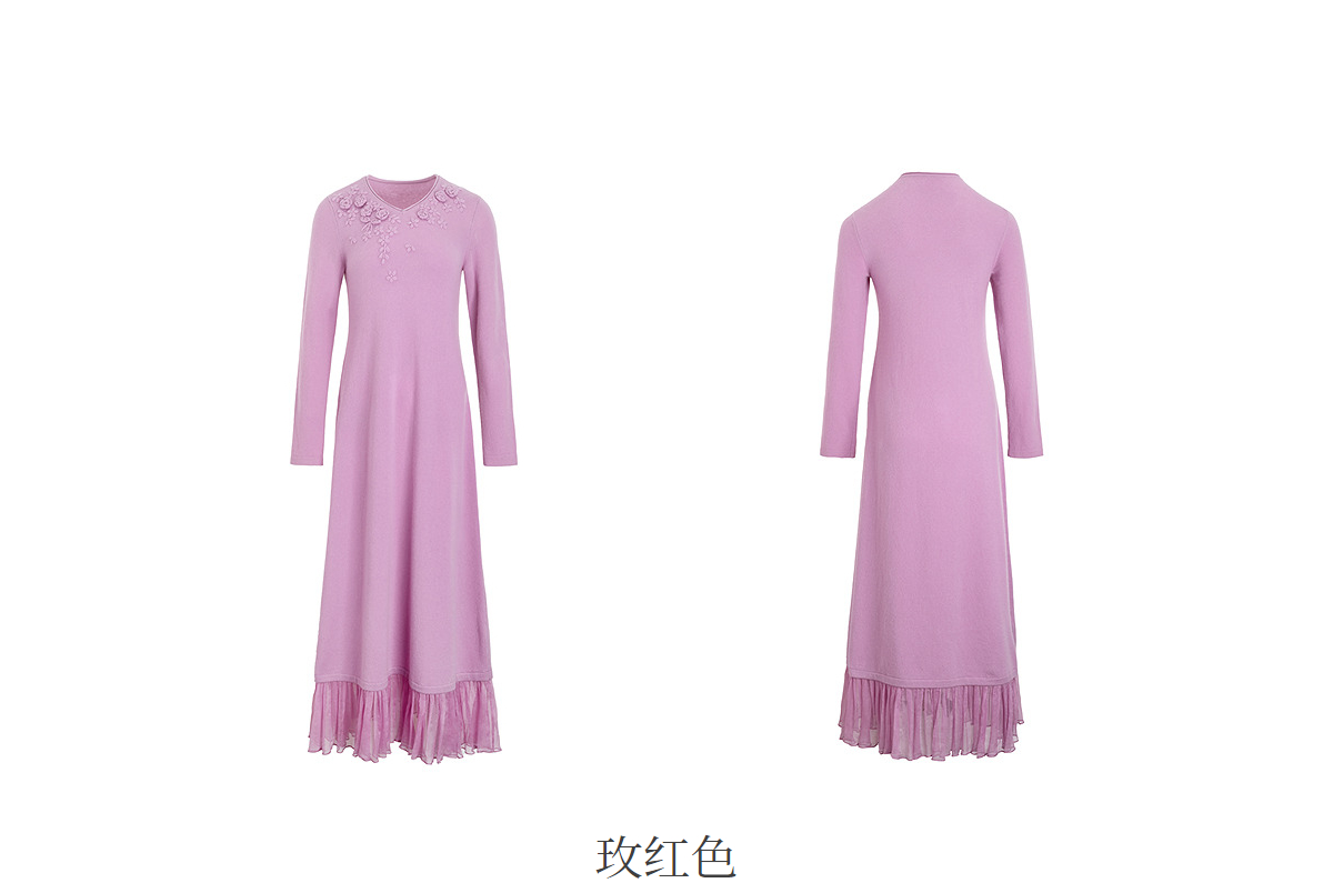 【林栖设计小店】(现货)【手工钩花】木槿粉听风系列绵羊毛连衣裙拼桑蚕丝2025秋冬新款毛织长裙1954061