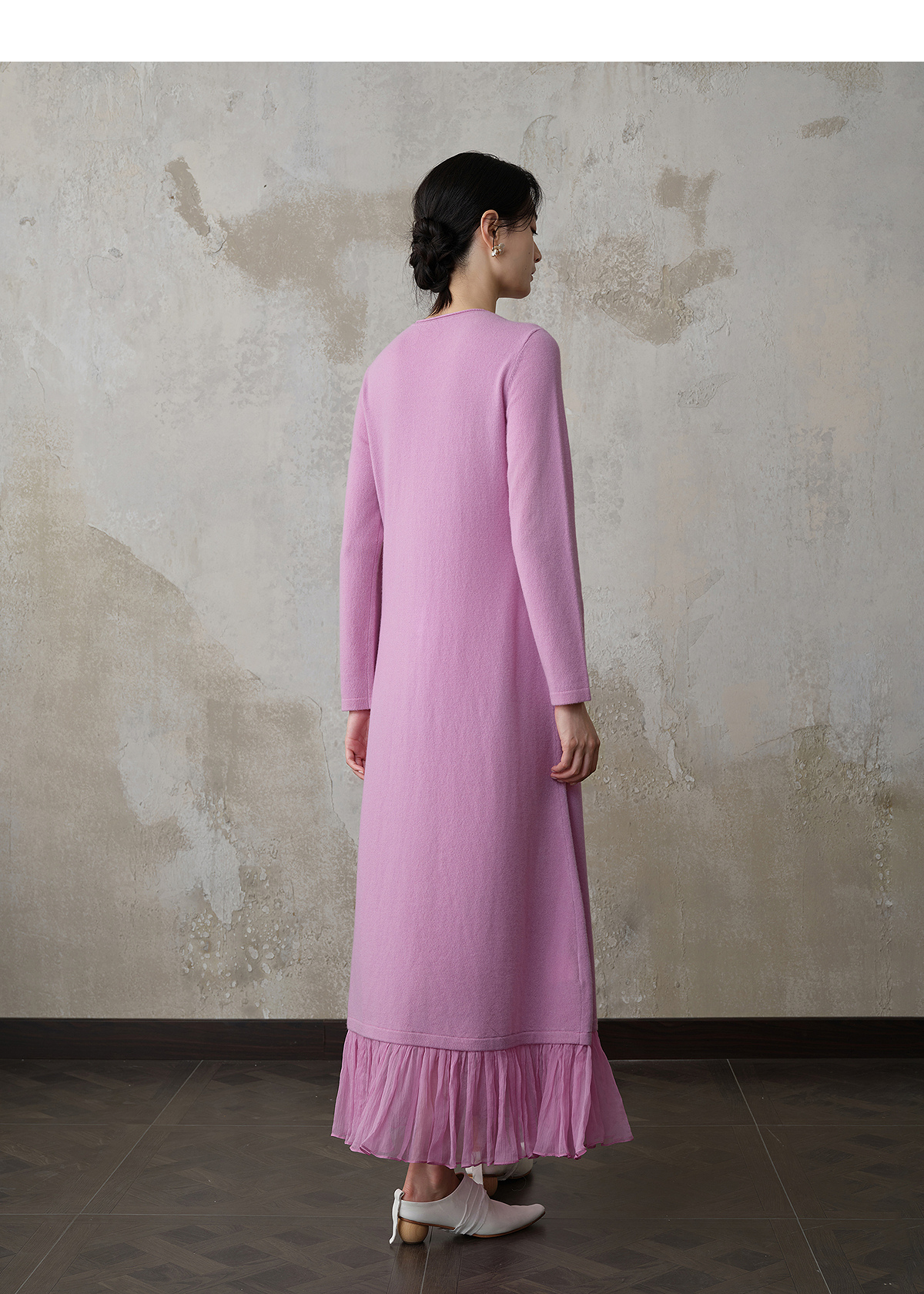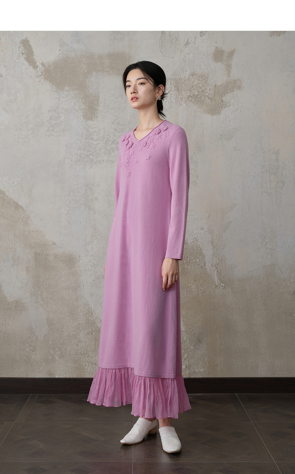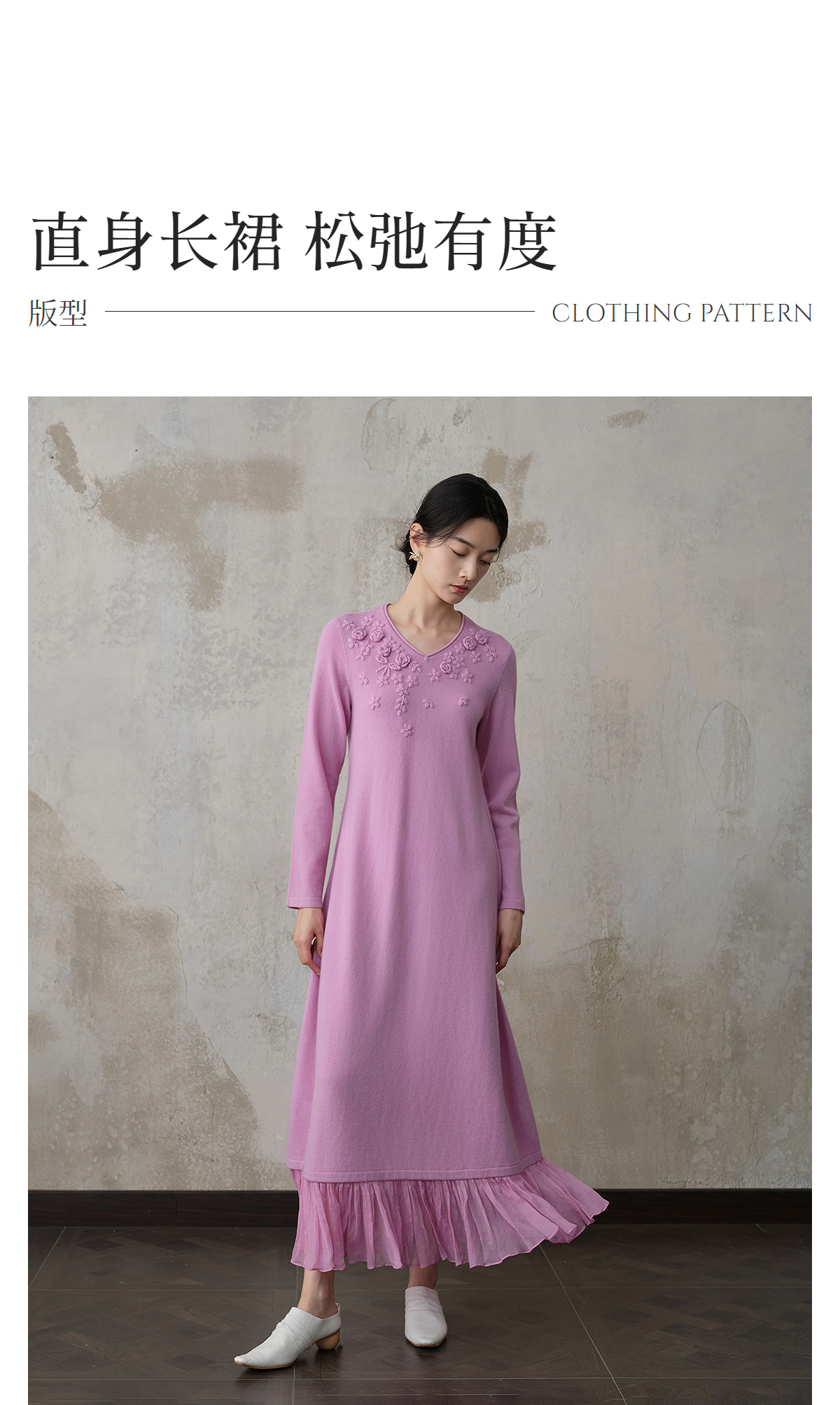 【林栖设计小店】(现货)【手工钩花】木槿粉听风系列绵羊毛连衣裙拼桑蚕丝2025秋冬新款毛织长裙1954061