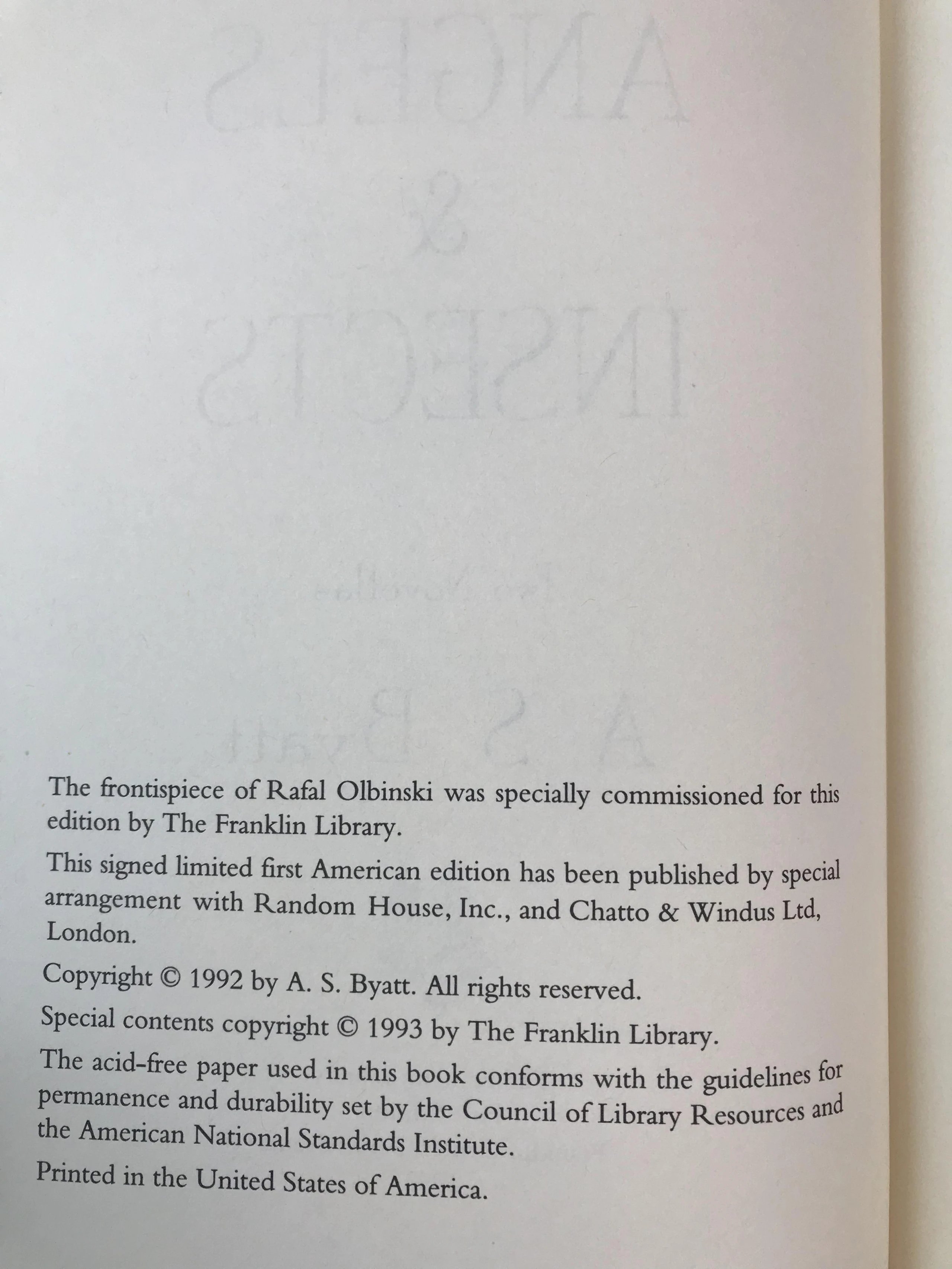签名首版!限量版!A・S・拜厄特《天使与昆虫》配插图 富兰克林图书馆豪华皮装本