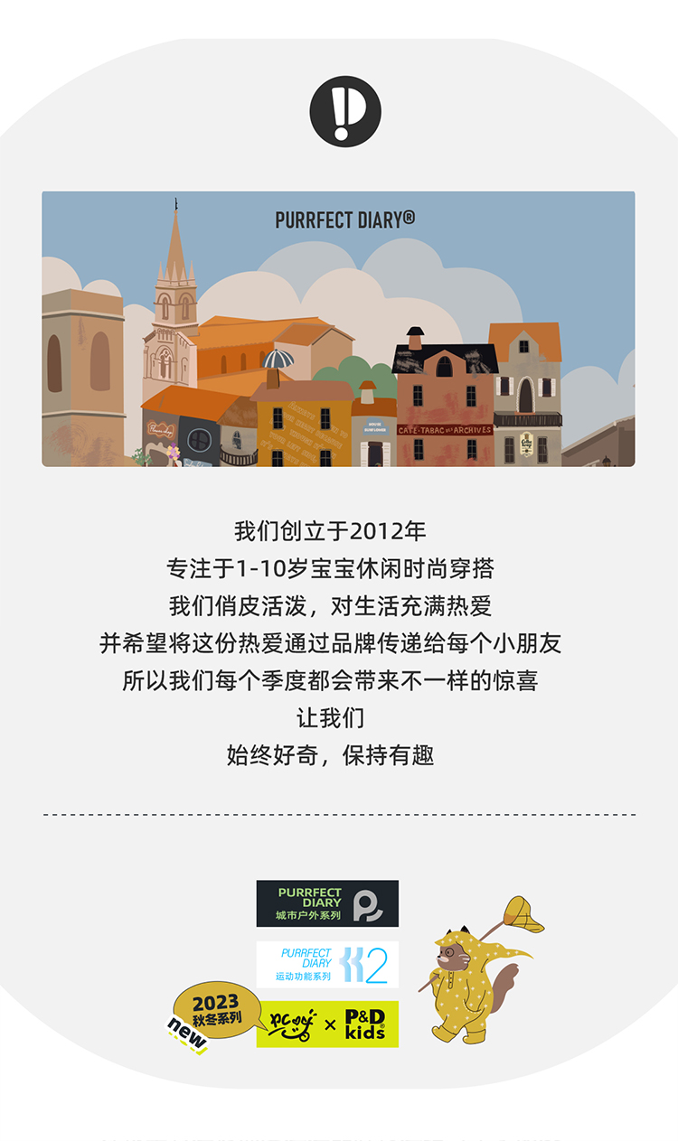 - Purrfect-Diary专注于贴近自然随性的穿着概念,轻奢平价的童装文化传播,在产品设计上更加注重婴童穿着的舒适性、安全性、更出众的国际化品牌,将欧美的育婴文化在中国进行深入的传播与推广。