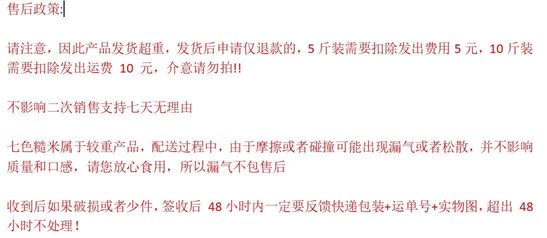 请注意,因此产品发货超重,下单了发货后申请仅退款的,5斤装需要扣除发出费用5元,10斤装需要扣除发出运费10元,介意勿拍