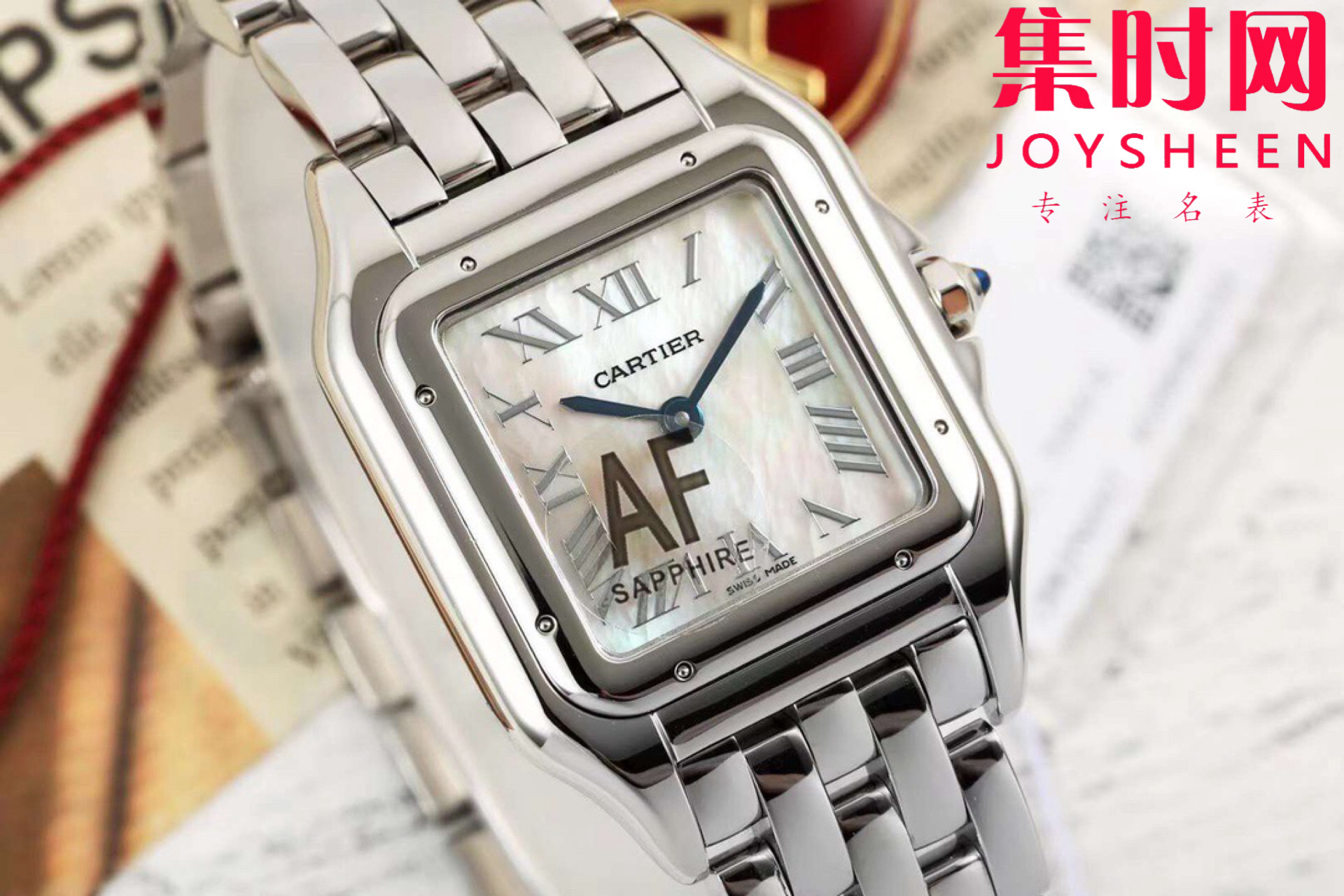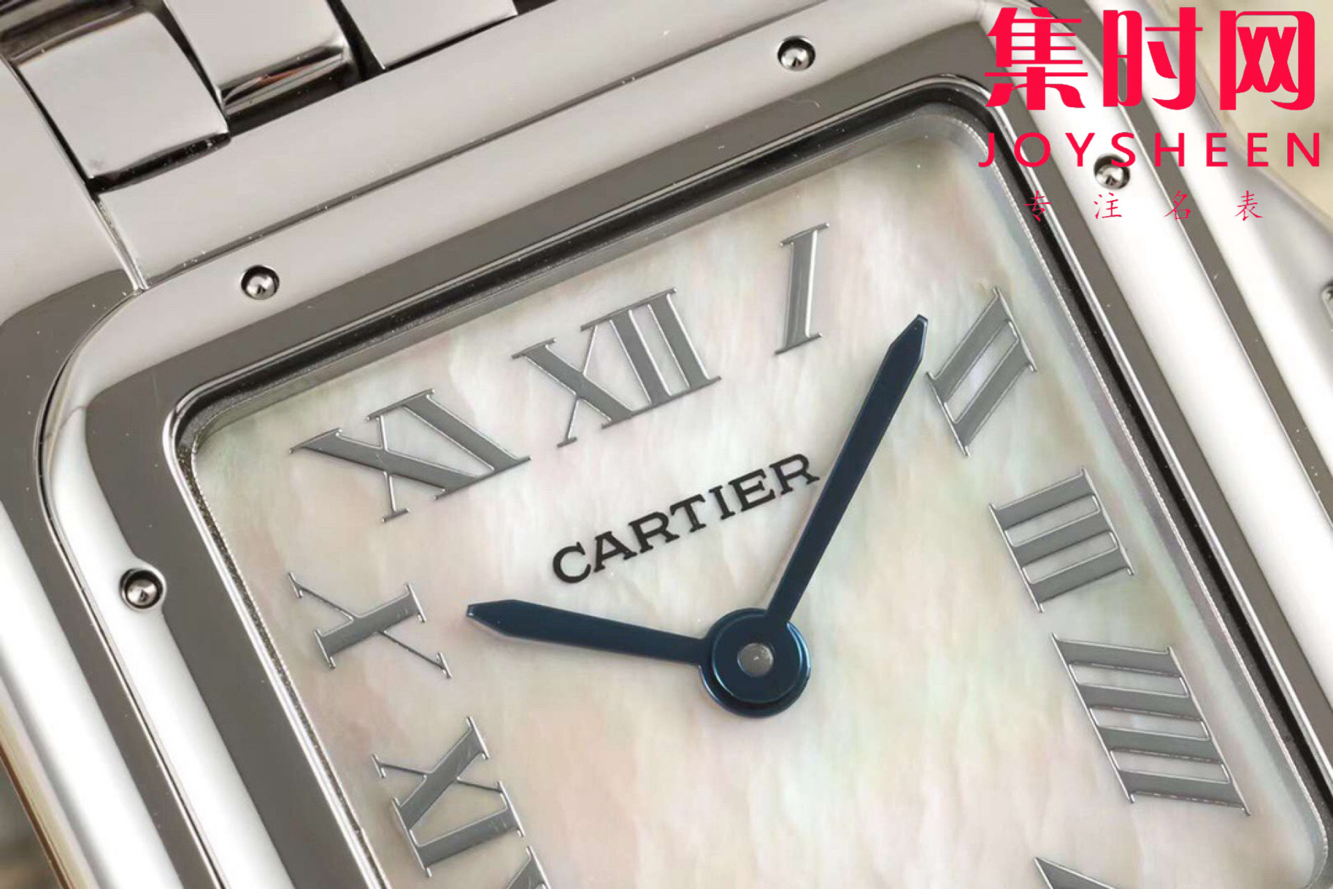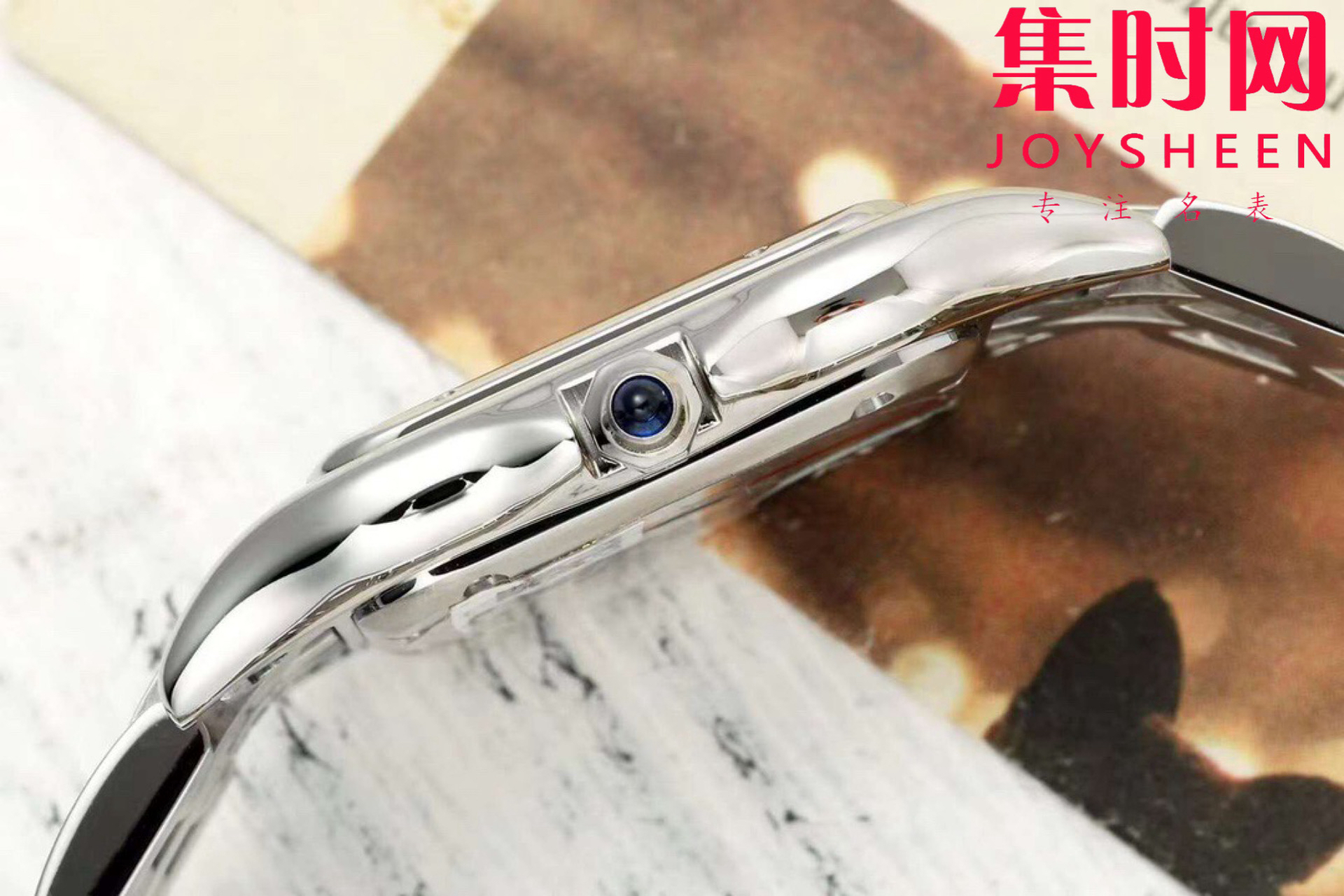 【表盘】镀银表盘上分布着罗马数字时标,卡地亚标志性剑形蓝钢指针跃动与表盘之上。表冠镶嵌一颗合成蓝色尖晶石,华丽而不羁。