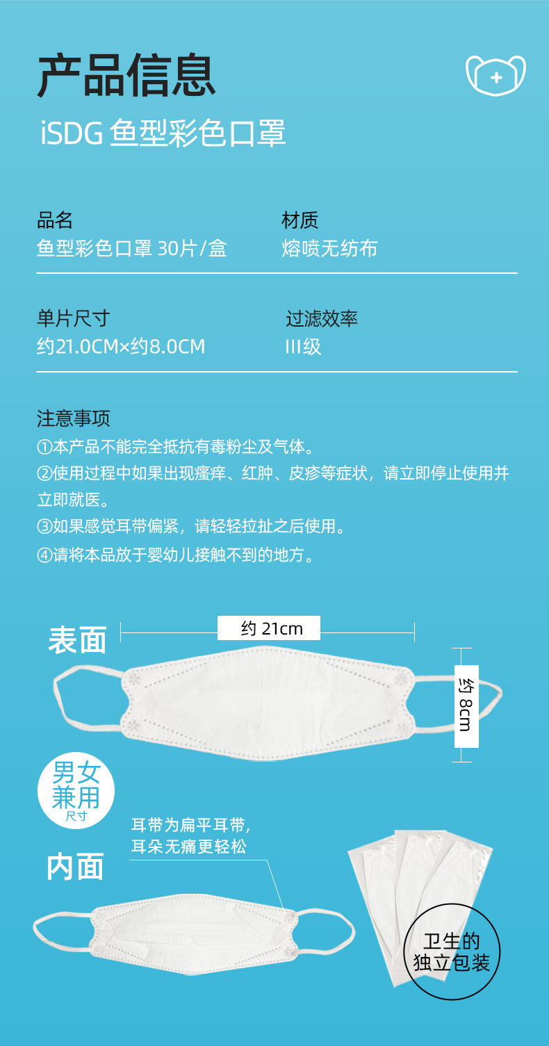 ISDG 日本品牌监制 鱼嘴形柳叶形口罩30枚/盒黑白灰粉黄多色 显脸小
