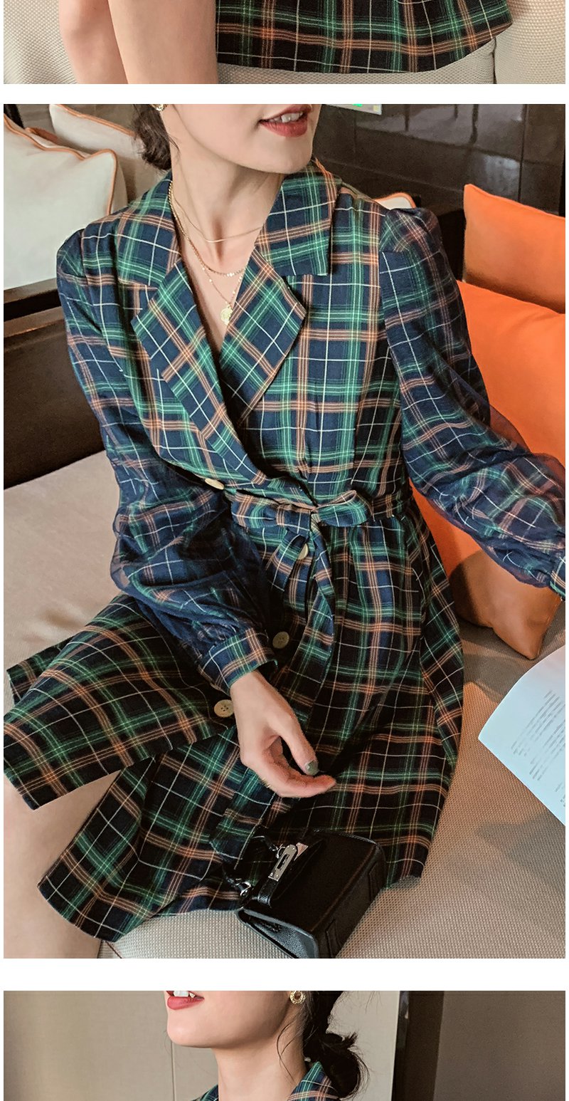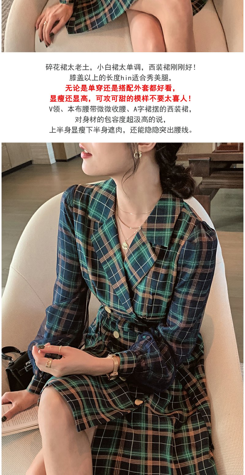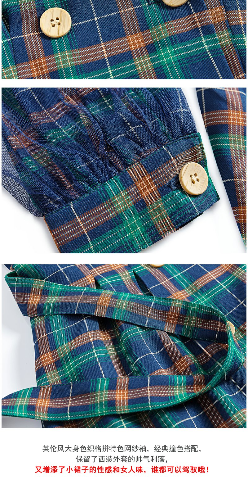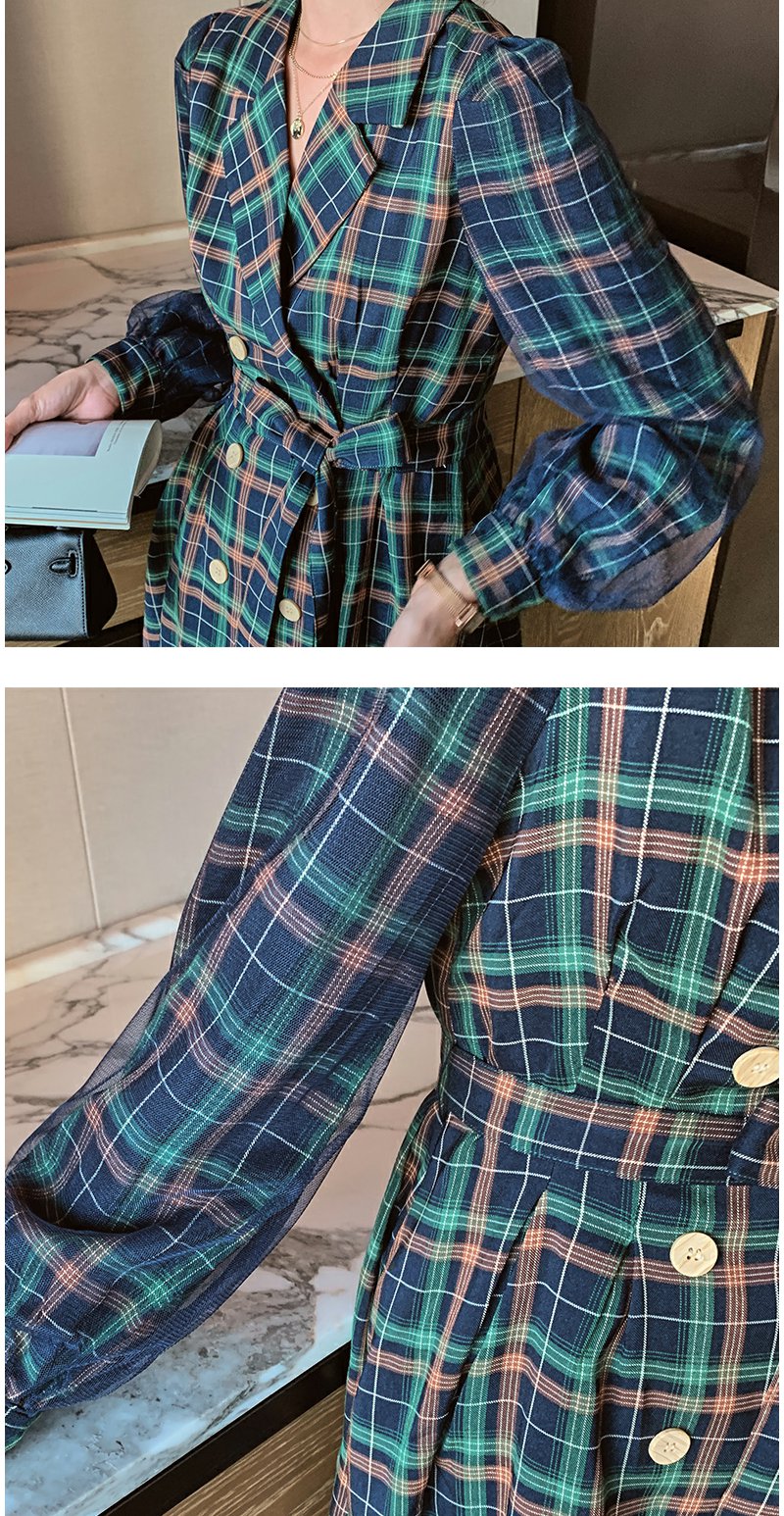 欧芮儿格子西领连衣裙女中长款早新品长袖收腰风衣型裙子