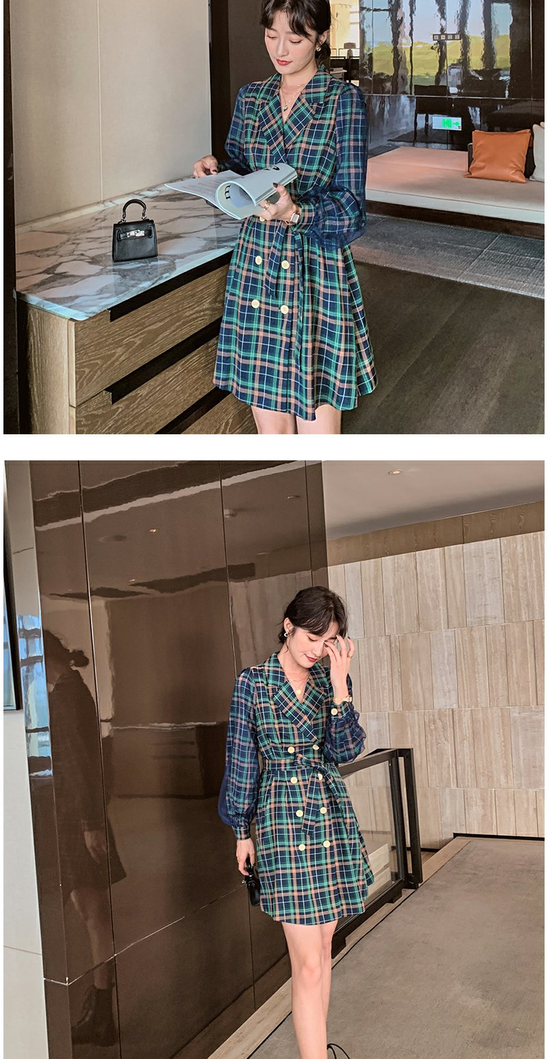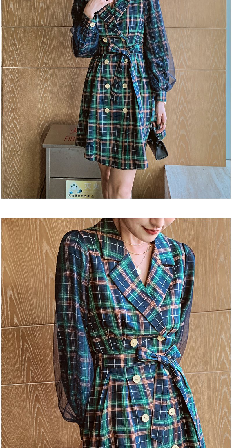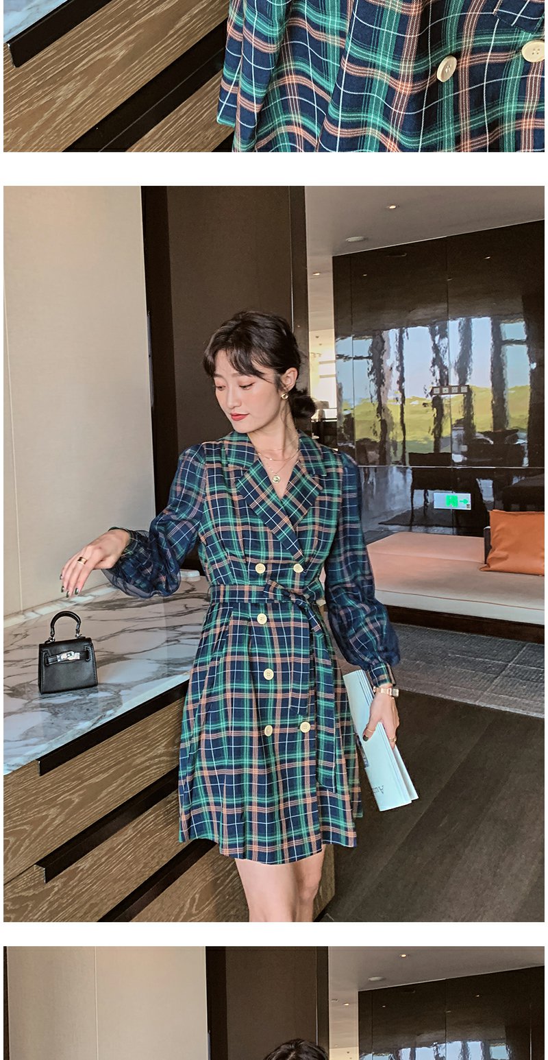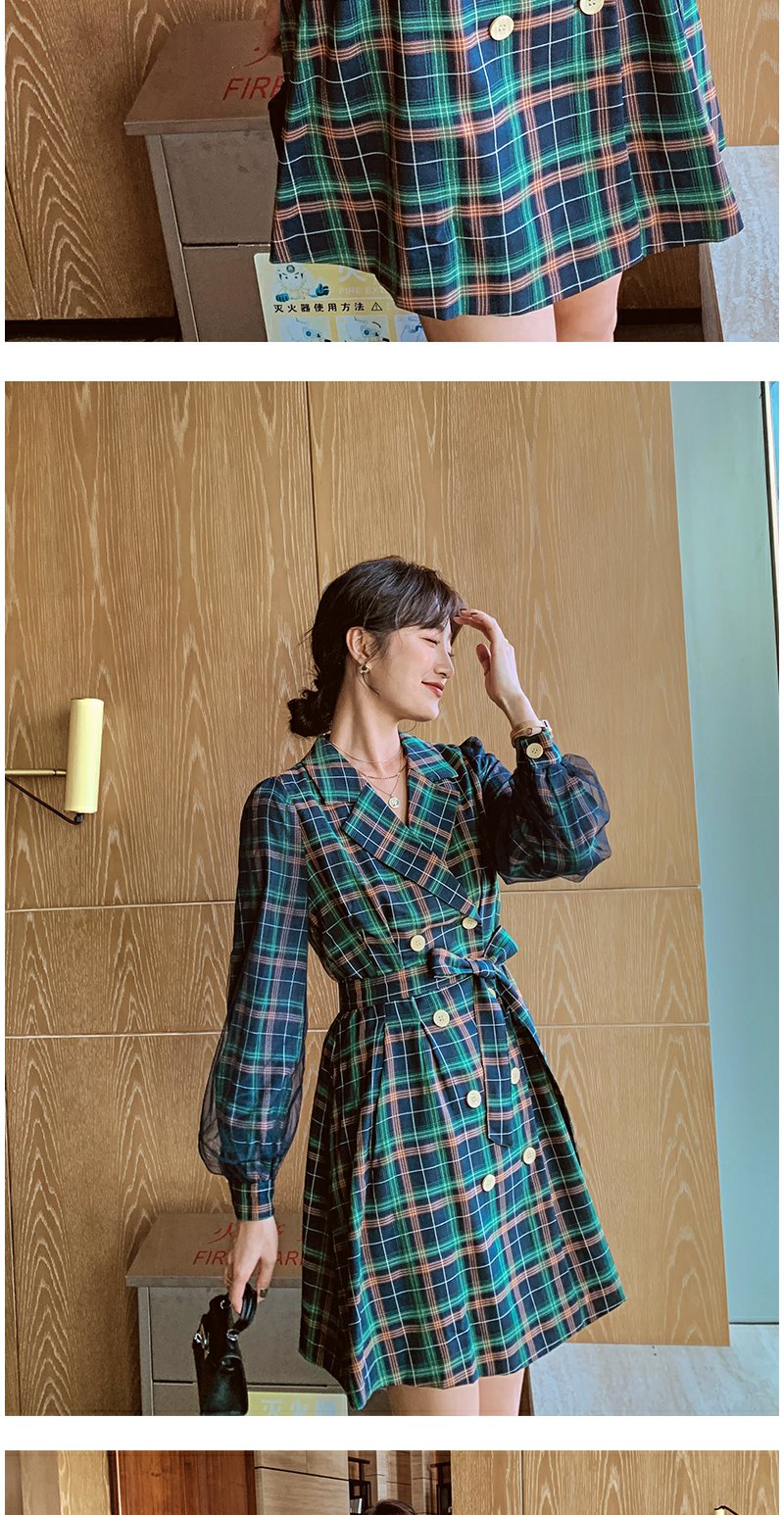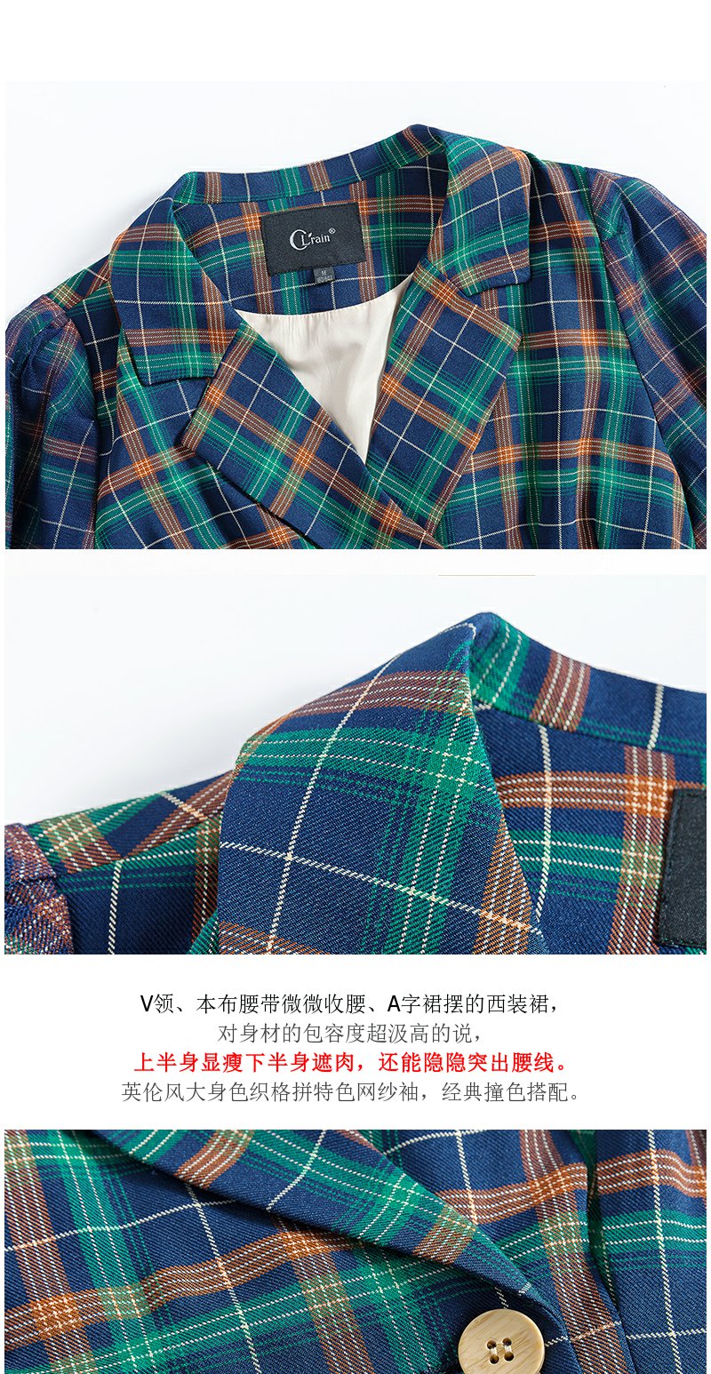 欧芮儿格子西领连衣裙女中长款早新品长袖收腰风衣型裙子