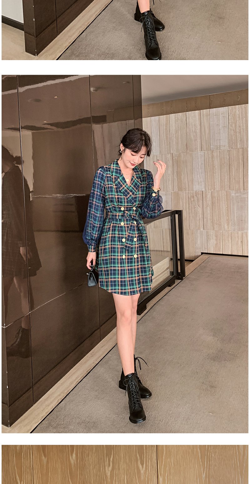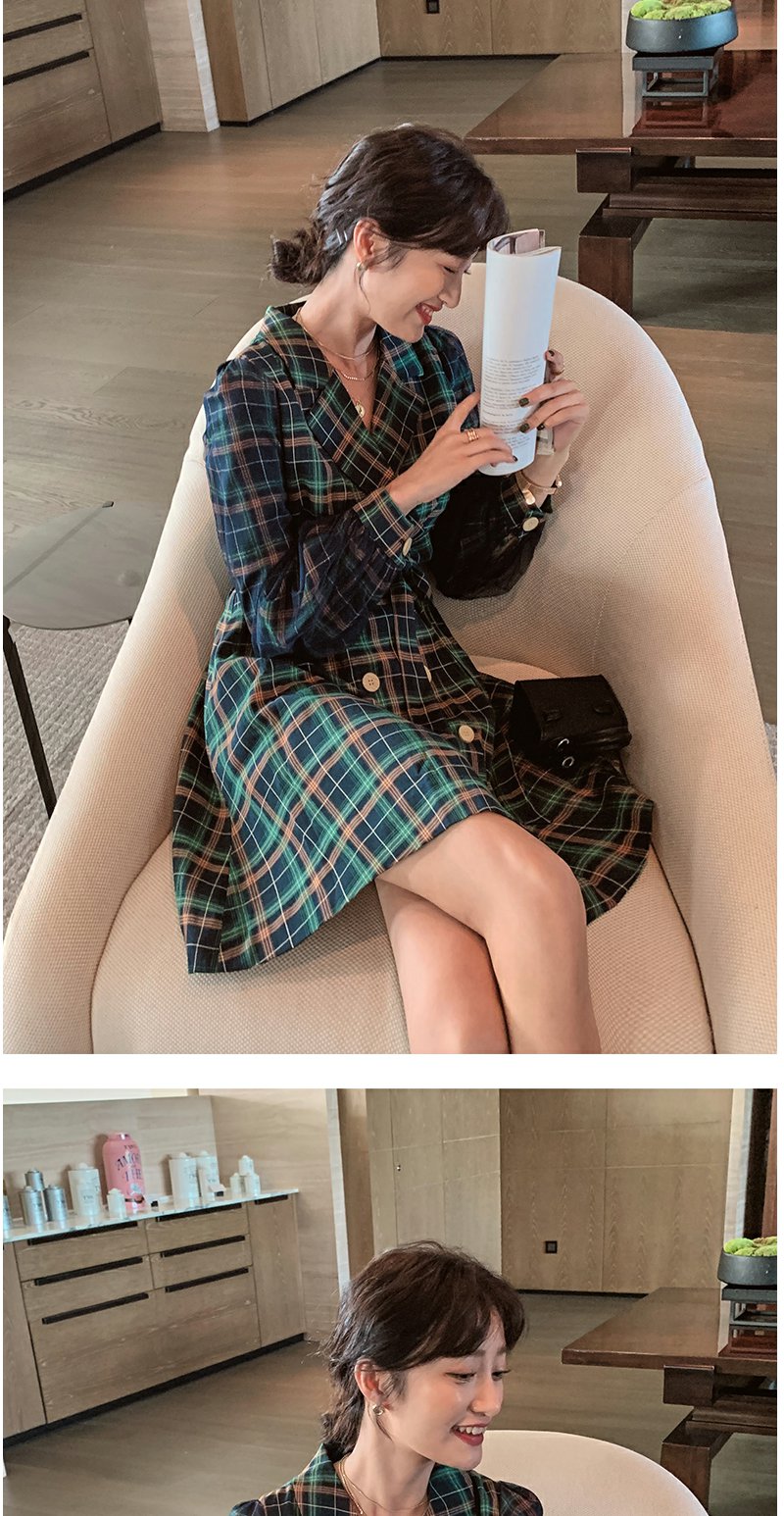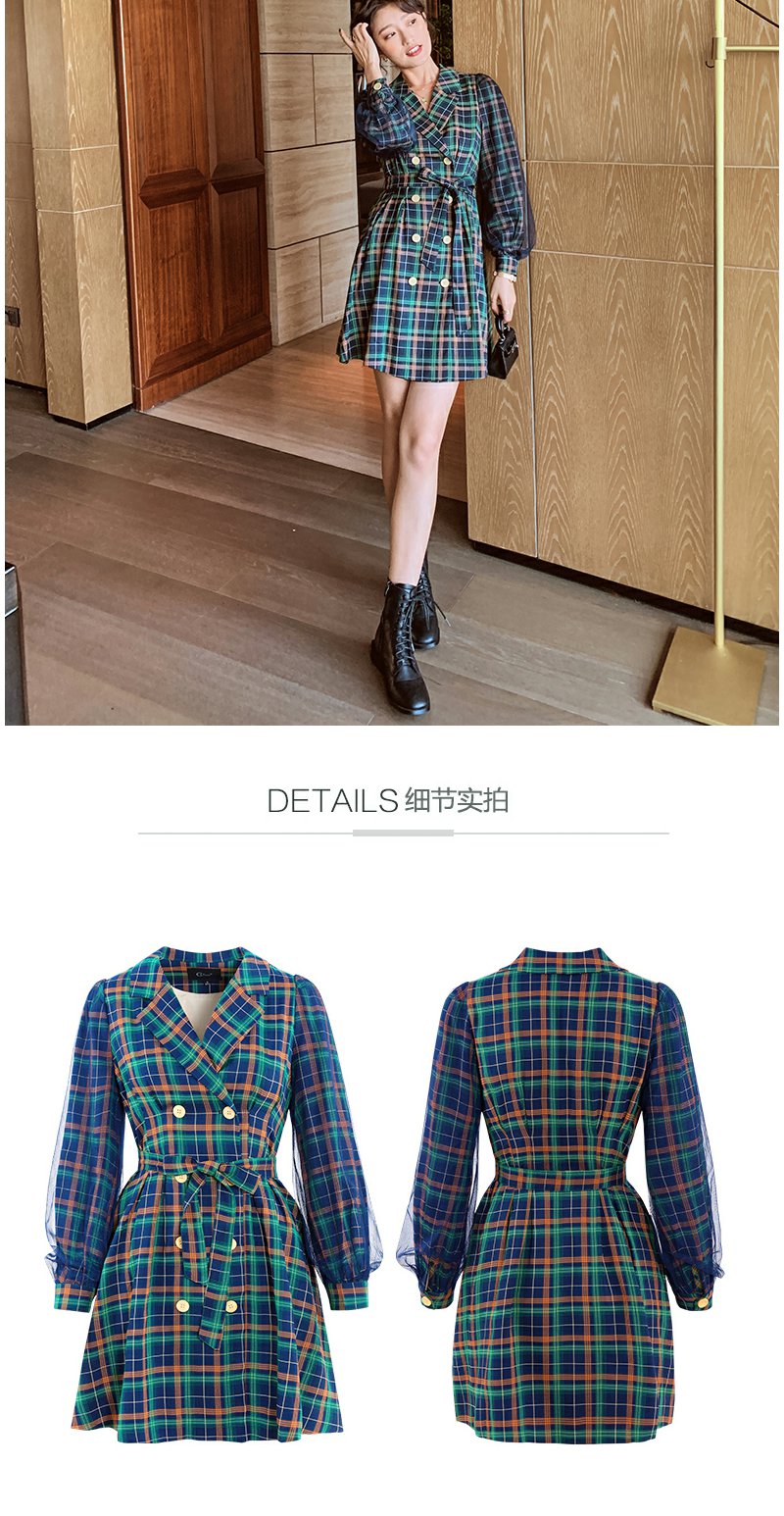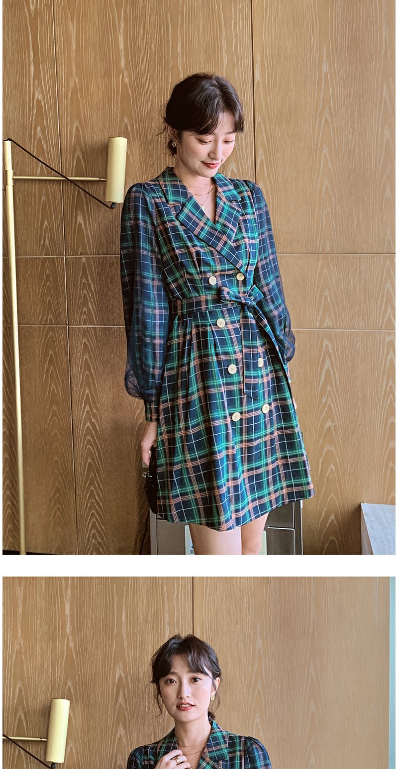 欧芮儿格子西领连衣裙女中长款早新品长袖收腰风衣型裙子