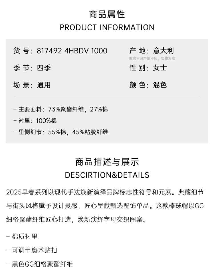 GUCCI 古驰 男士GG细格棒球帽 黑色 817492 4HBDV 1000