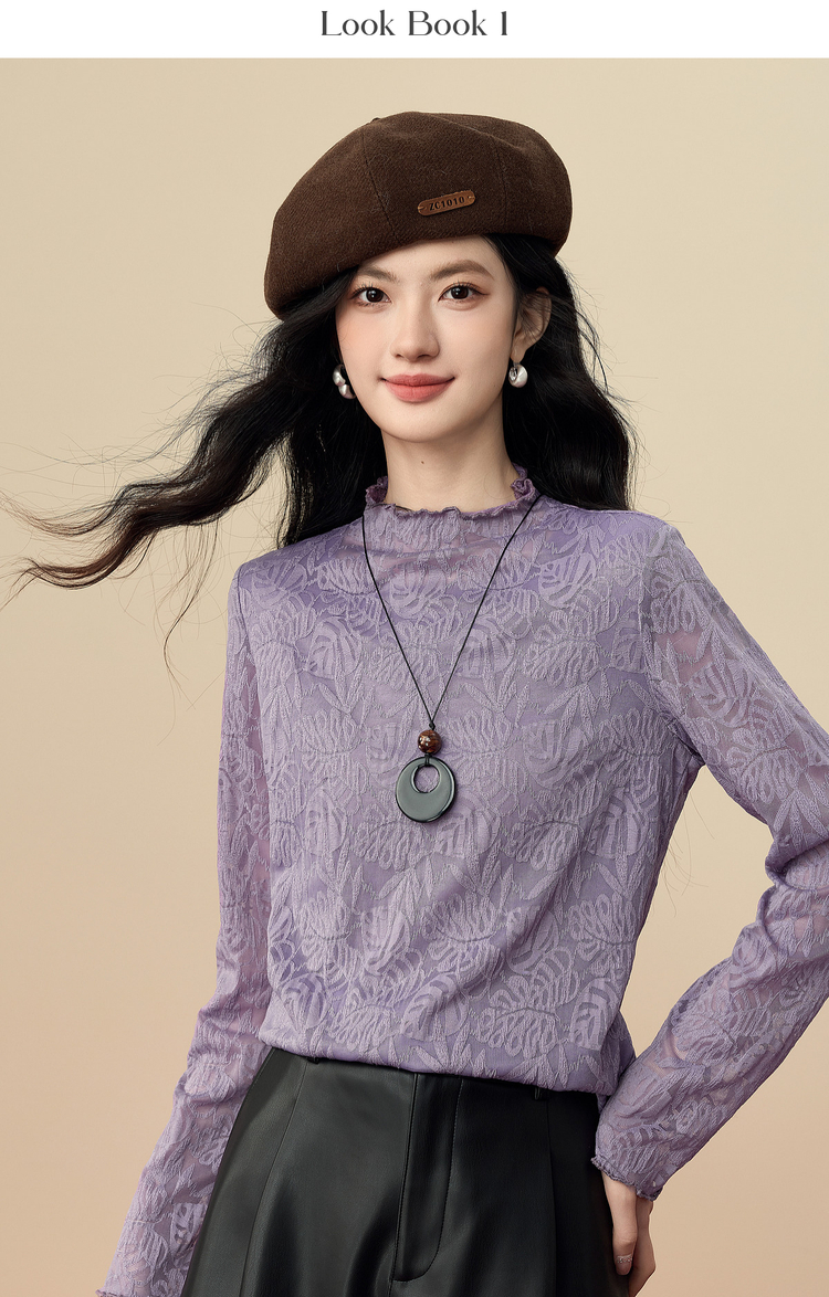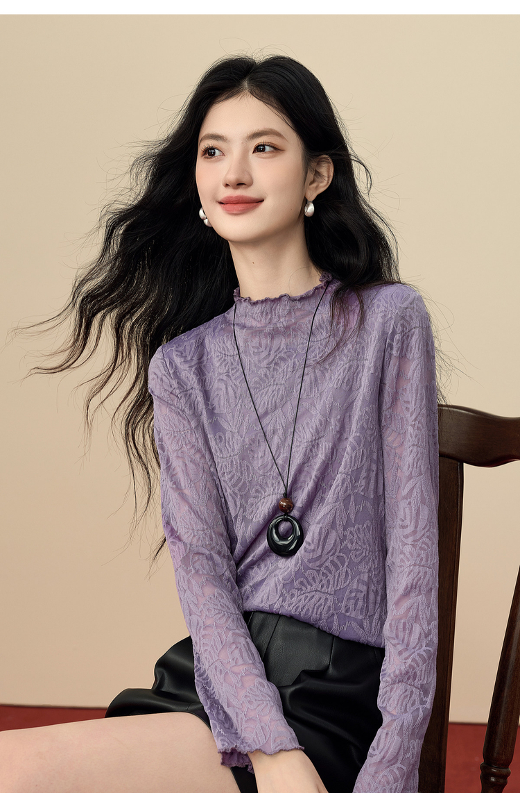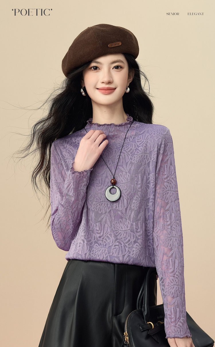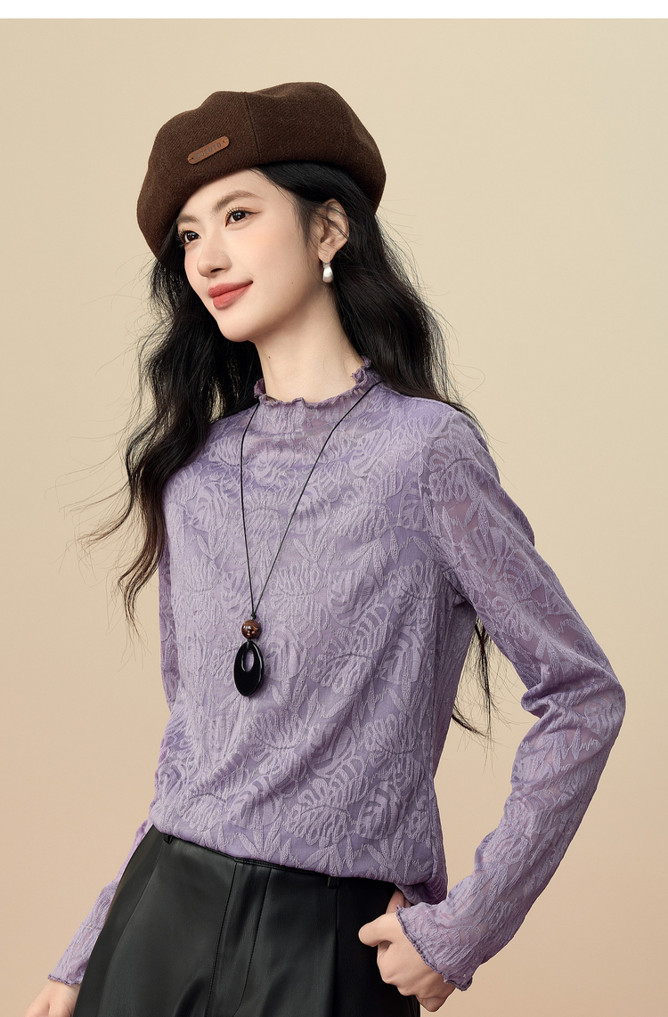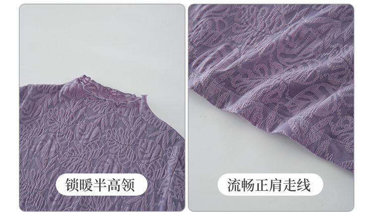 【12/17新品】熙世界绝美紫色蕾丝打底衫女秋冬法式提花长袖正肩半高领内搭上衣