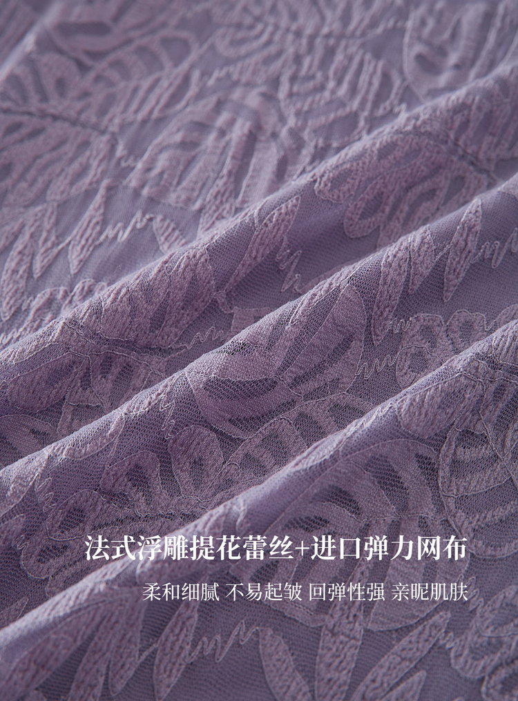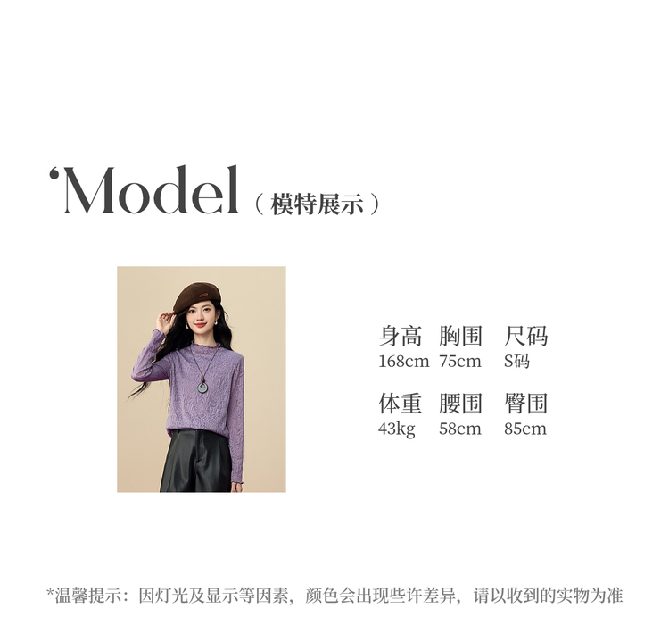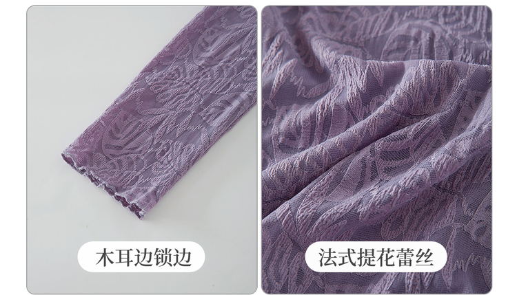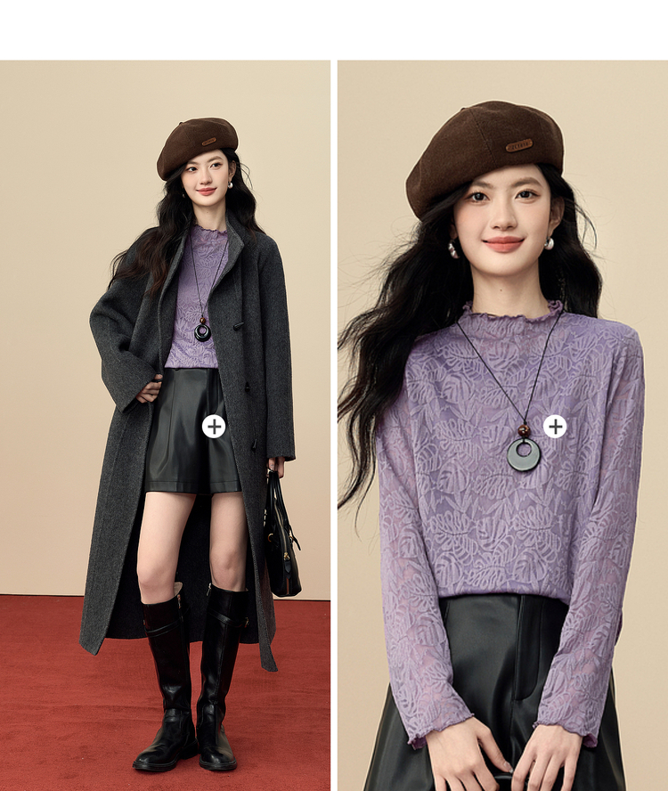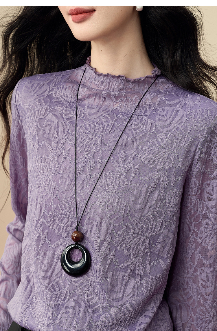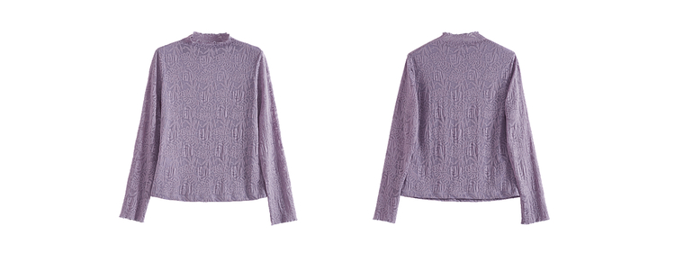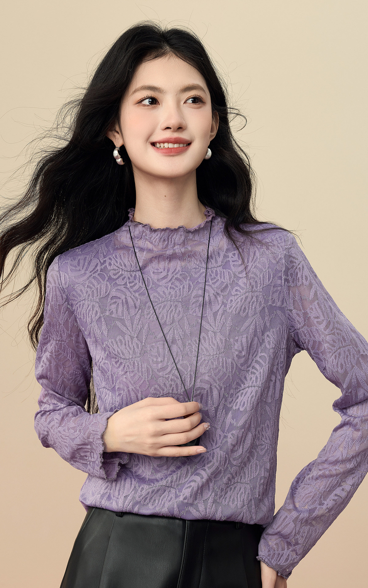 【12/17新品】熙世界绝美紫色蕾丝打底衫女秋冬法式提花长袖正肩半高领内搭上衣