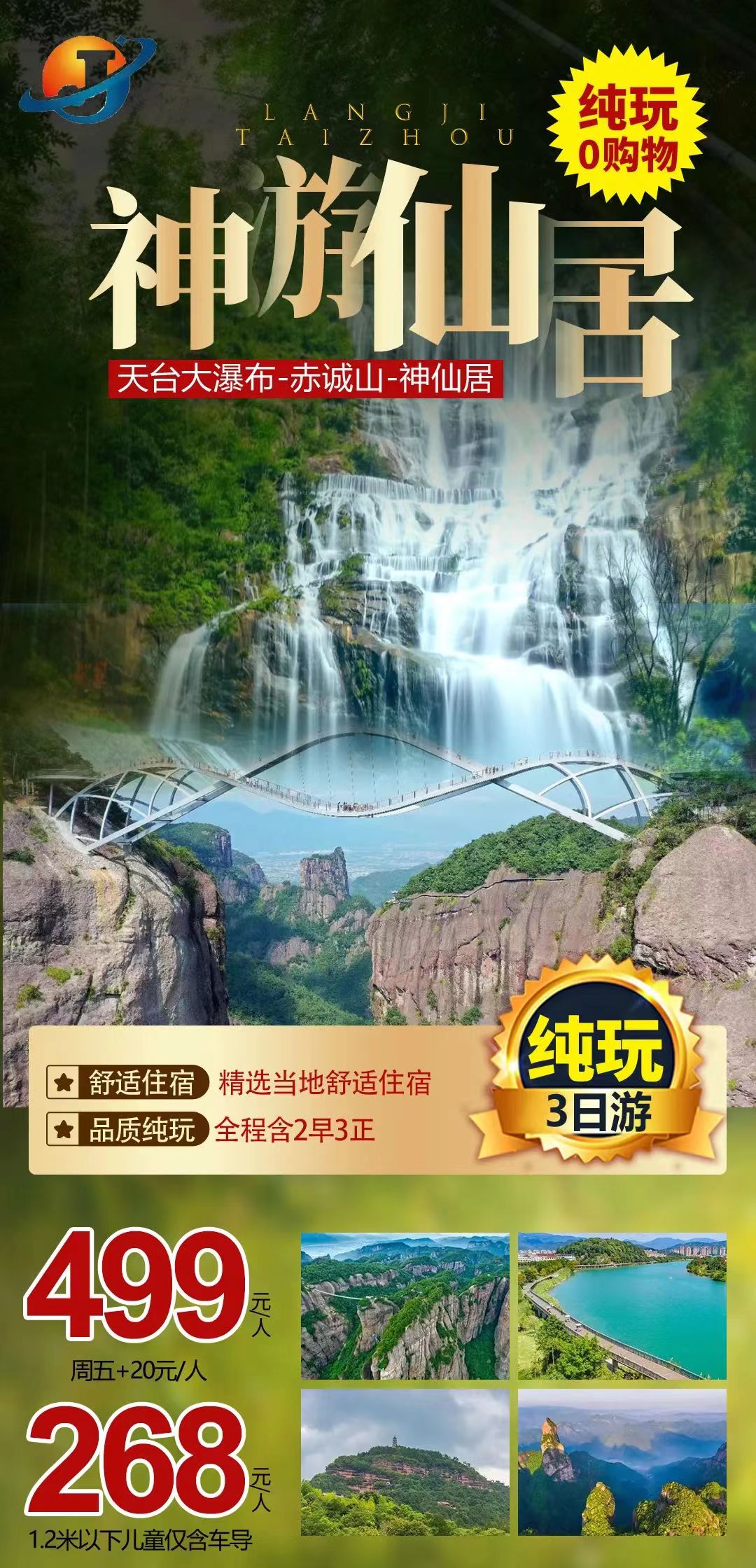 打卡神仙居:天台山大瀑布-丹霞赤城山-仙居绿道;品质纯玩2早3正修仙三日游!