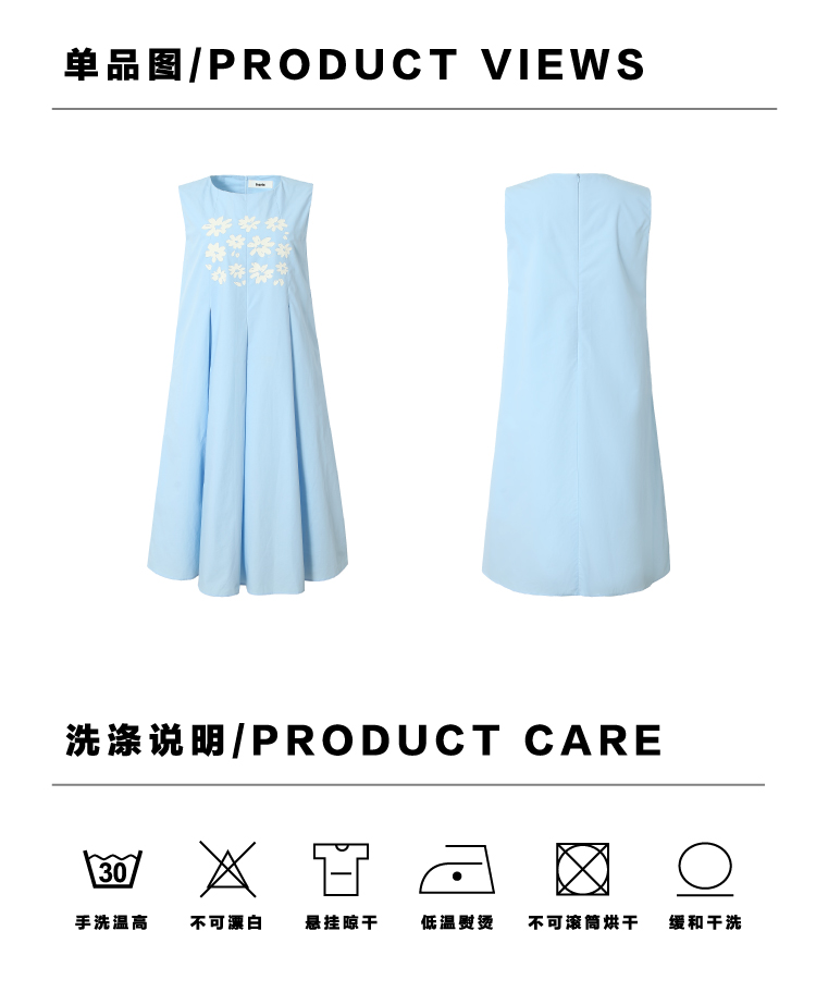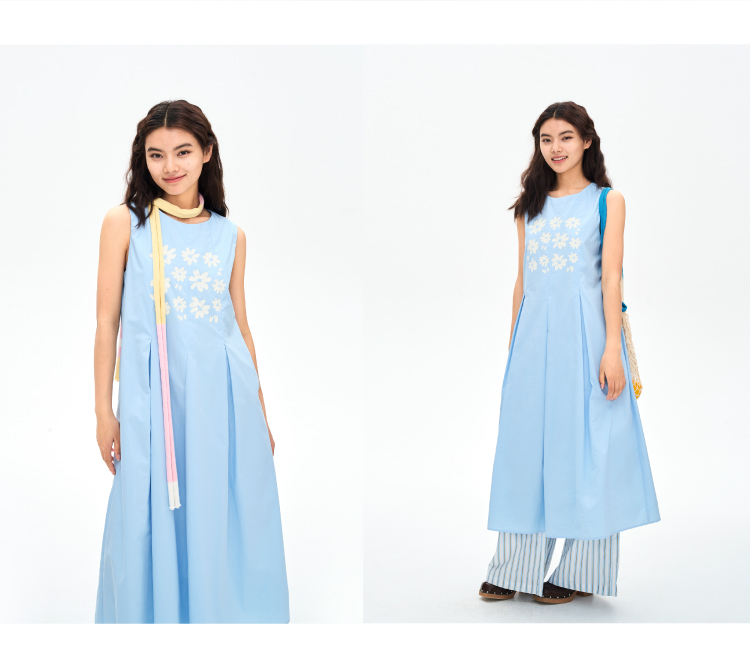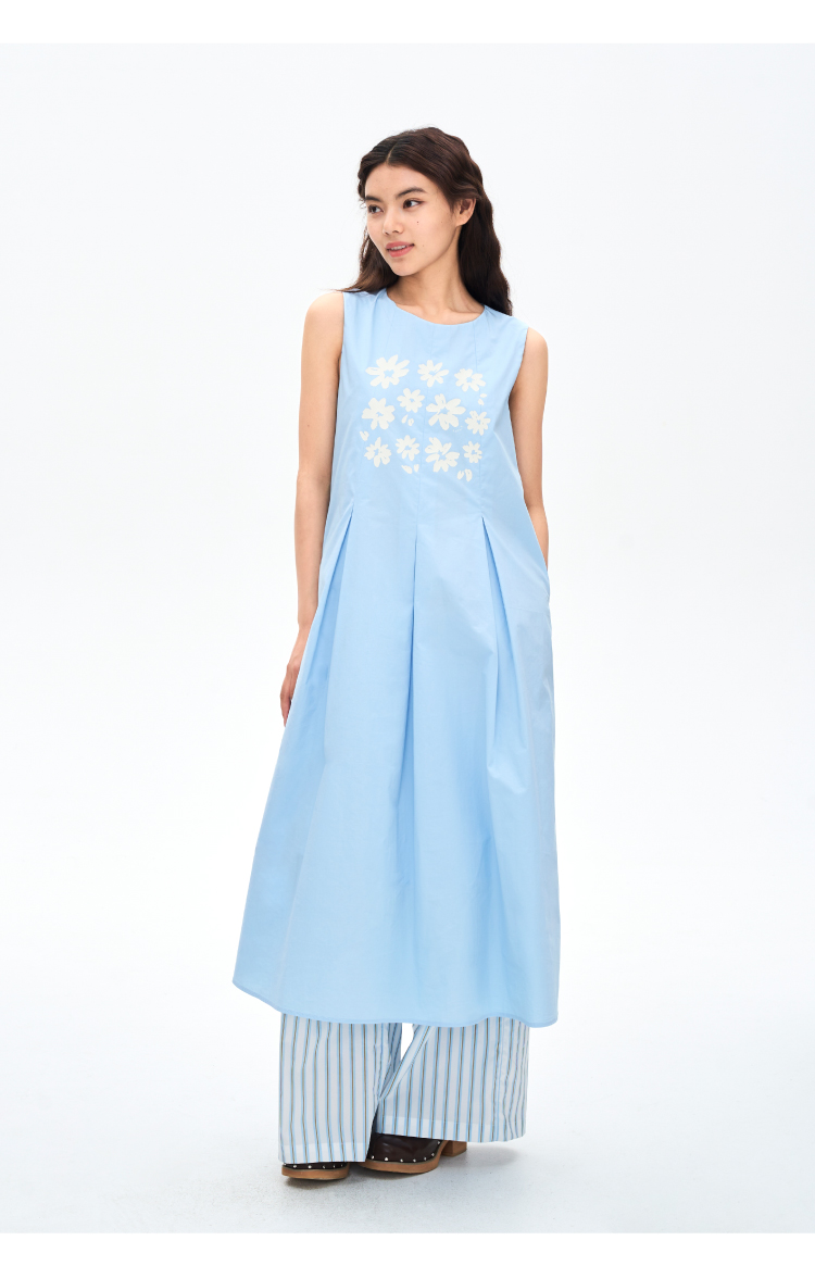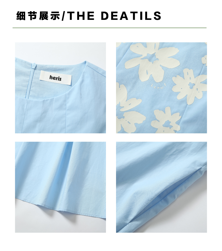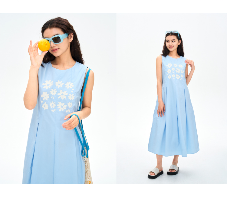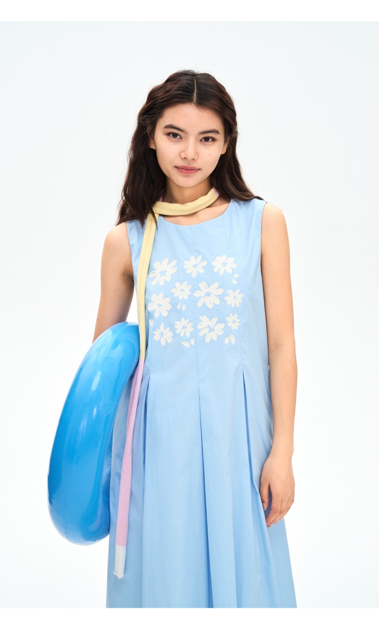 heris/H42107/冰蓝花朵印花 学院百褶A摆气质 圆领宽松无袖连衣裙